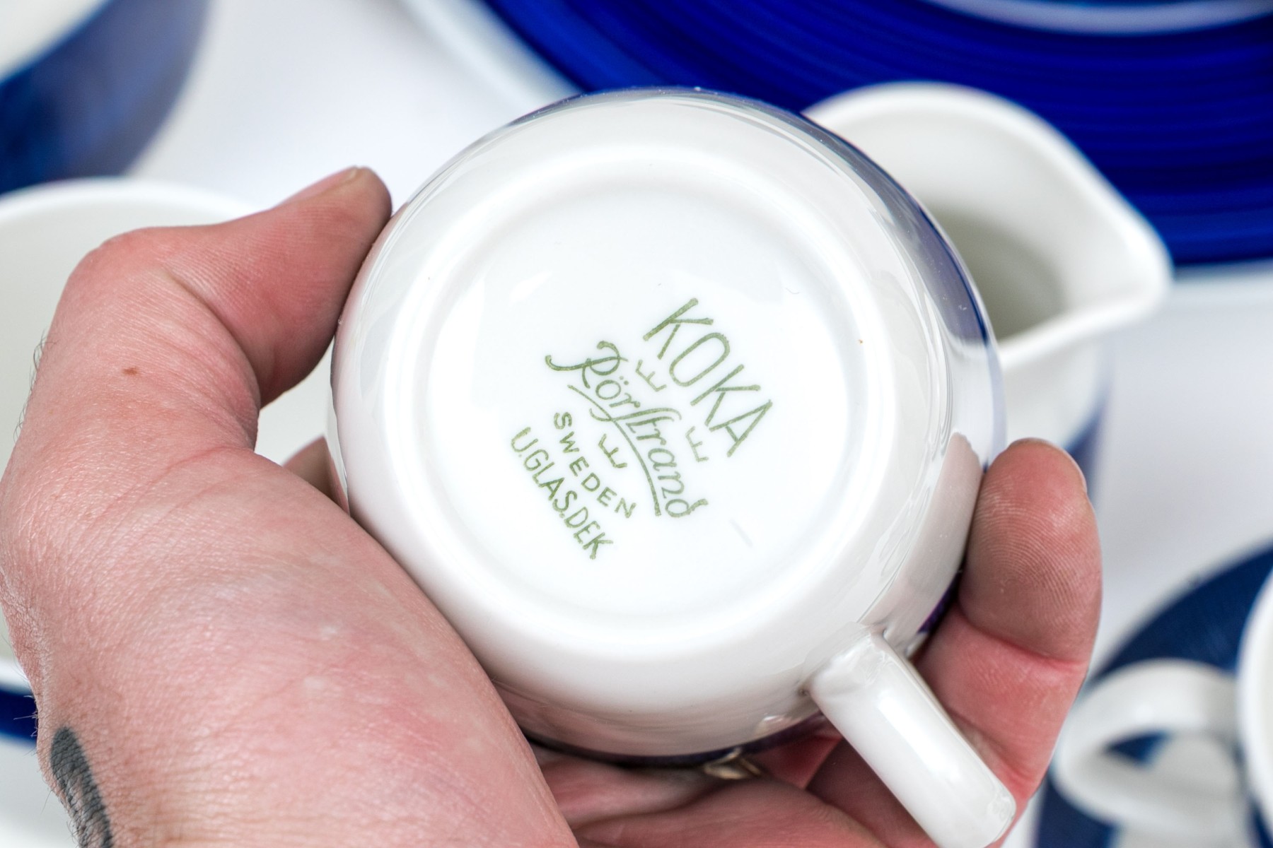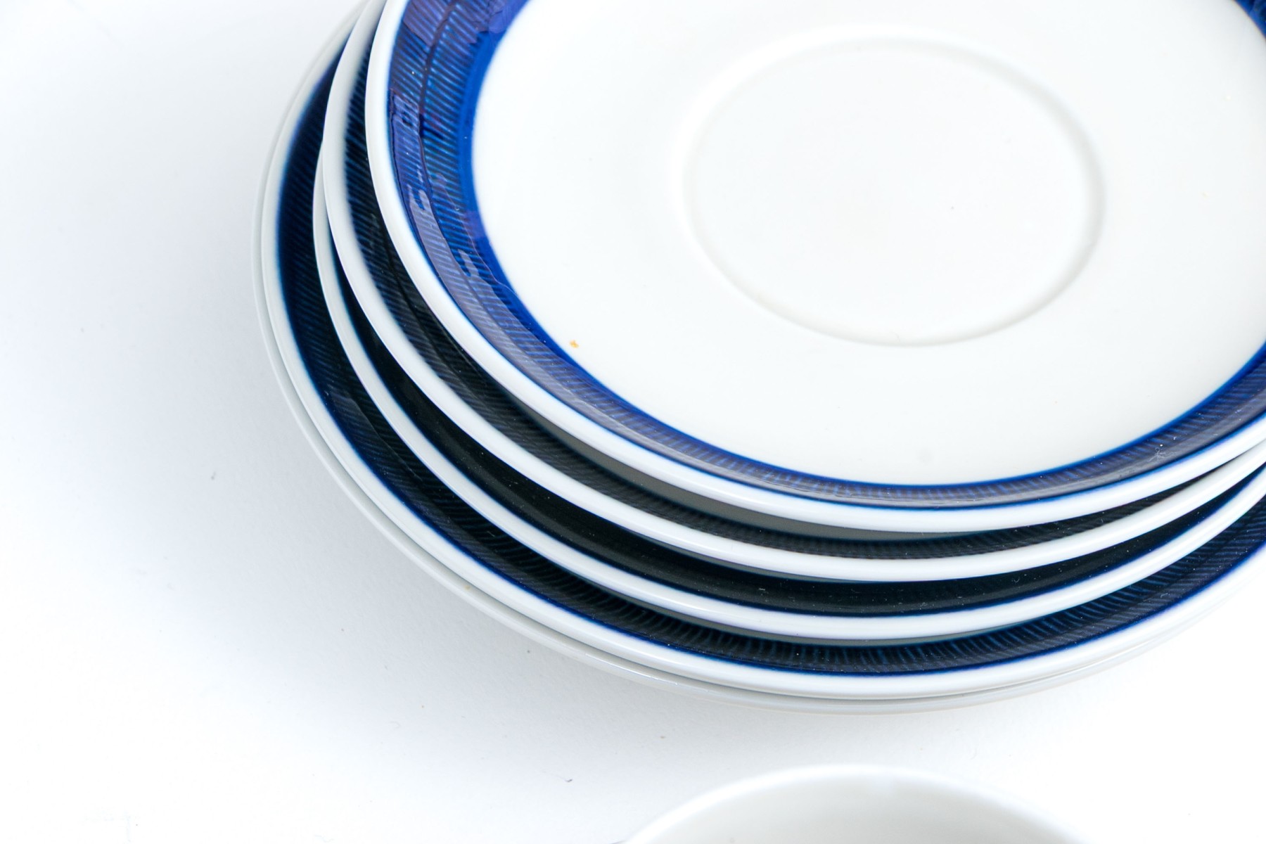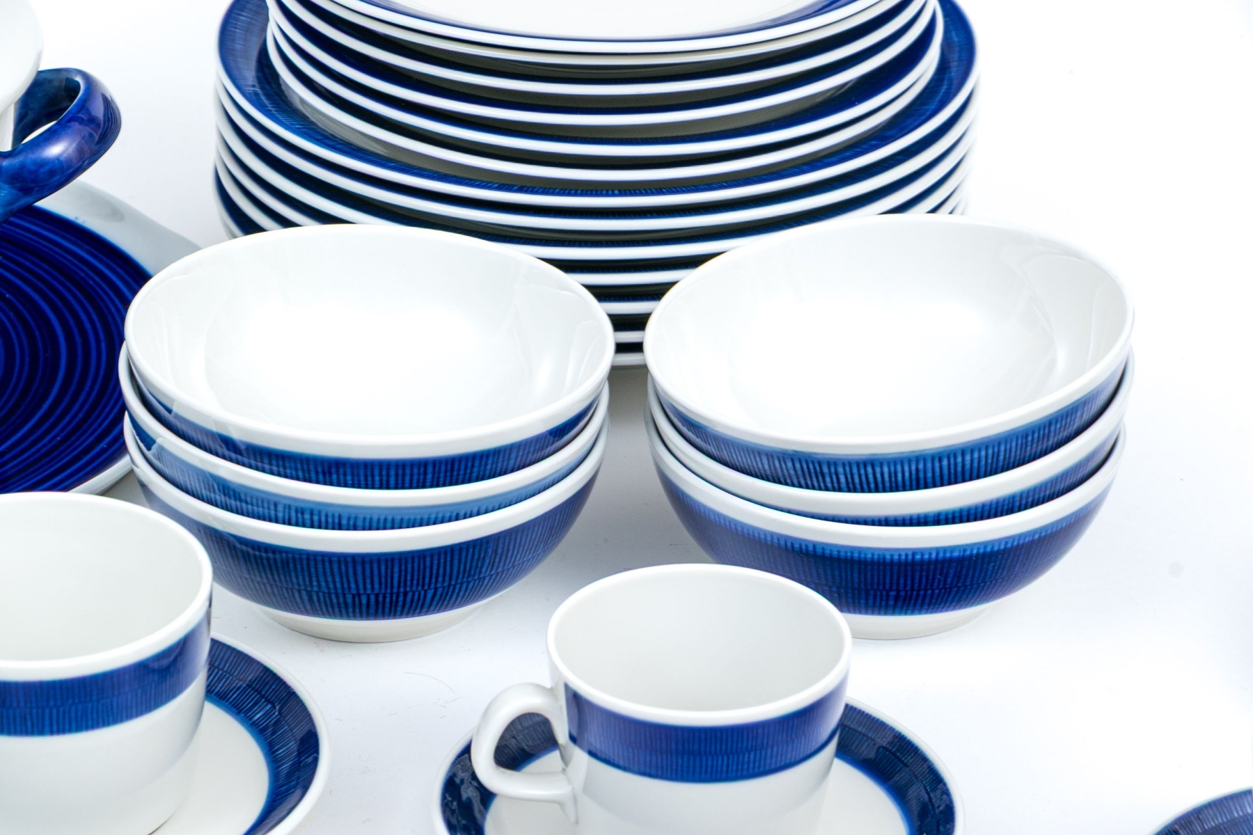 A lovely Hertha Bengtsson for Rörstrand "Koka Blå" ceramic dining service featuring bright white bodies and striking textural blue glazed decoration with oblong leaf motifs.