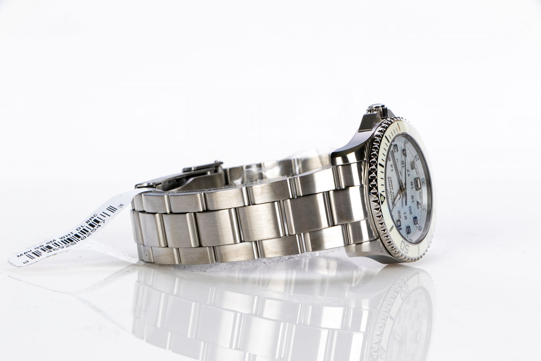 Swiss Army Victorinox quartz watch 'Maverick' edition (249051). This Victorinox 'Maverick' edition quartz watch features a white dial with Arabic numerals framed in a rotating cream colored bezel. The hour and minute hands luminesces for easy reading. Stainless steel bracelet with fold over safety clasp, date calendar and water resistant to about 100 meters. Comes with original box and papers. Retail tag lists price as $495.00.