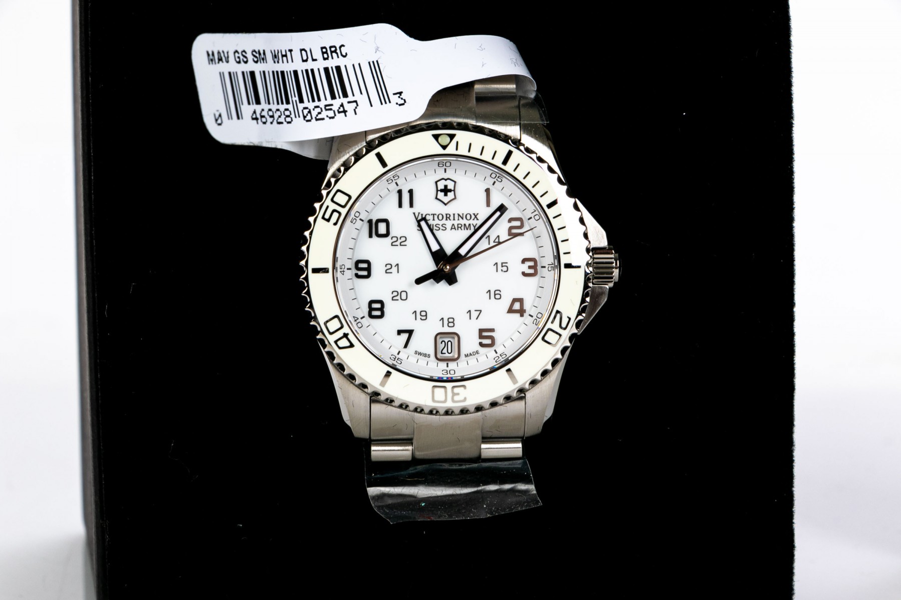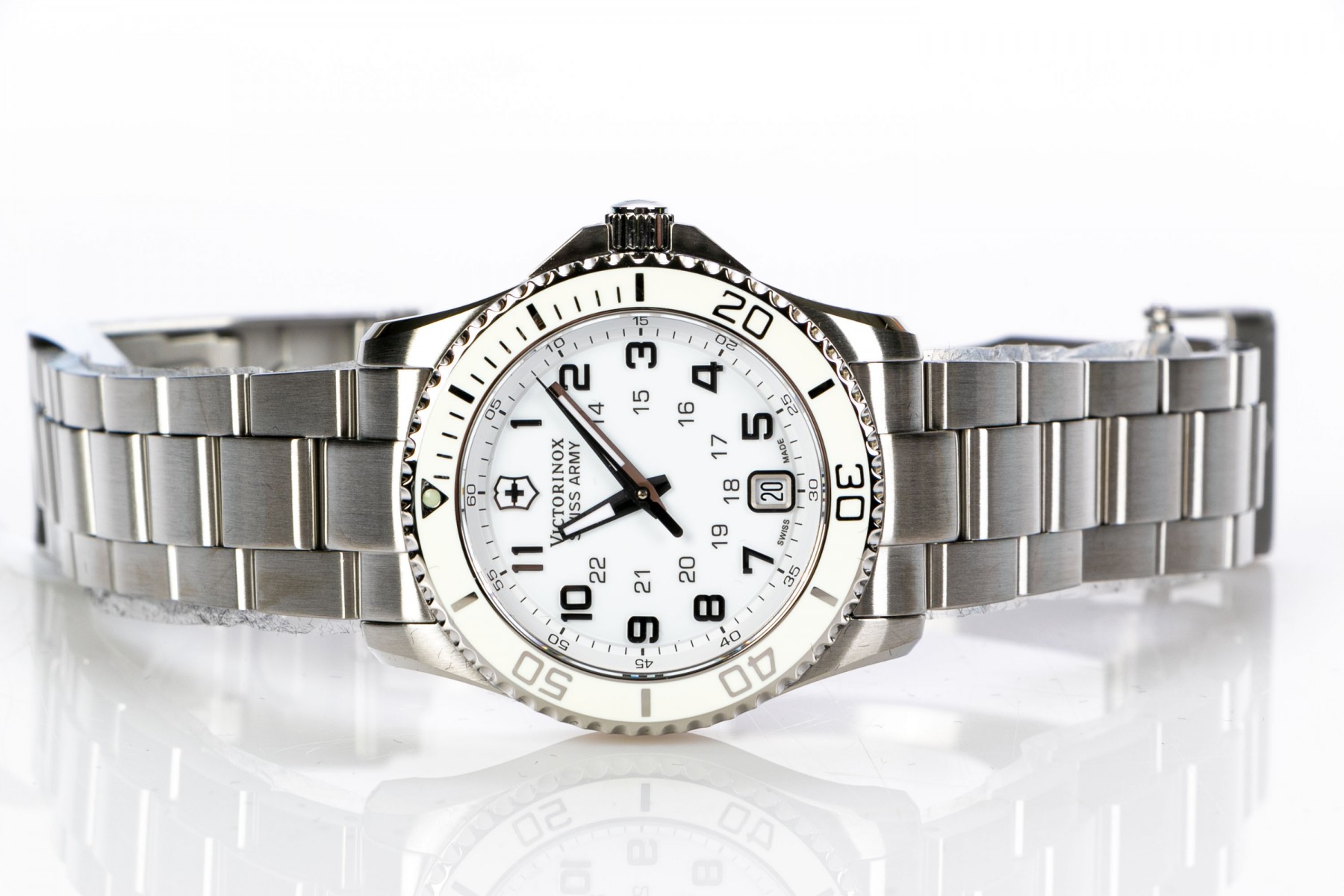 Swiss Army Victorinox quartz watch 'Maverick' edition (249051). This Victorinox 'Maverick' edition quartz watch features a white dial with Arabic numerals framed in a rotating cream colored bezel. The hour and minute hands luminesces for easy reading. Stainless steel bracelet with fold over safety clasp, date calendar and water resistant to about 100 meters. Comes with original box and papers. Retail tag lists price as $495.00.