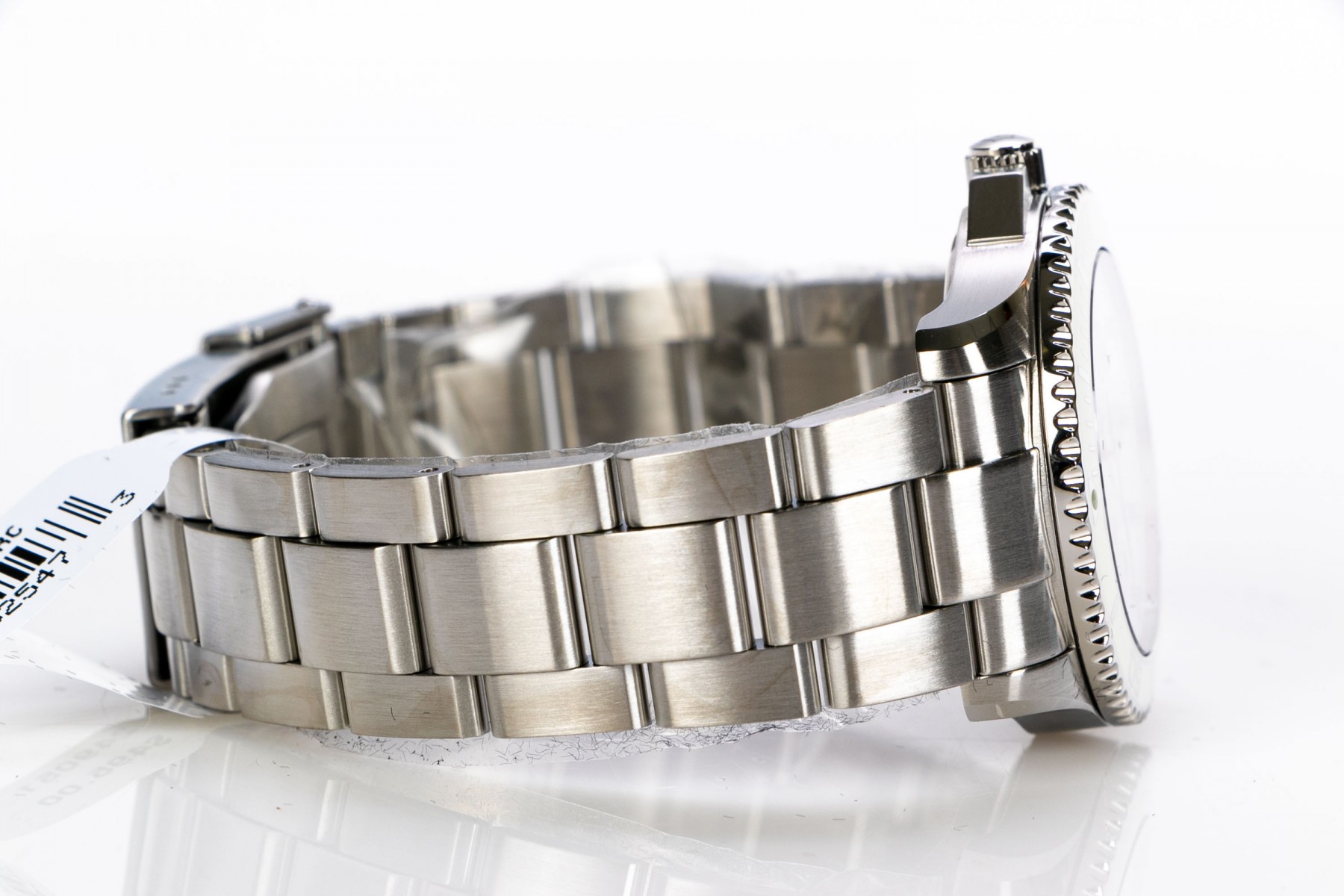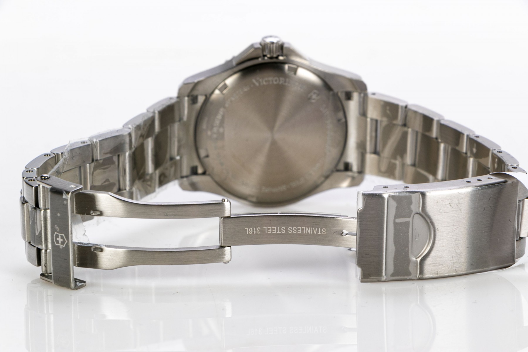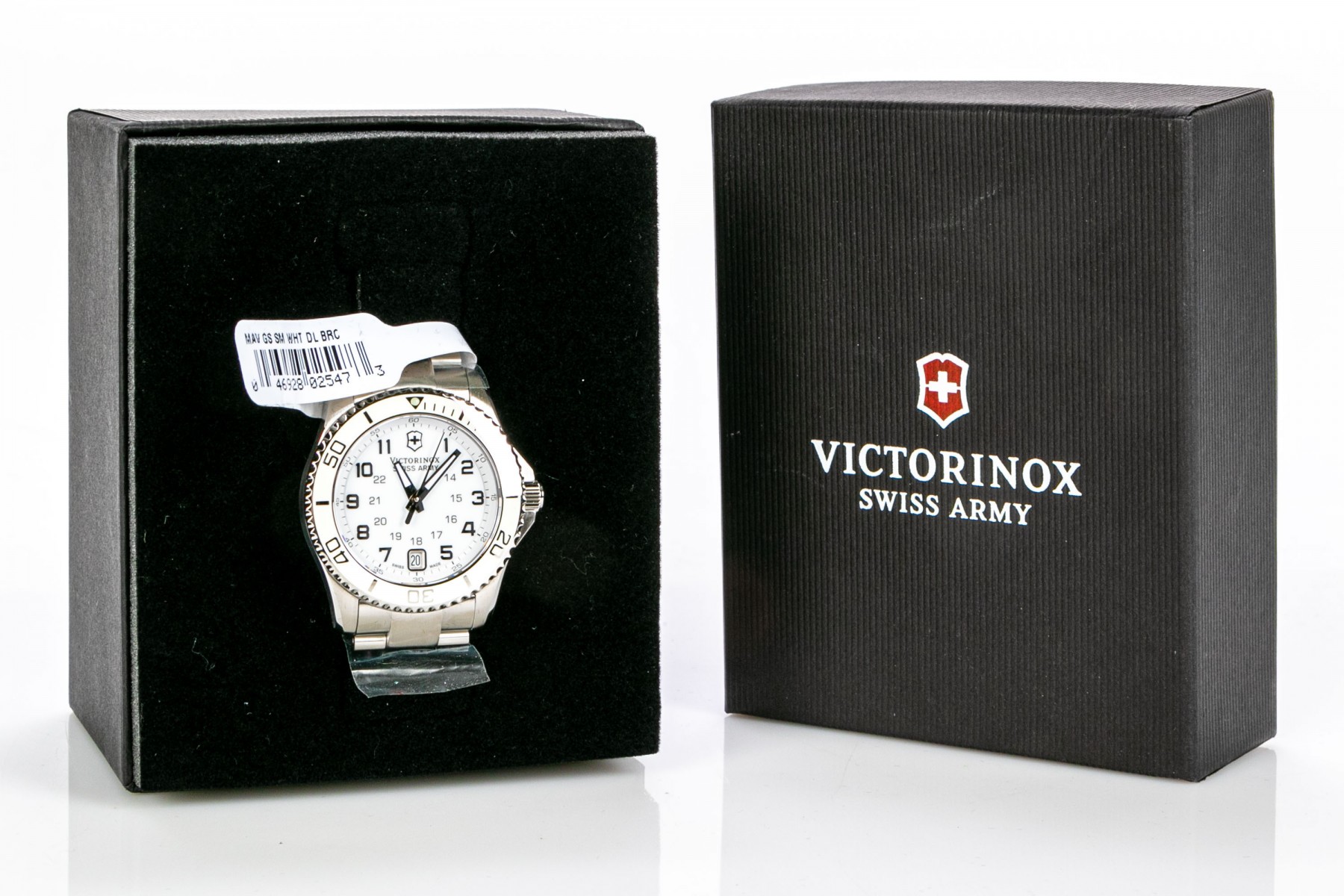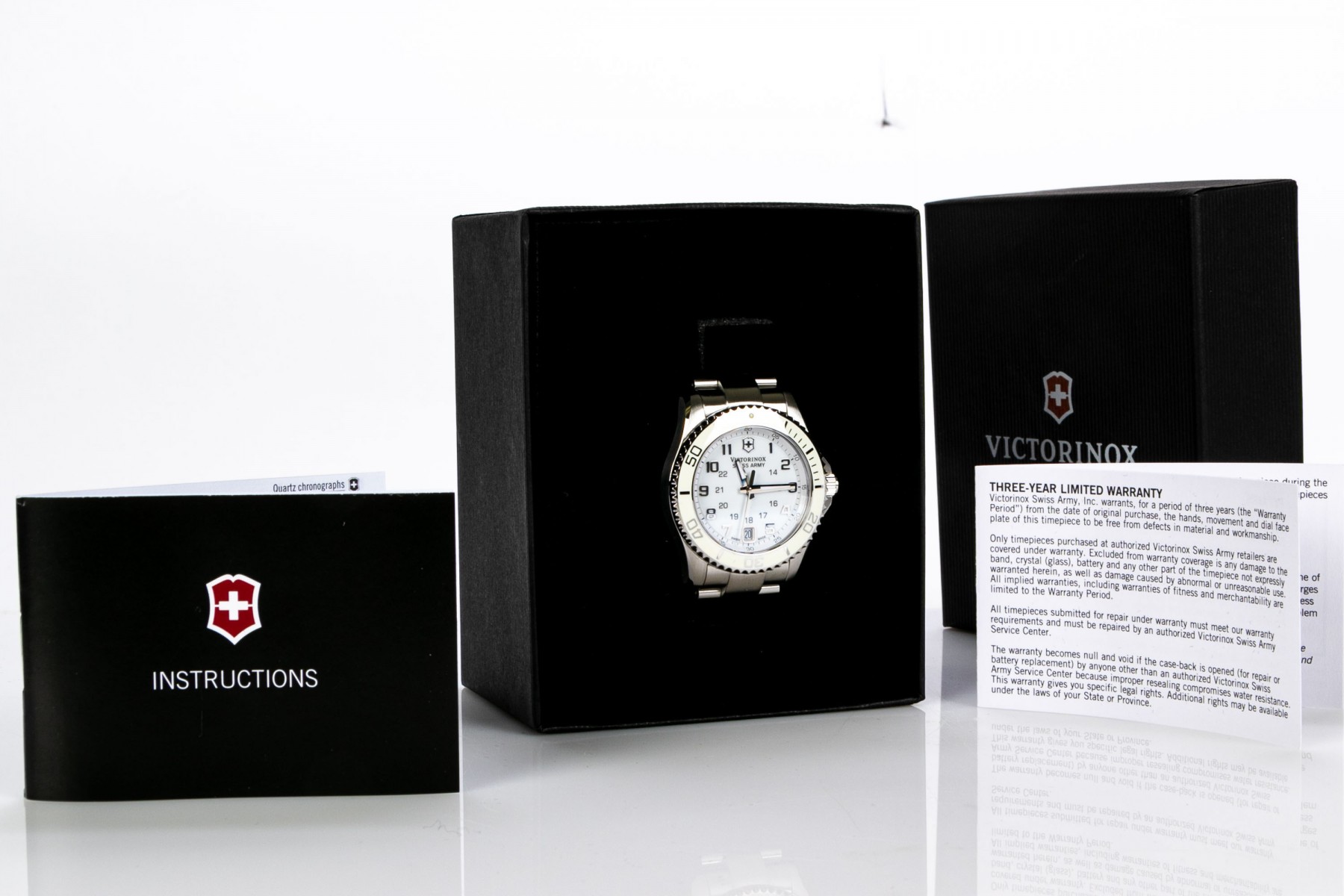 Swiss Army Victorinox quartz watch 'Maverick' edition (249051). This Victorinox 'Maverick' edition quartz watch features a white dial with Arabic numerals framed in a rotating cream colored bezel. The hour and minute hands luminesces for easy reading. Stainless steel bracelet with fold over safety clasp, date calendar and water resistant to about 100 meters. Comes with original box and papers. Retail tag lists price as $495.00.
