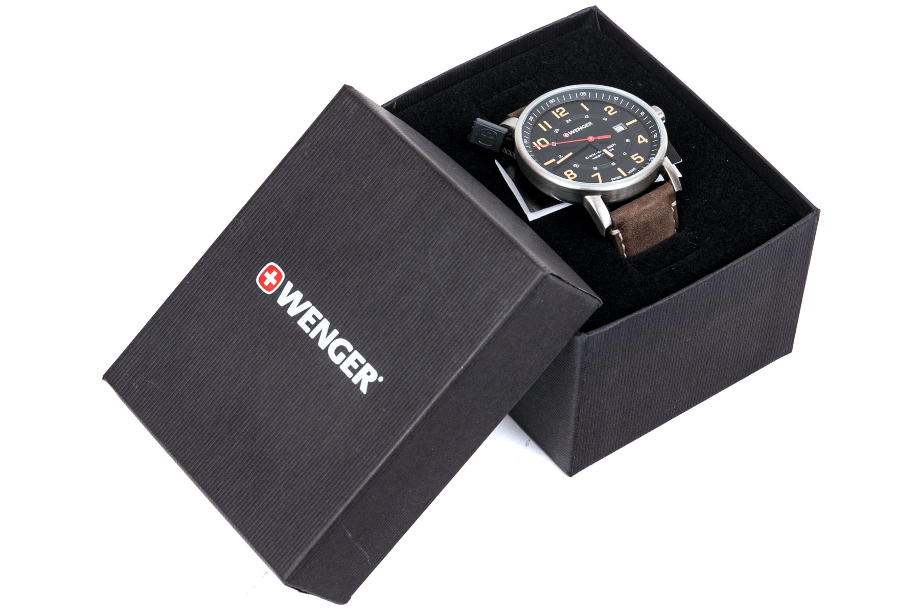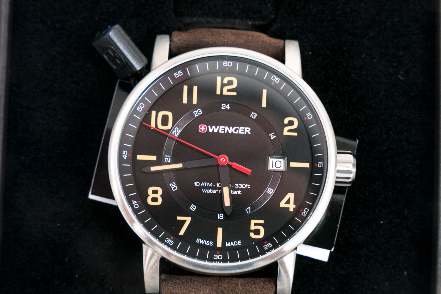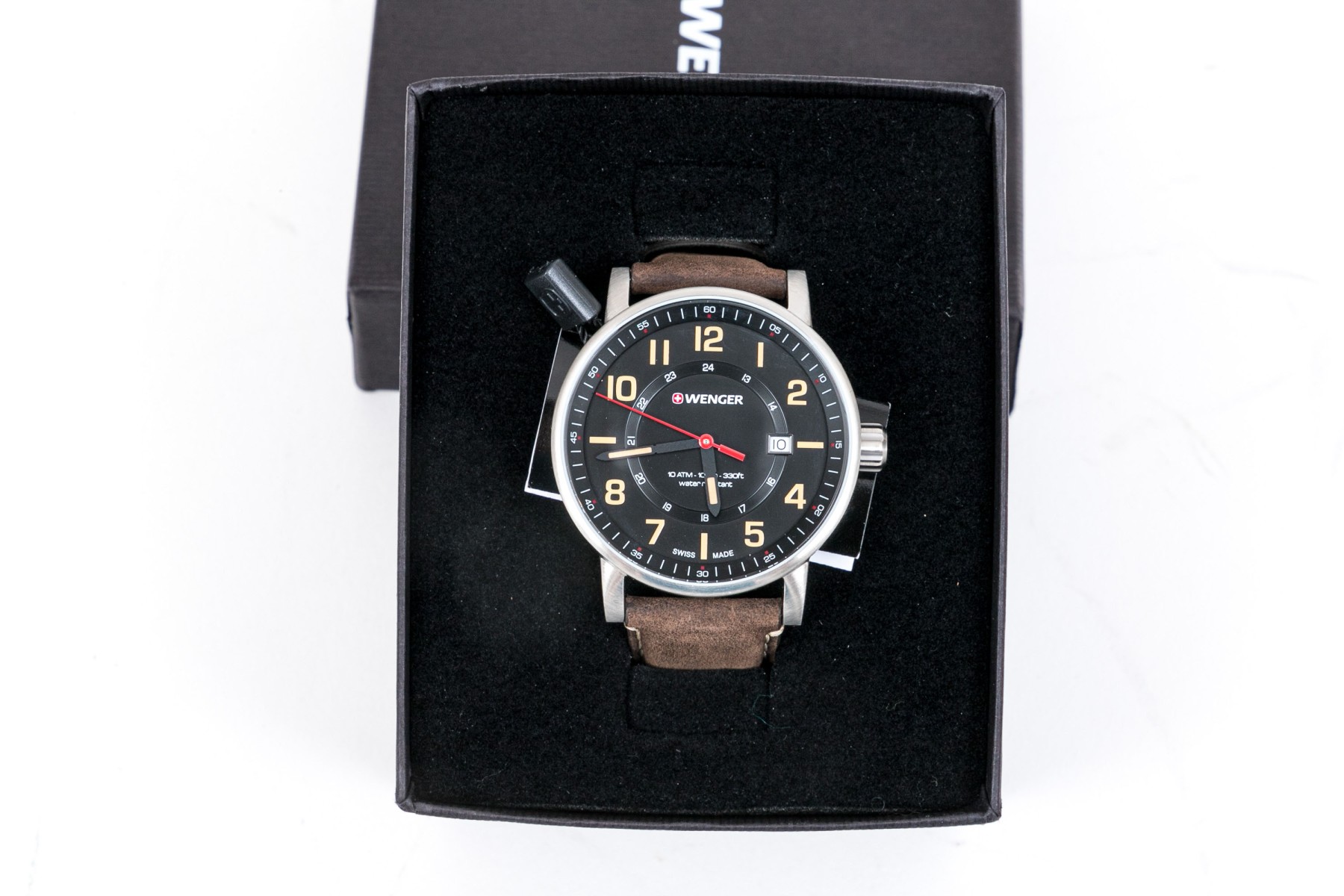 Swiss Army Wenger quartz watch (01.0341.108). This watch has a black dial with luminesces Arabic numerals and stick indices. The hour and minute hands are also luminance for easy reading. Date calendar, brown leather bracelet with buckle clasp, and water resistant to 100 meters. Comes in original box. Retail tag lists price as $185.00.