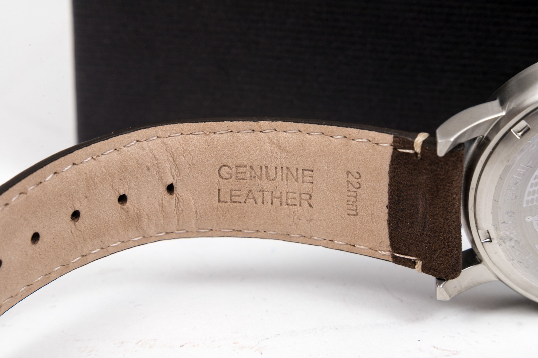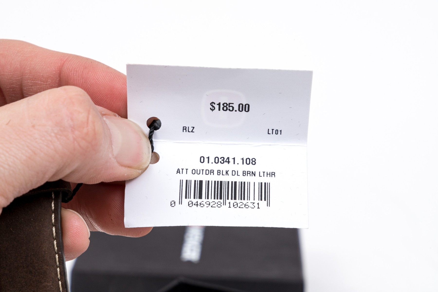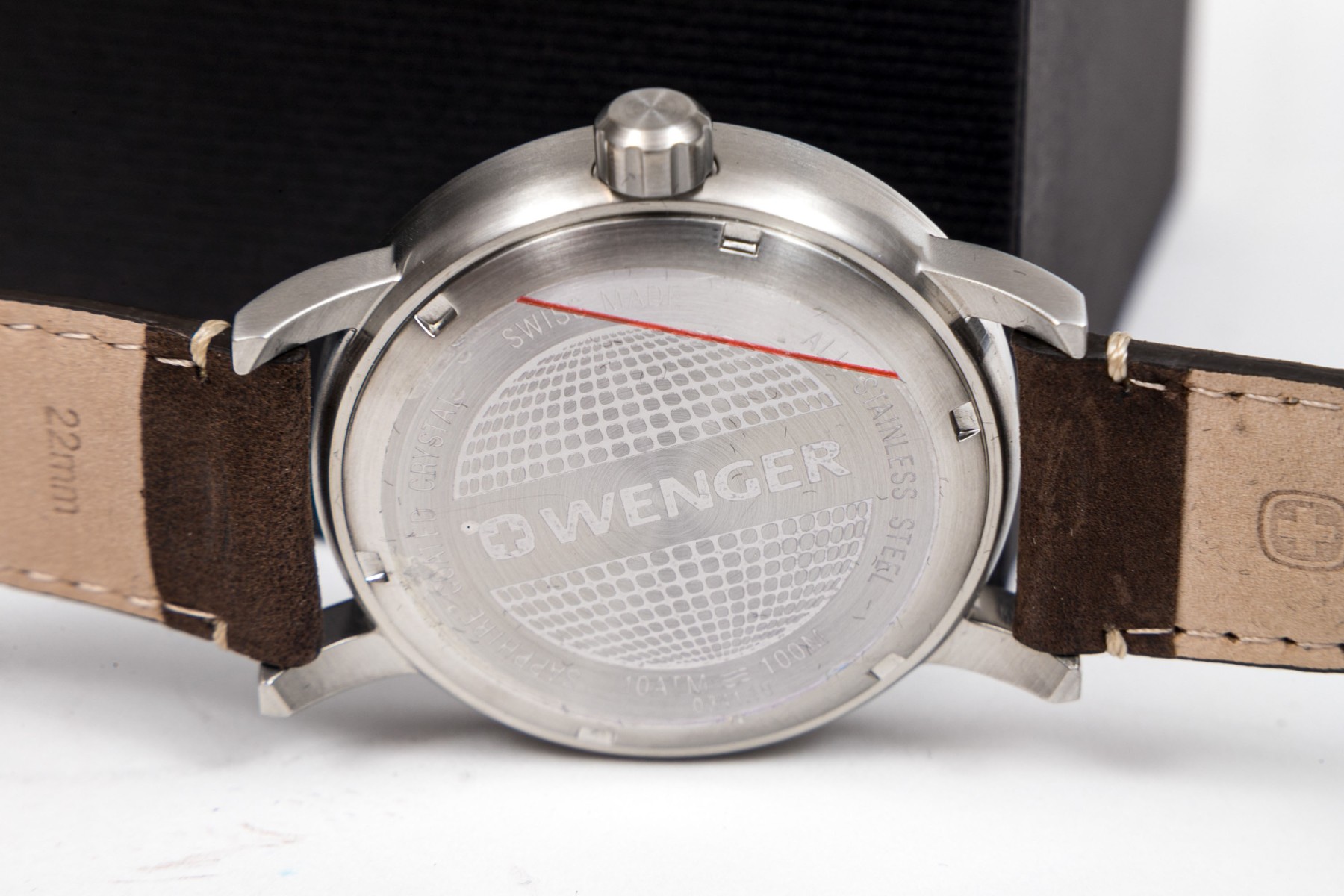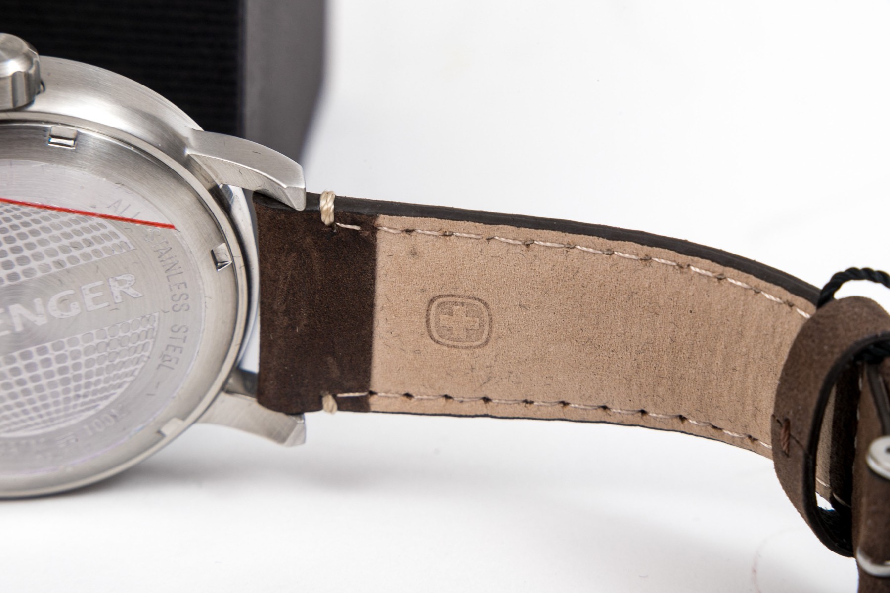 Swiss Army Wenger quartz watch (01.0341.108). This watch has a black dial with luminesces Arabic numerals and stick indices. The hour and minute hands are also luminance for easy reading. Date calendar, brown leather bracelet with buckle clasp, and water resistant to 100 meters. Comes in original box. Retail tag lists price as $185.00.