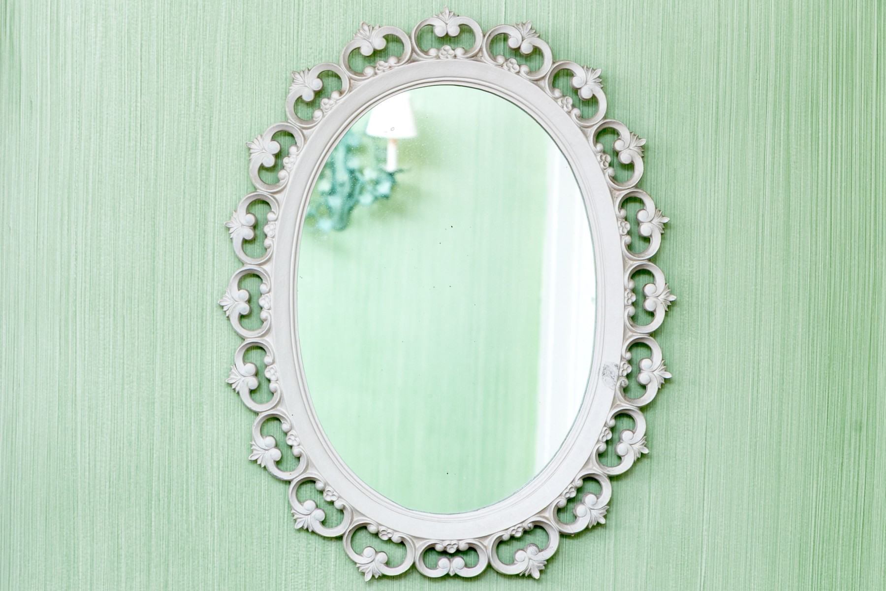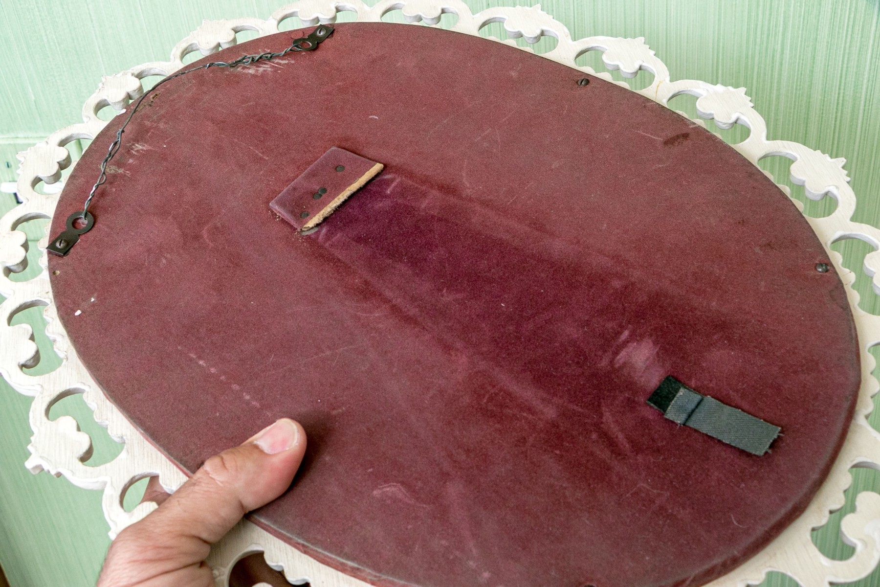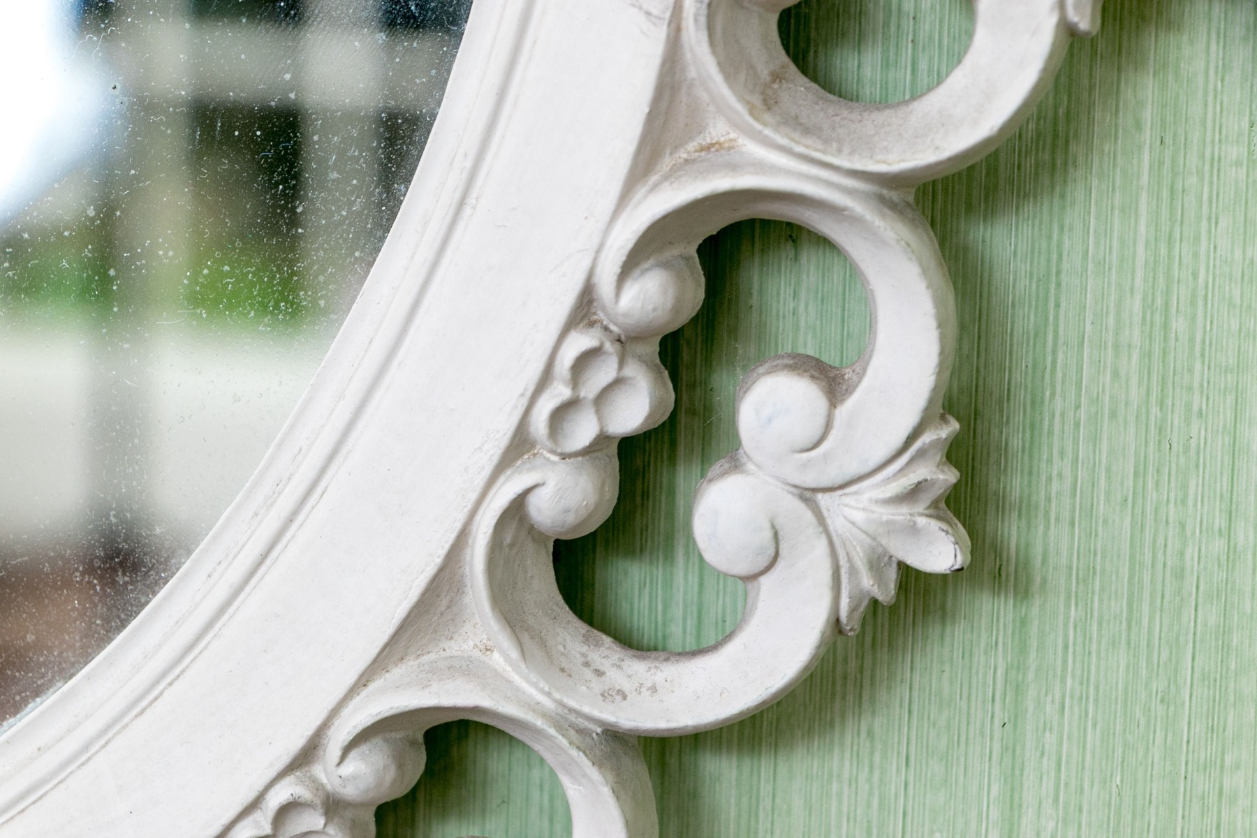 A charming Syroco oval mirror in a carved openwork frame with elegant scrolled palmier motifs around a beveled trim, painted in lovely rustic white.