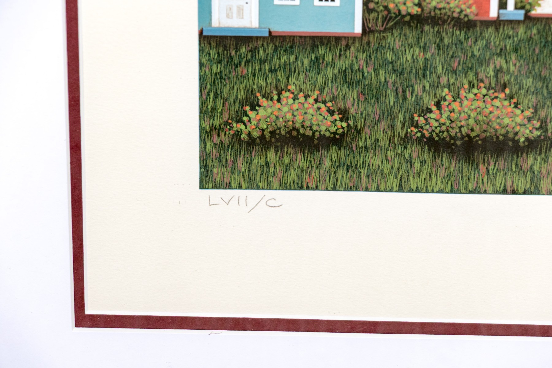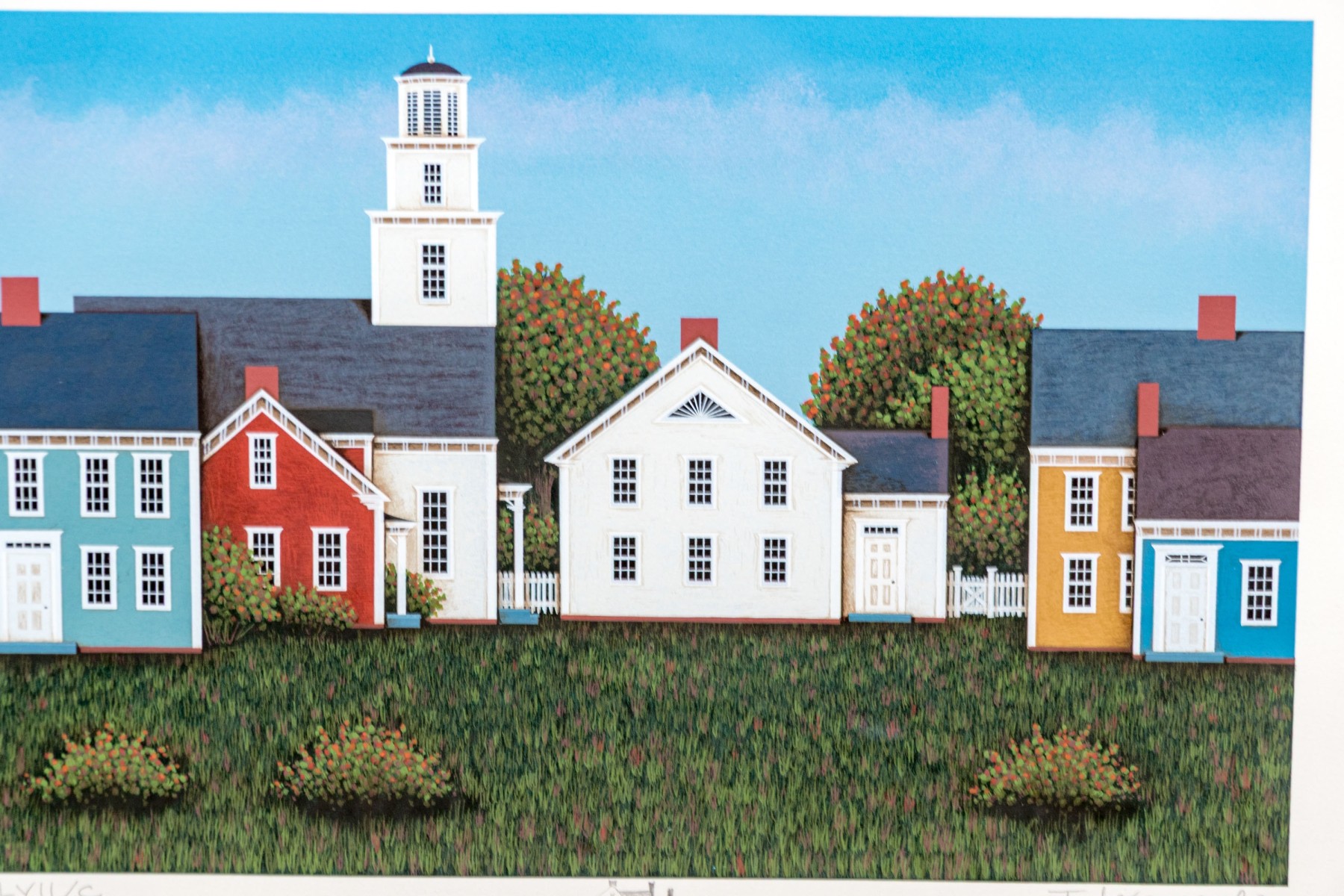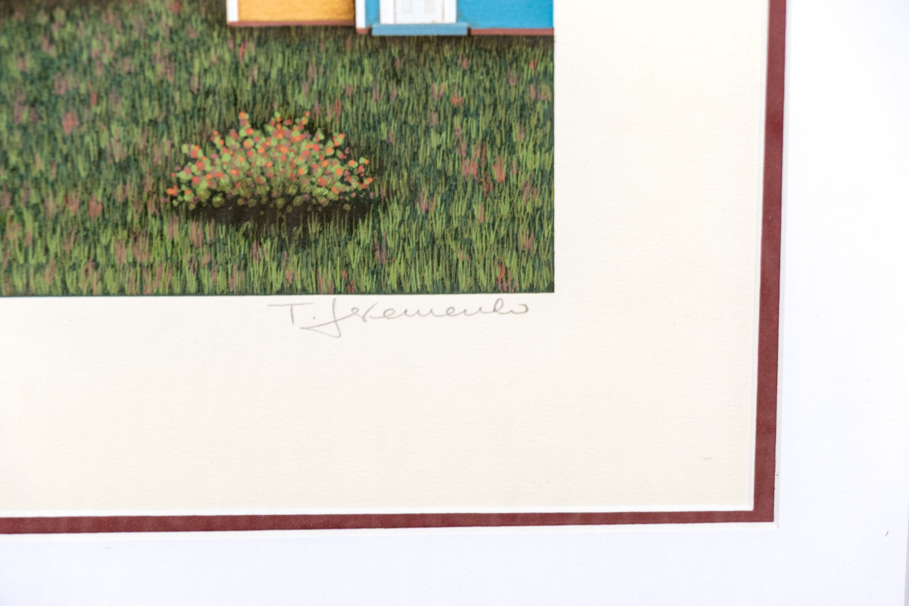 T. Jeremenko limited edition serigraph on paper. Vibrant colors depicting the facades of rural town structures, one with a tower. Green grass in the front with green trees in the background. Pencil numbered LVII/C out of plate lower left, and pencil signed lower right out of plate, along with a pencil drawn remarque depicting a cottage to the lower center out of plate.