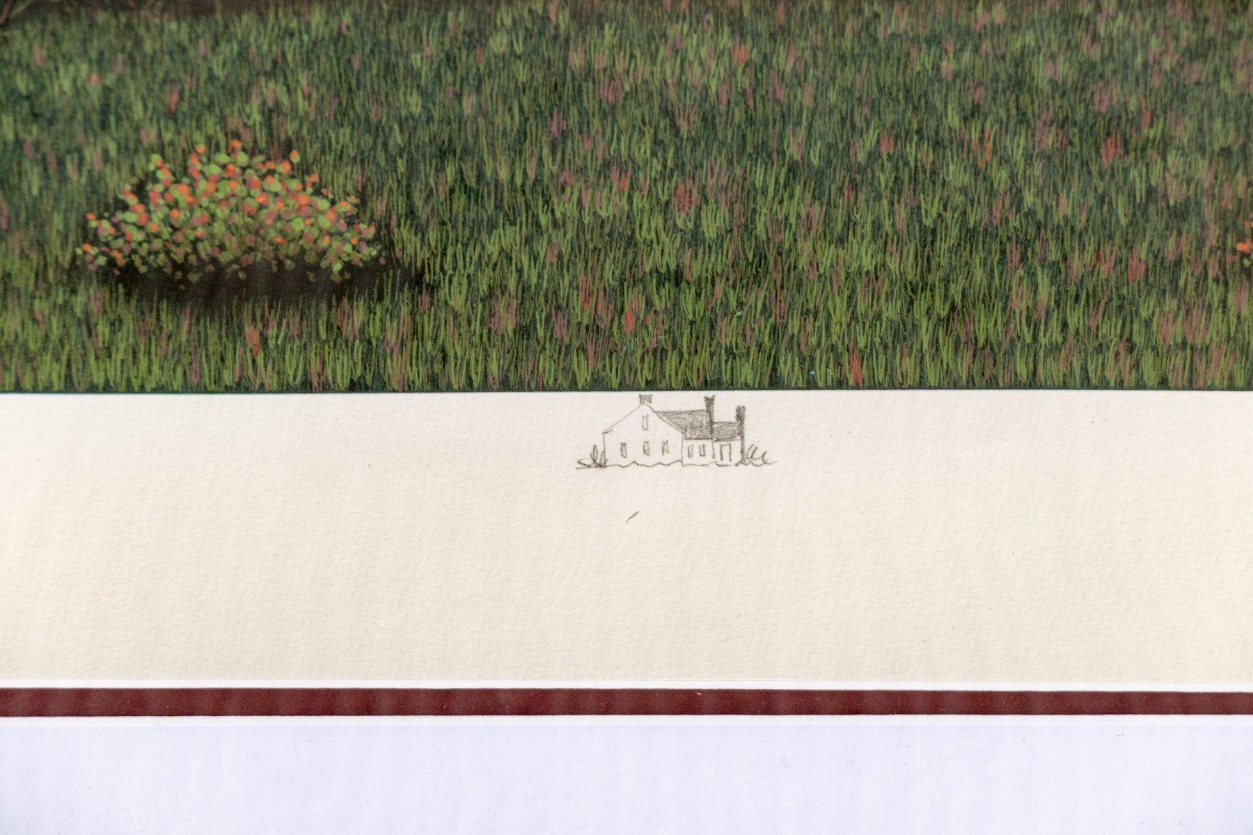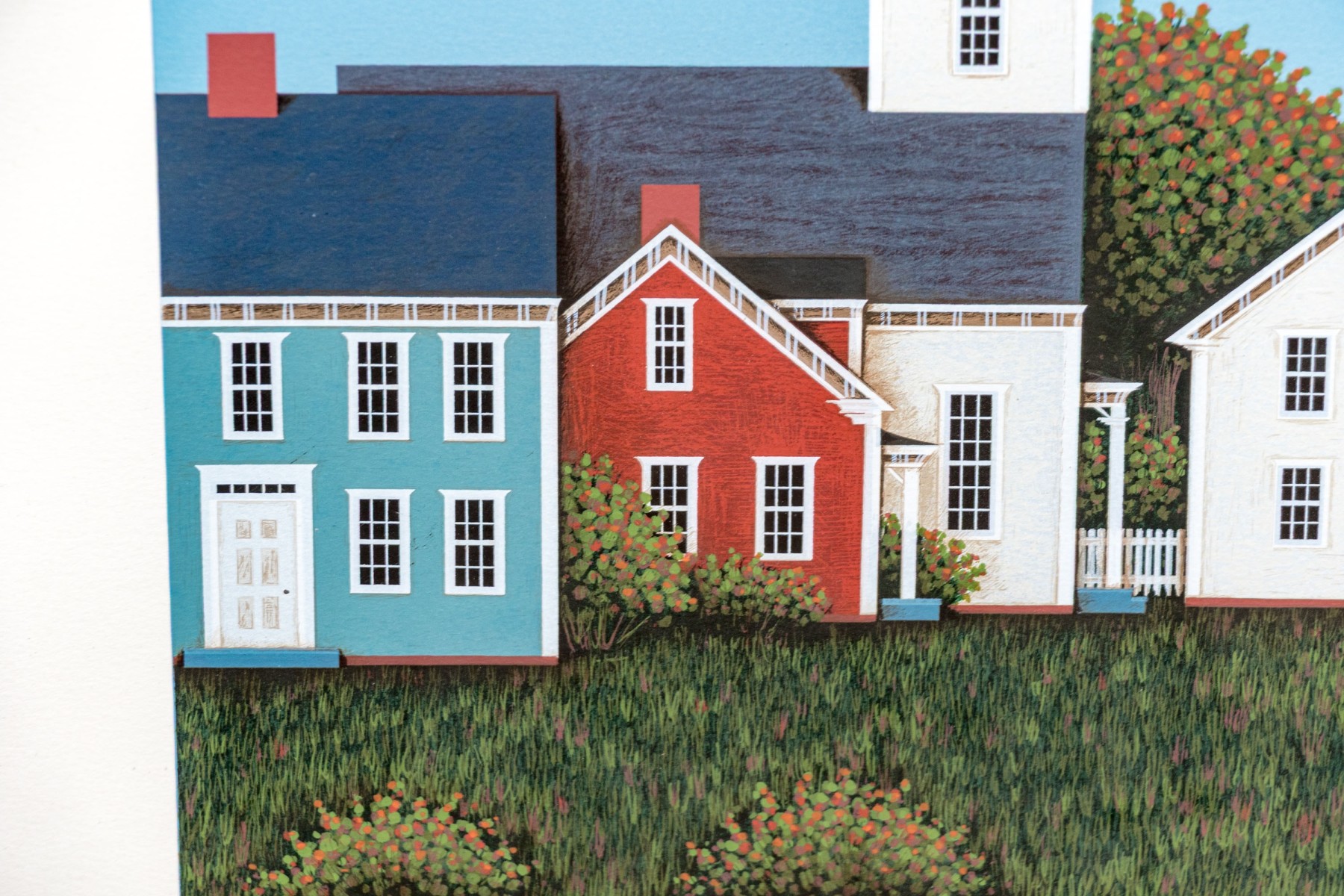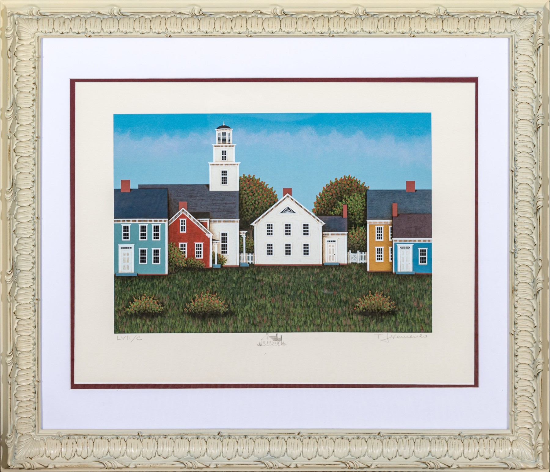 T. Jeremenko limited edition serigraph on paper. Vibrant colors depicting the facades of rural town structures, one with a tower. Green grass in the front with green trees in the background. Pencil numbered LVII/C out of plate lower left, and pencil signed lower right out of plate, along with a pencil drawn remarque depicting a cottage to the lower center out of plate.
