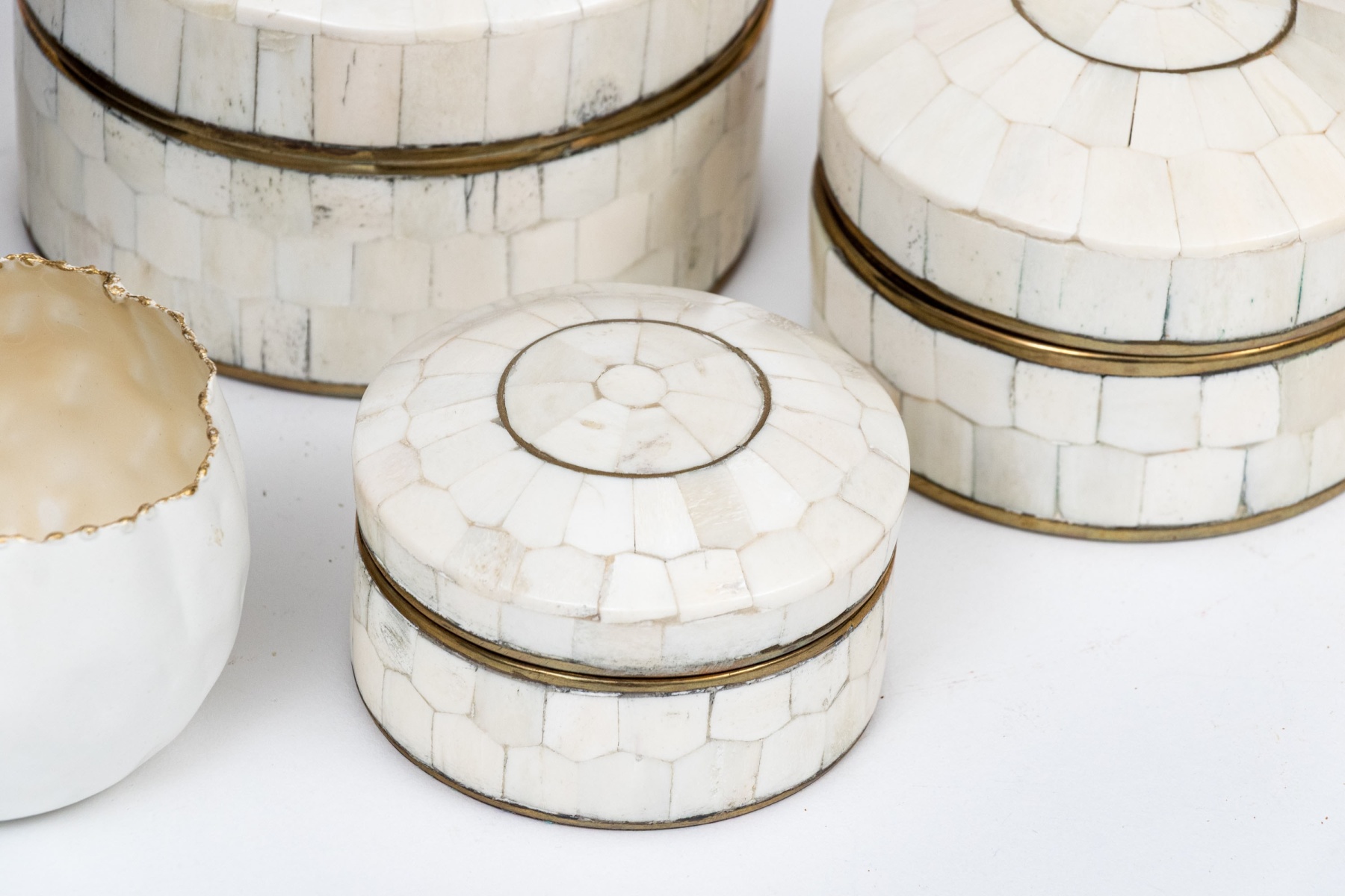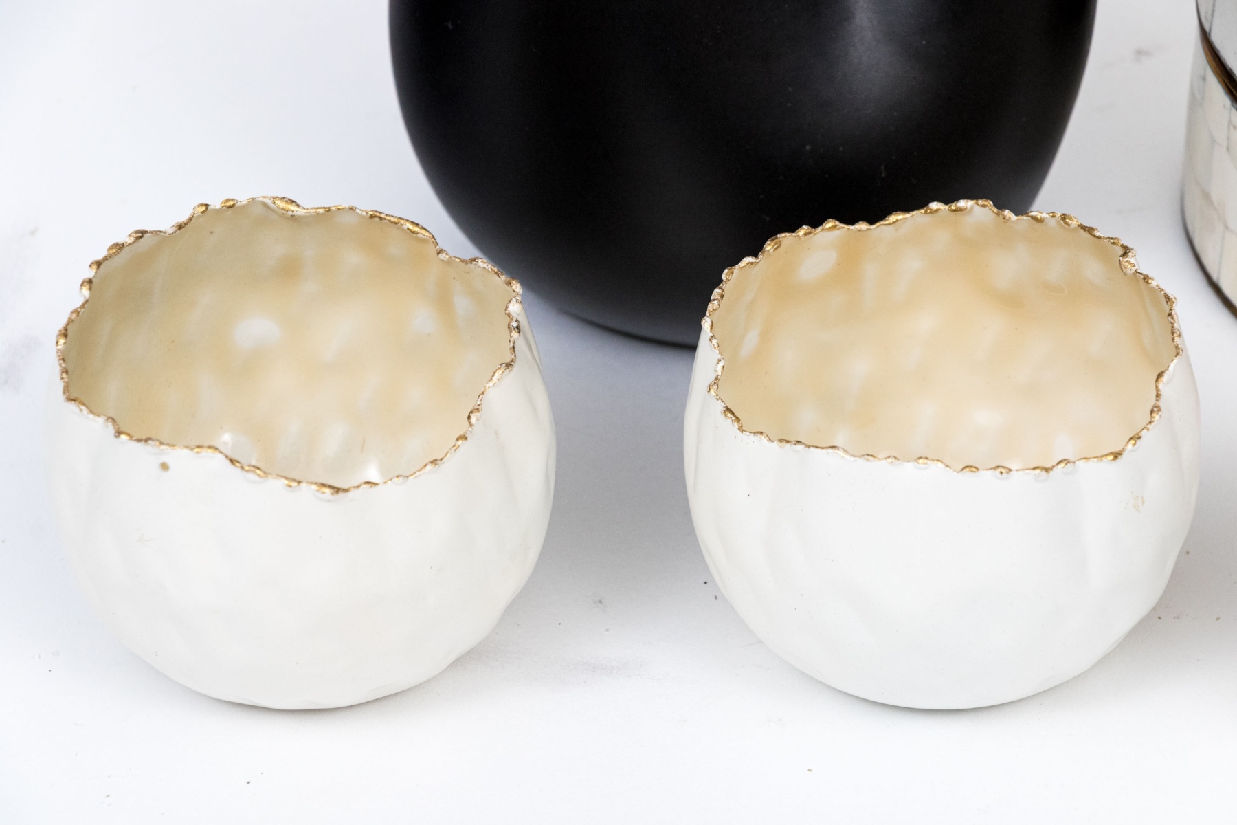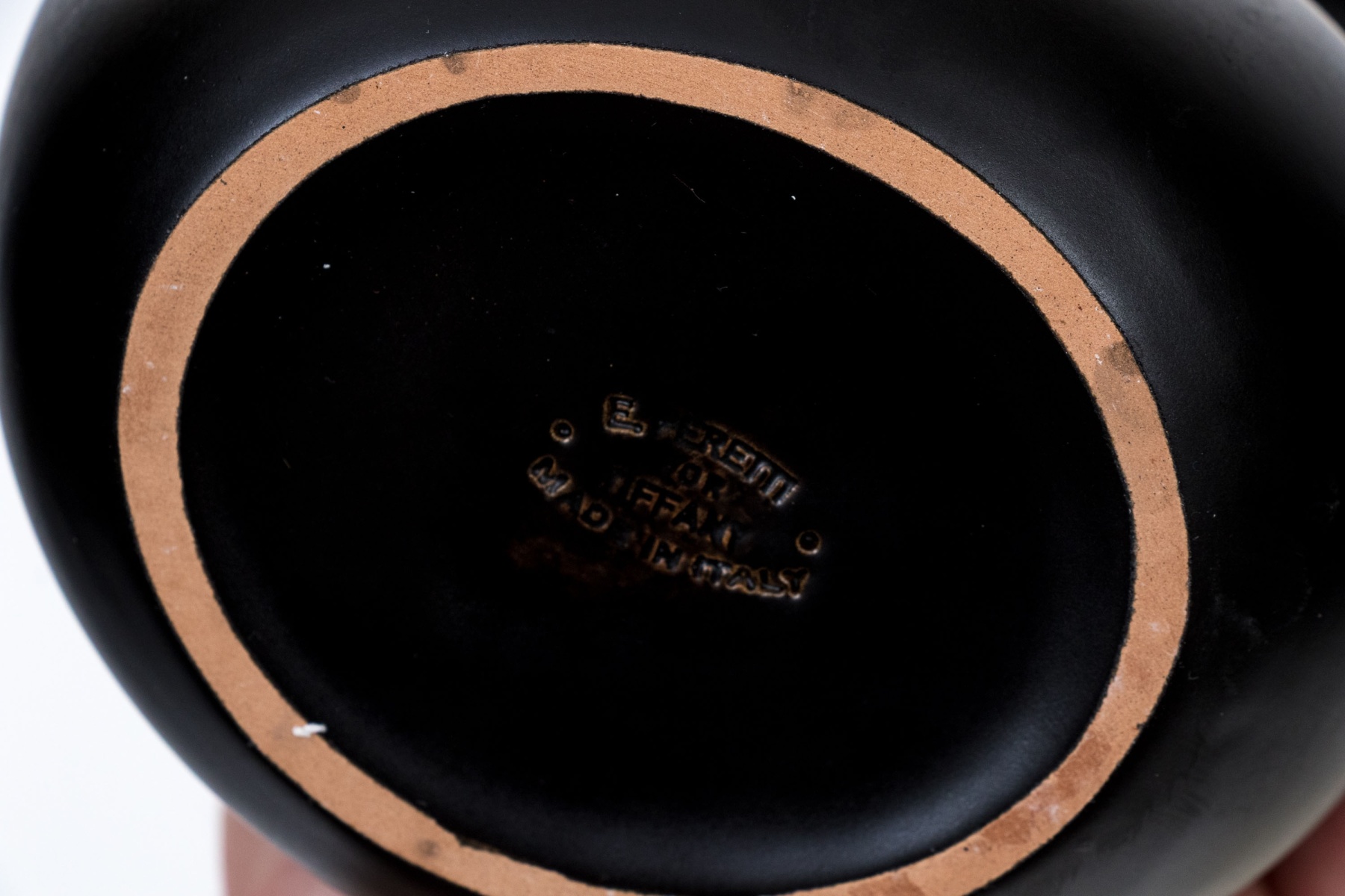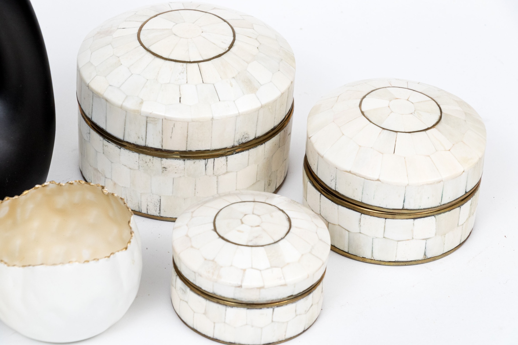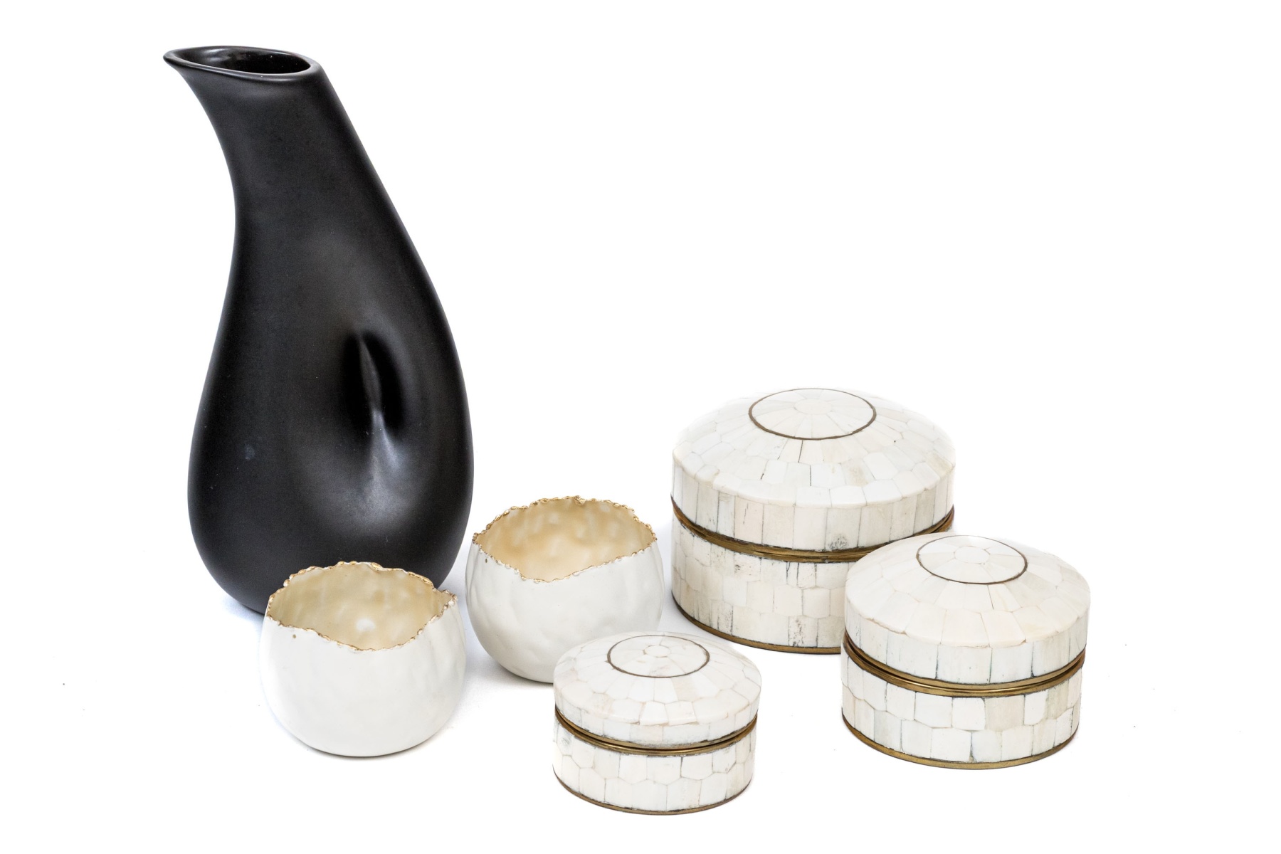 Comprised of a black finished water pitcher marked E. Peretti for Tiffany, three graduated size inlaid lidded boxes, and a pair of tole tea candle holders.