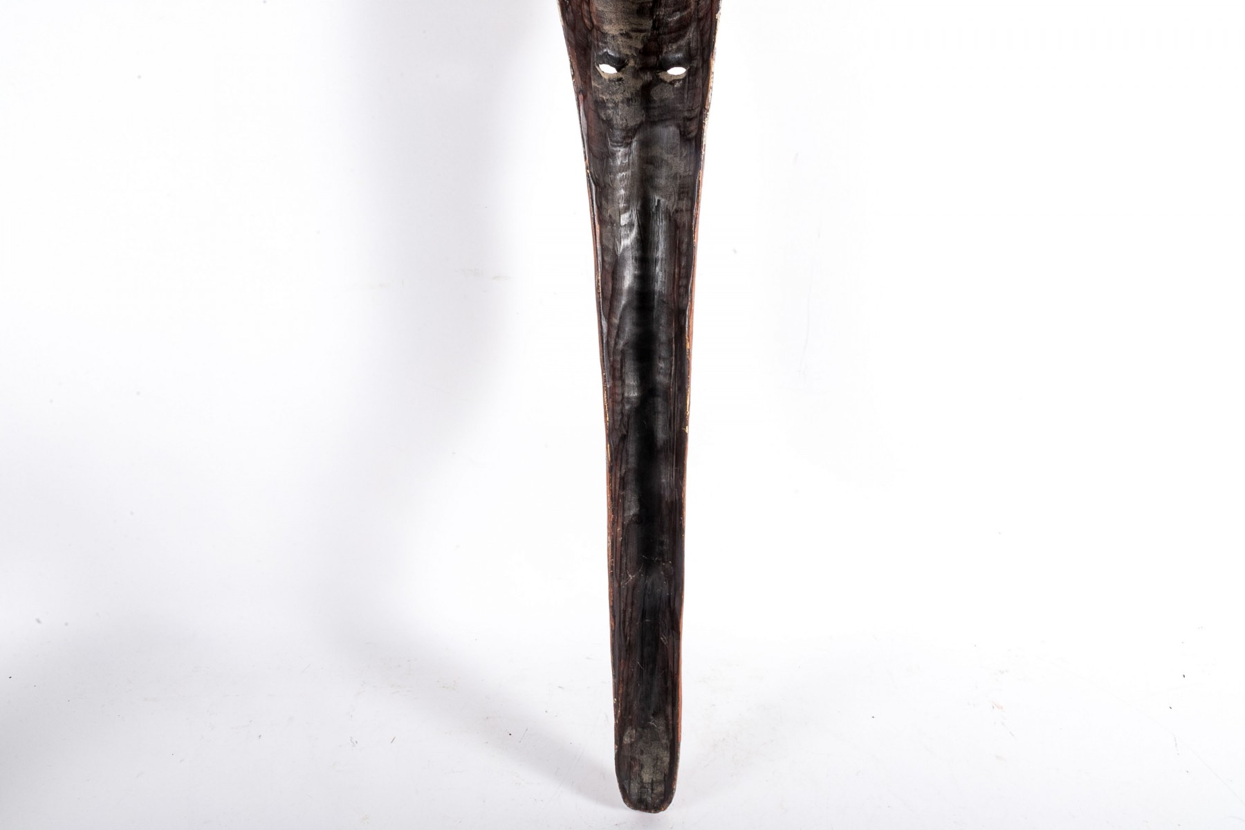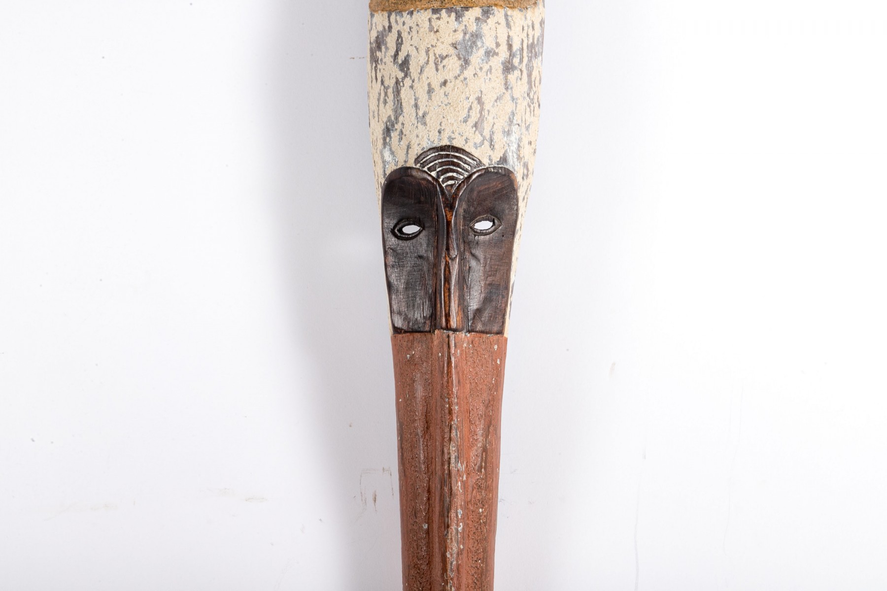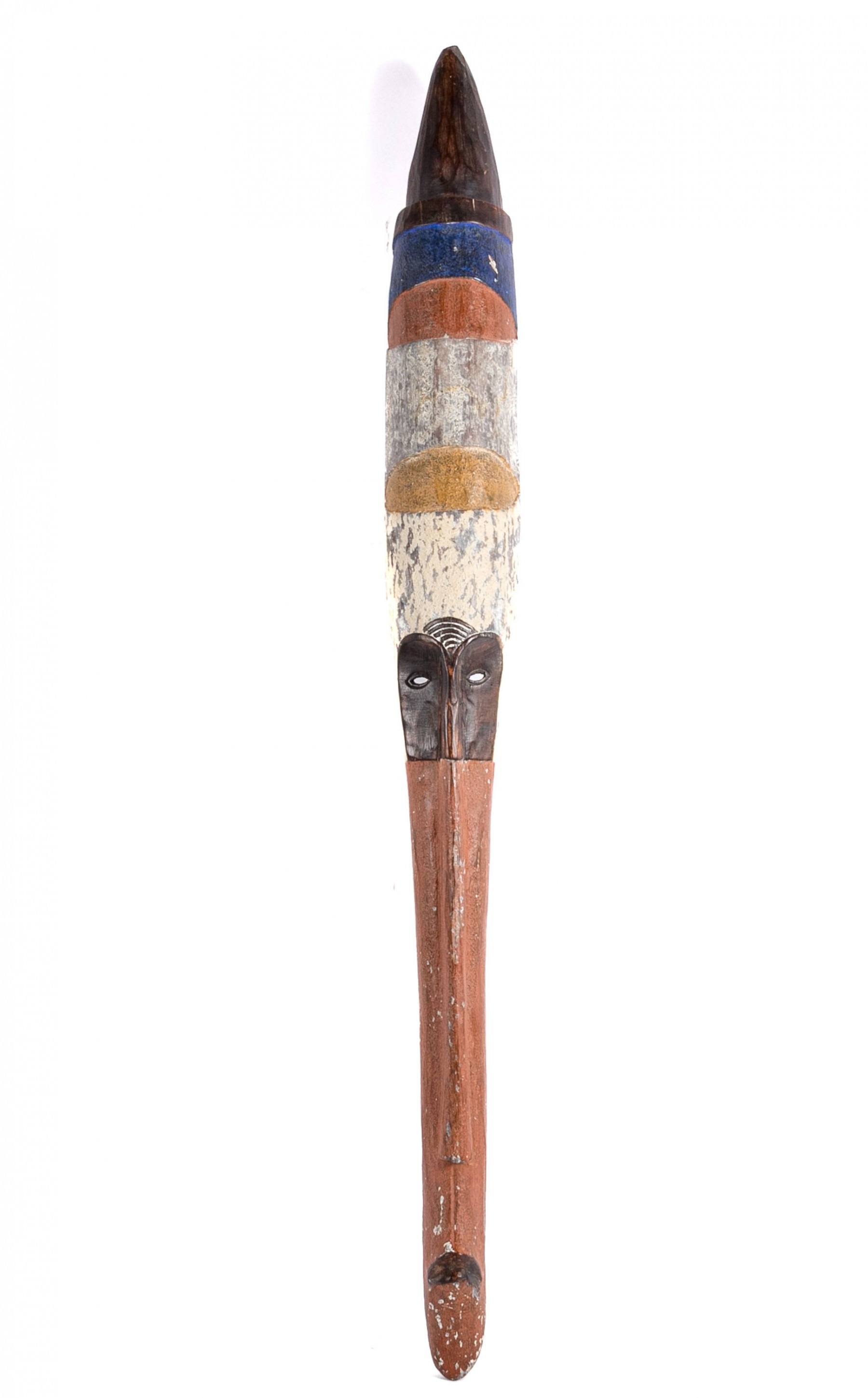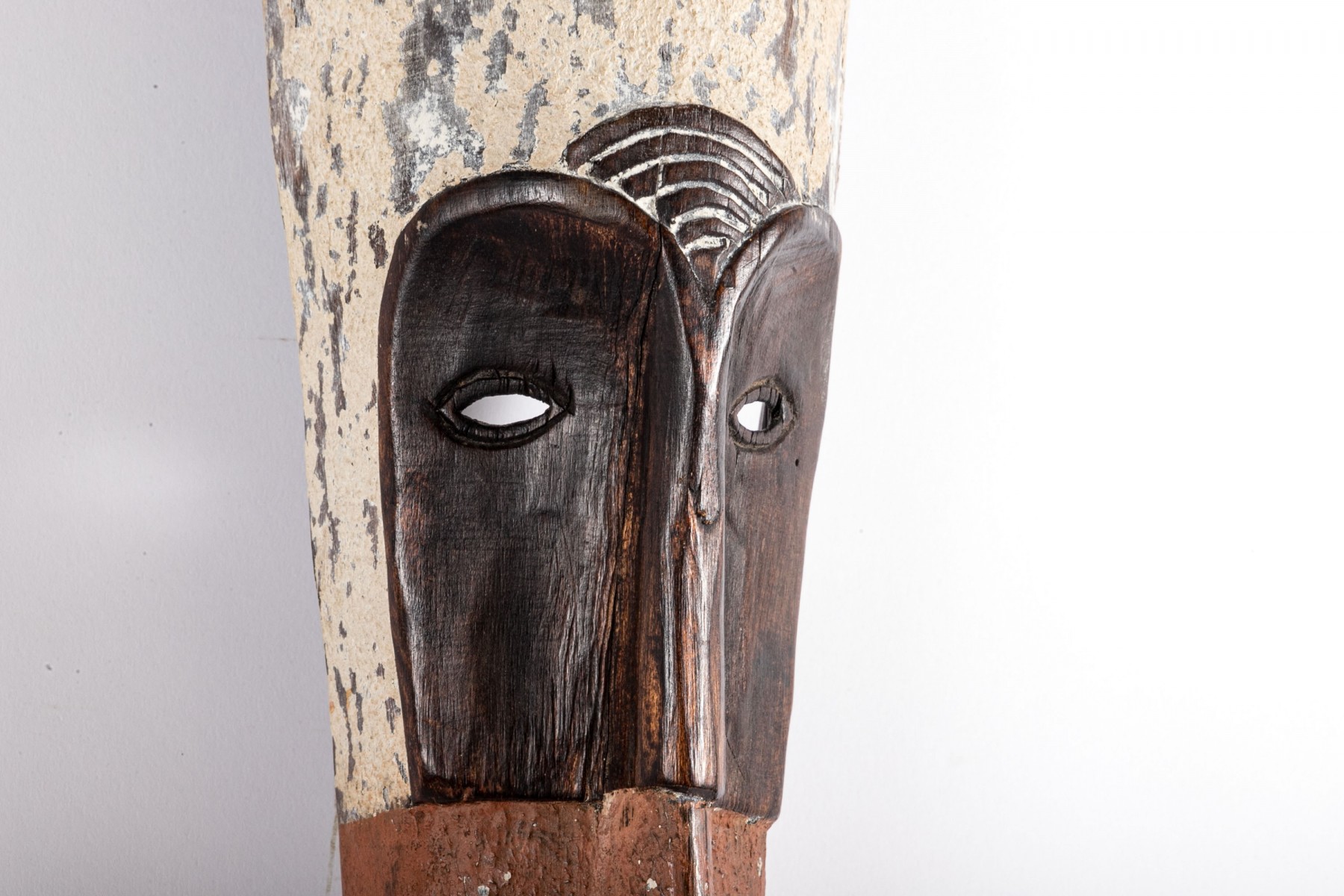 An impressive, tall carved and painted African wood mask displaying in hues of terracotta red, blue, brown, and white. Pierced at the eyes and affixed with a hanging hook at the back.