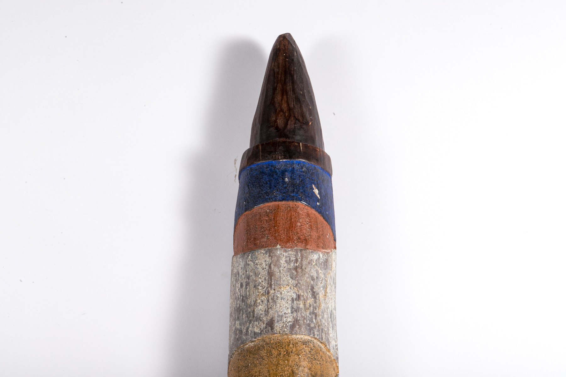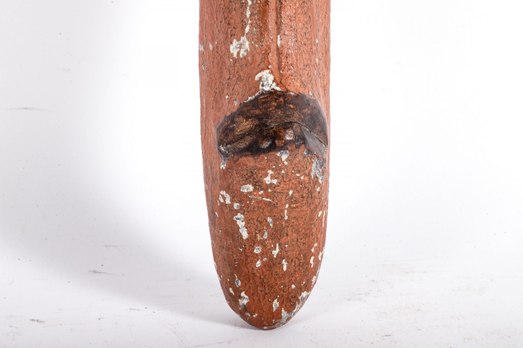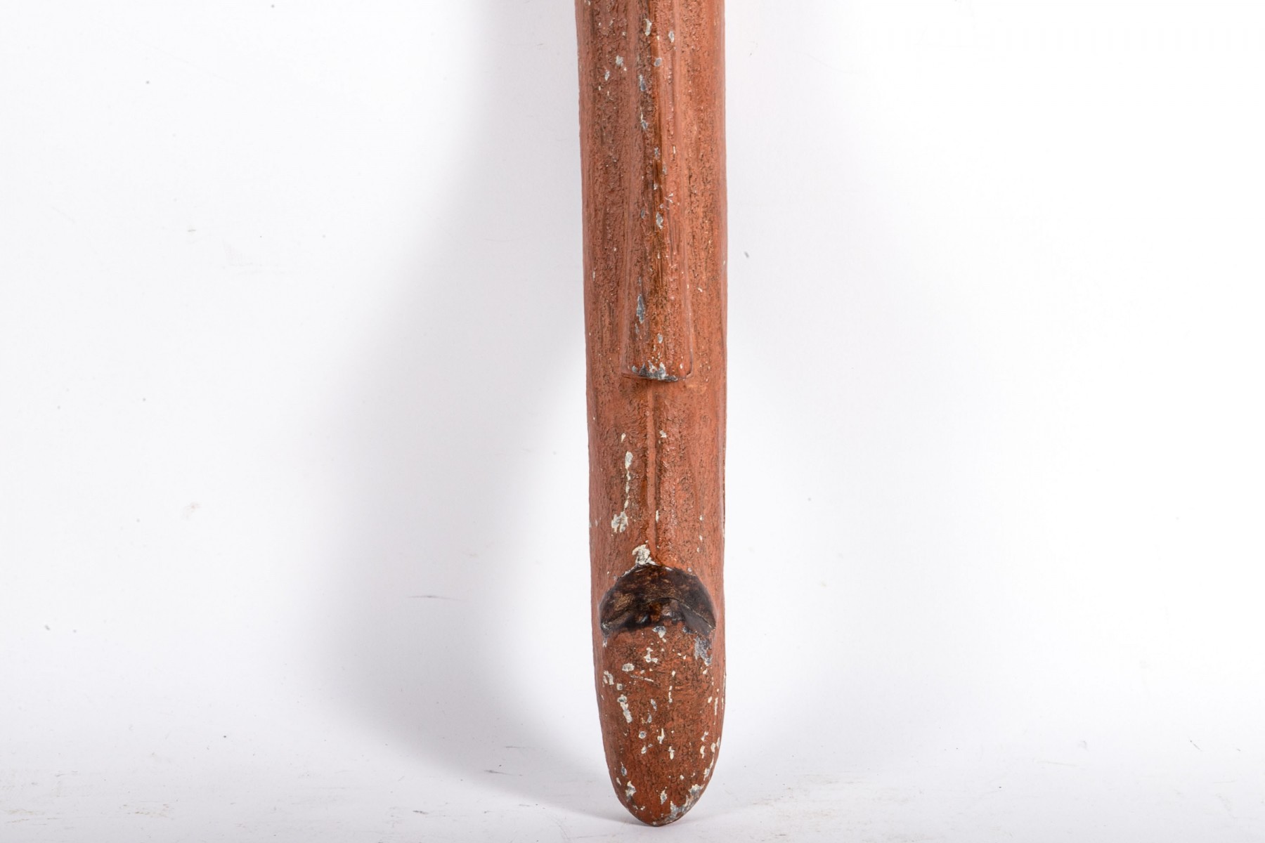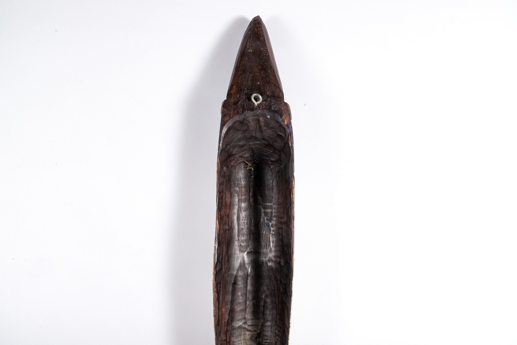 An impressive, tall carved and painted African wood mask displaying in hues of terracotta red, blue, brown, and white. Pierced at the eyes and affixed with a hanging hook at the back.