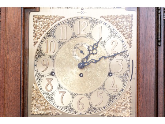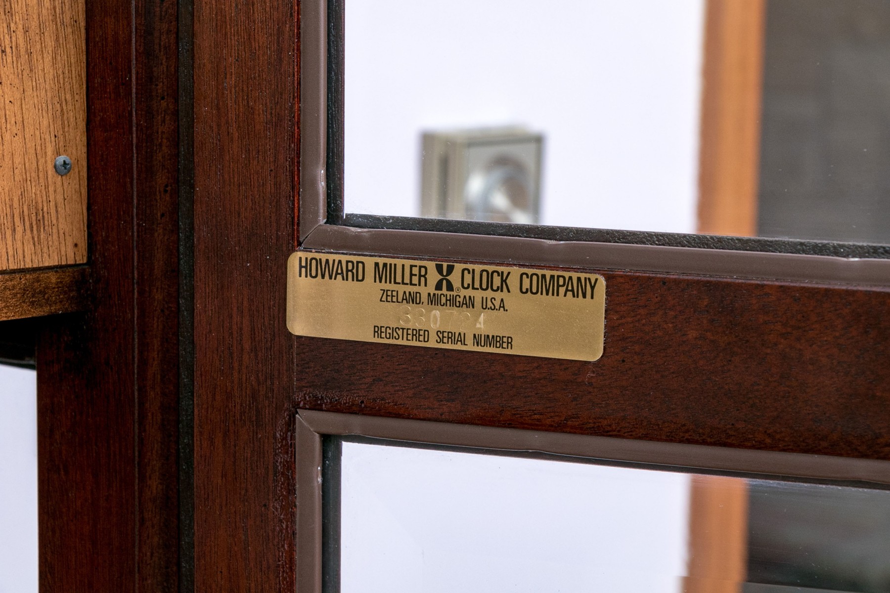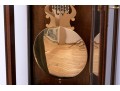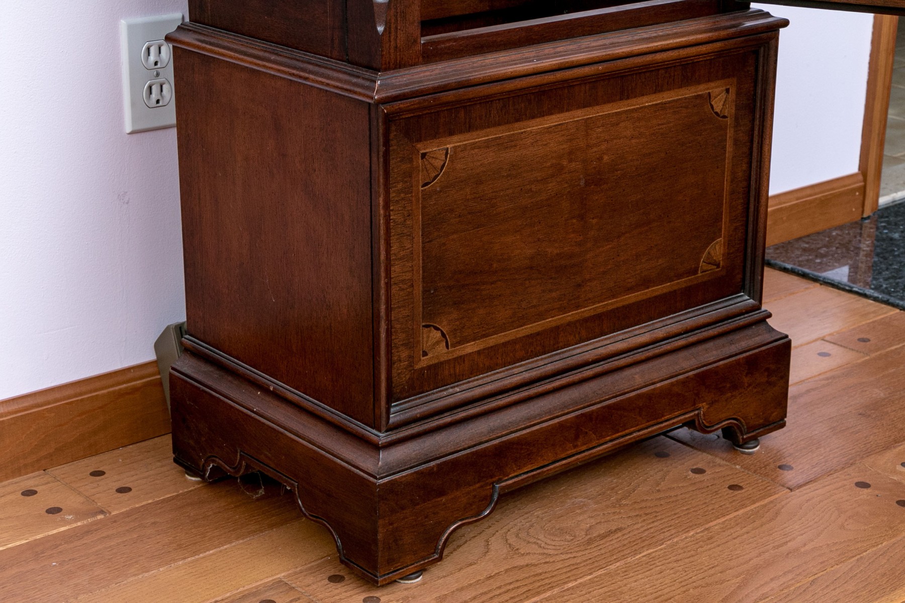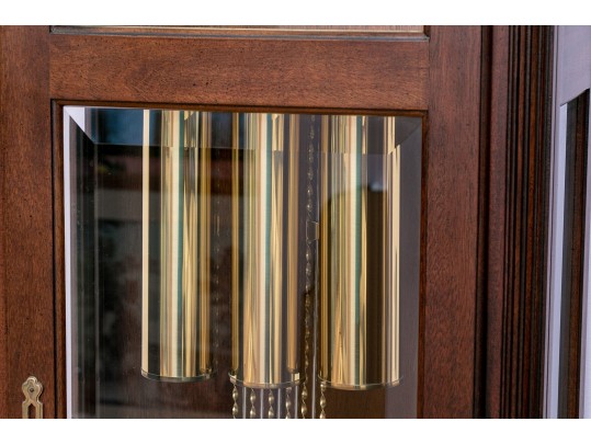 This tall Howard mirror clock is in a mahogany case and is adorned with a beautiful gilt decorated and foliate face with foliate carvings and openwork hands. The clock is complete with all internal mechanisms including pendulum and chimes. The case has a beveled pediment with carved designs and inlaid parquetry and terminates on bracket feet.