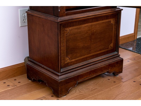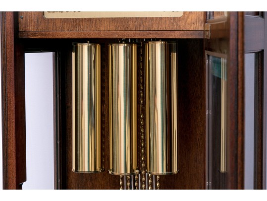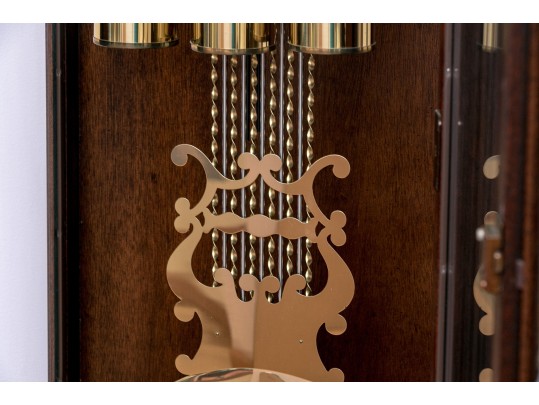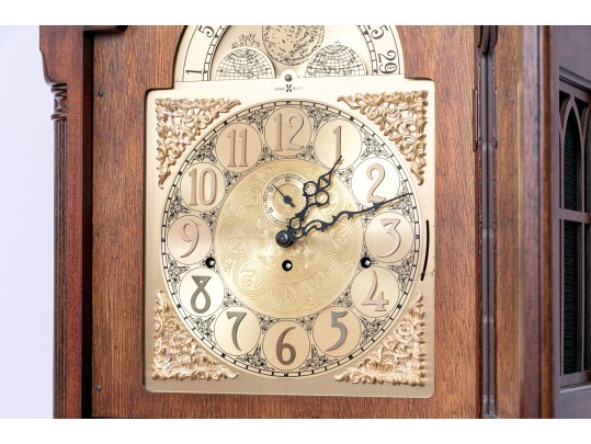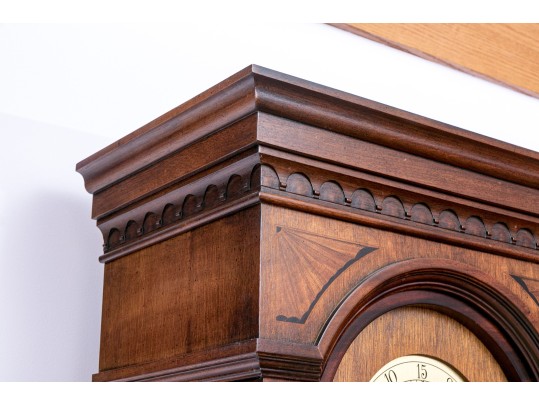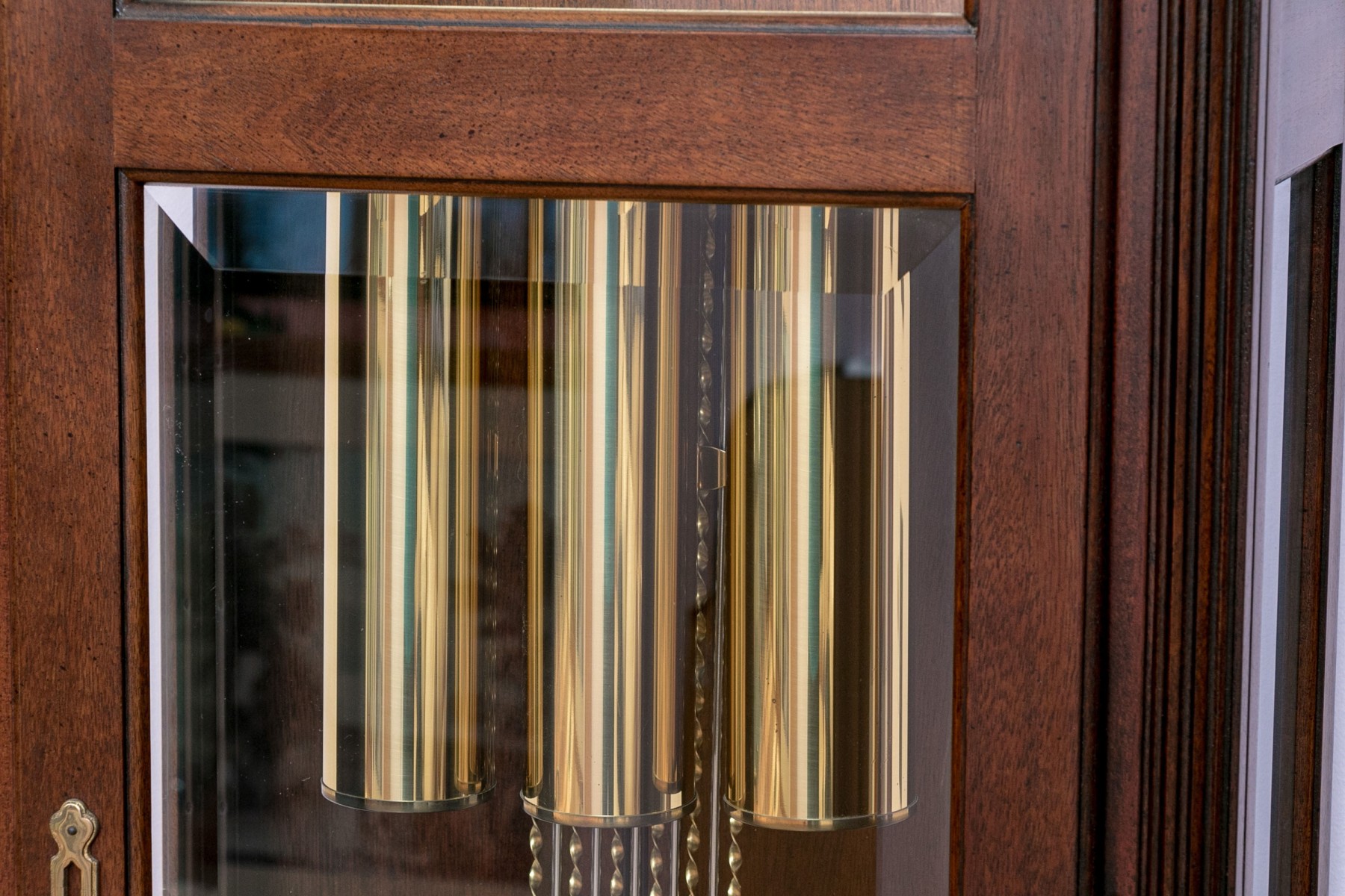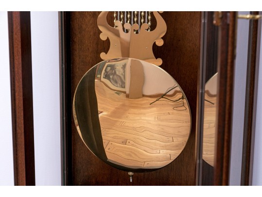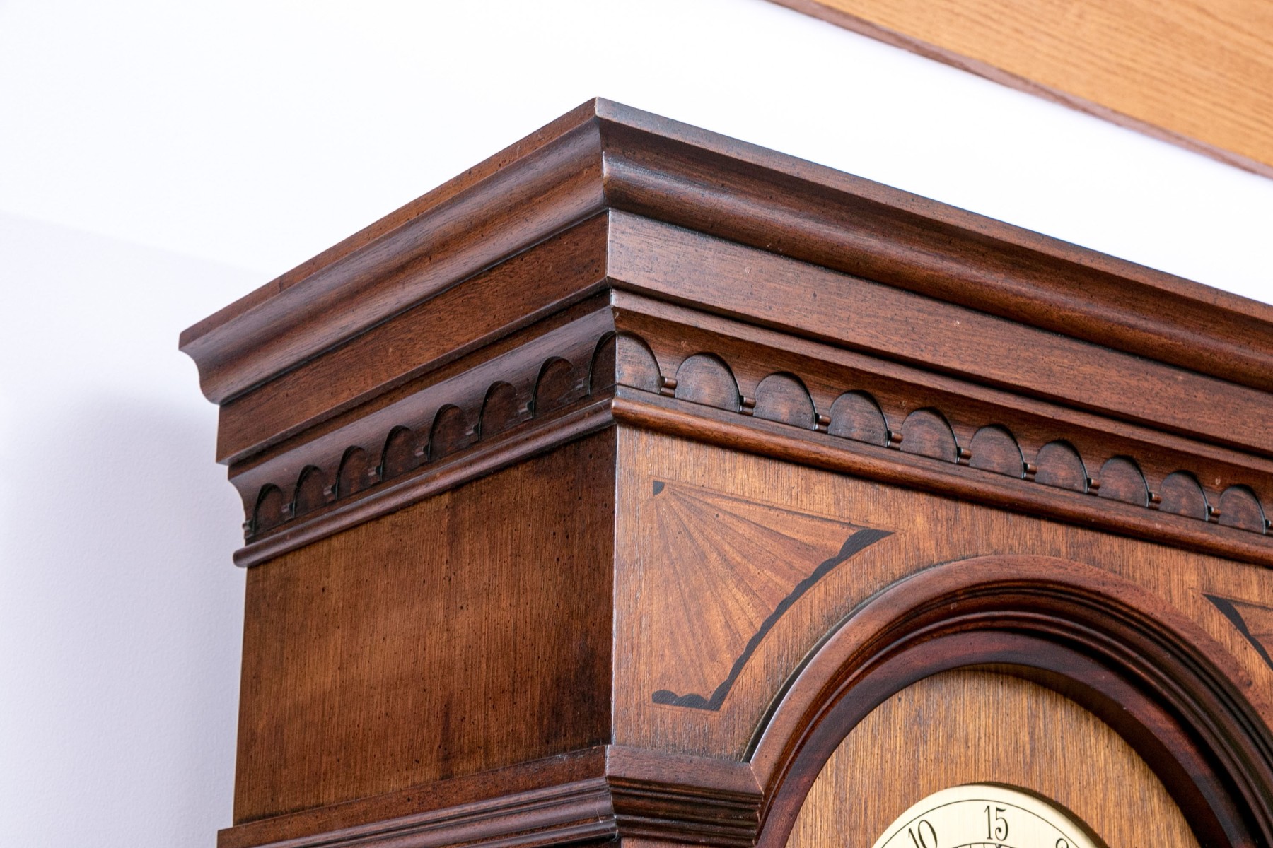 This tall Howard mirror clock is in a mahogany case and is adorned with a beautiful gilt decorated and foliate face with foliate carvings and openwork hands. The clock is complete with all internal mechanisms including pendulum and chimes. The case has a beveled pediment with carved designs and inlaid parquetry and terminates on bracket feet.