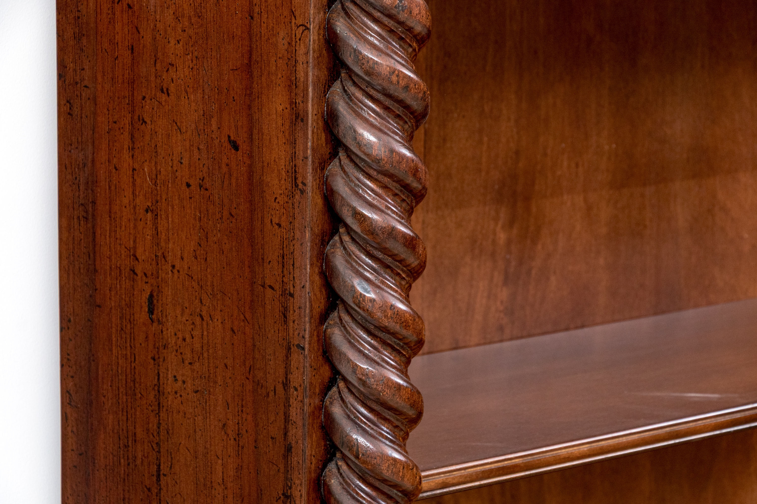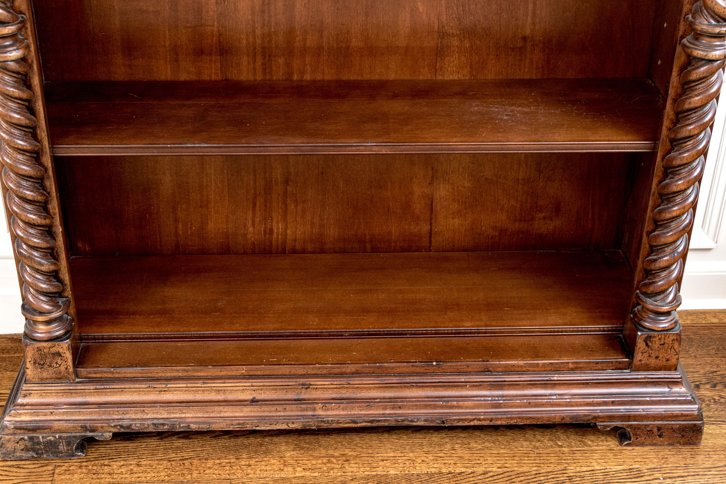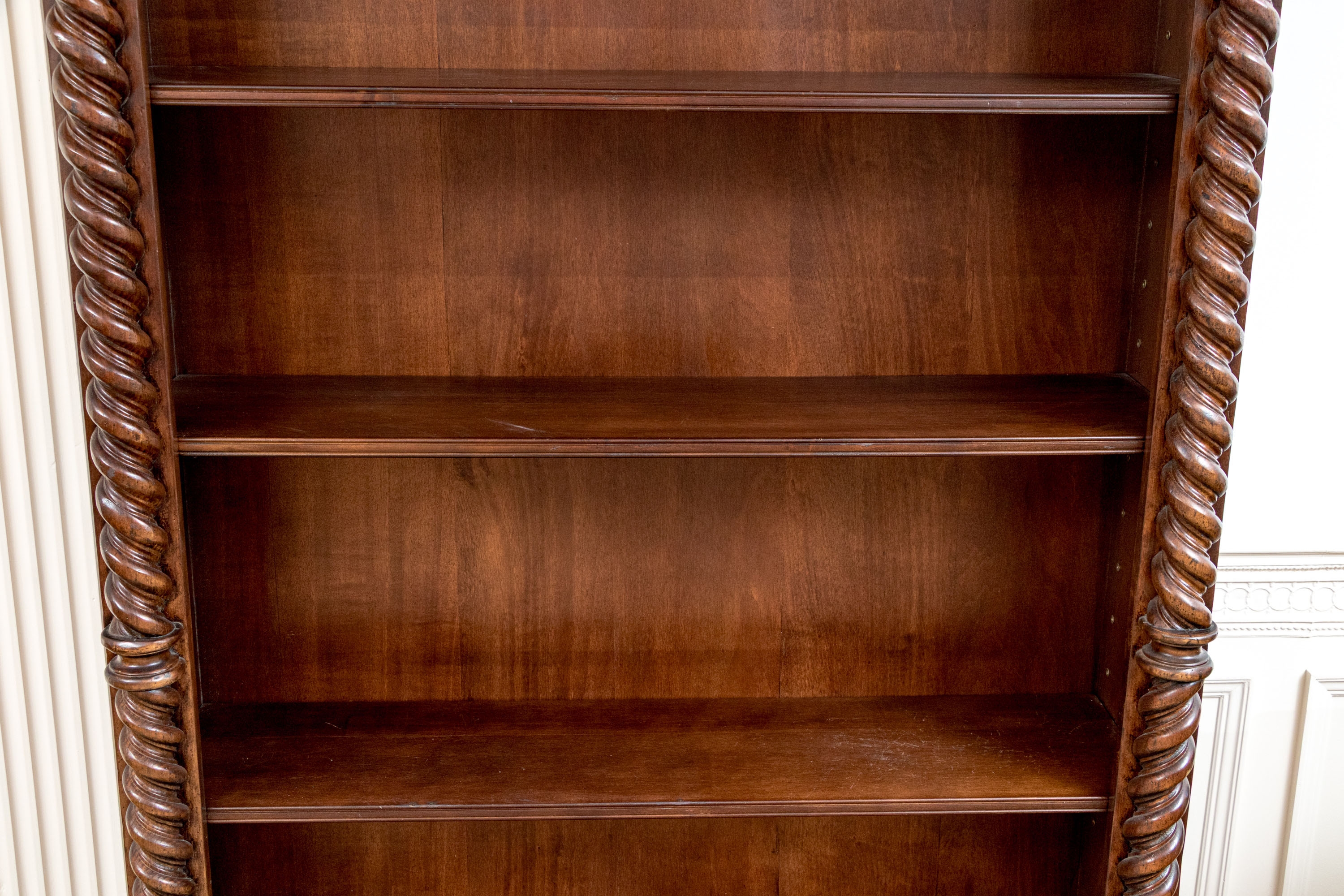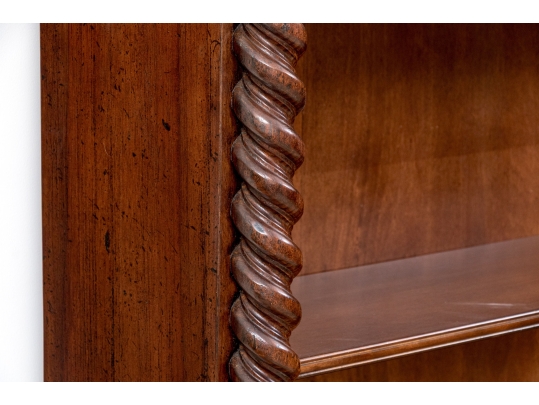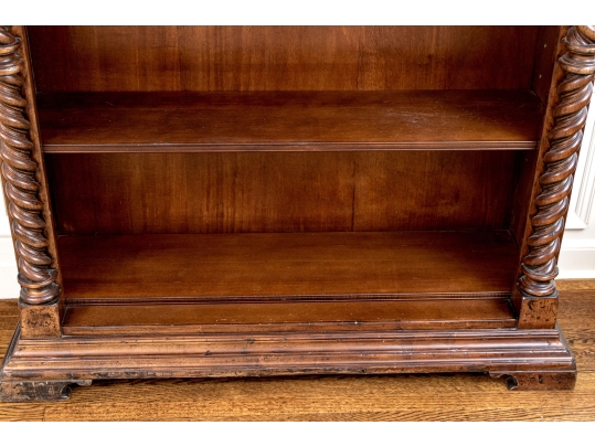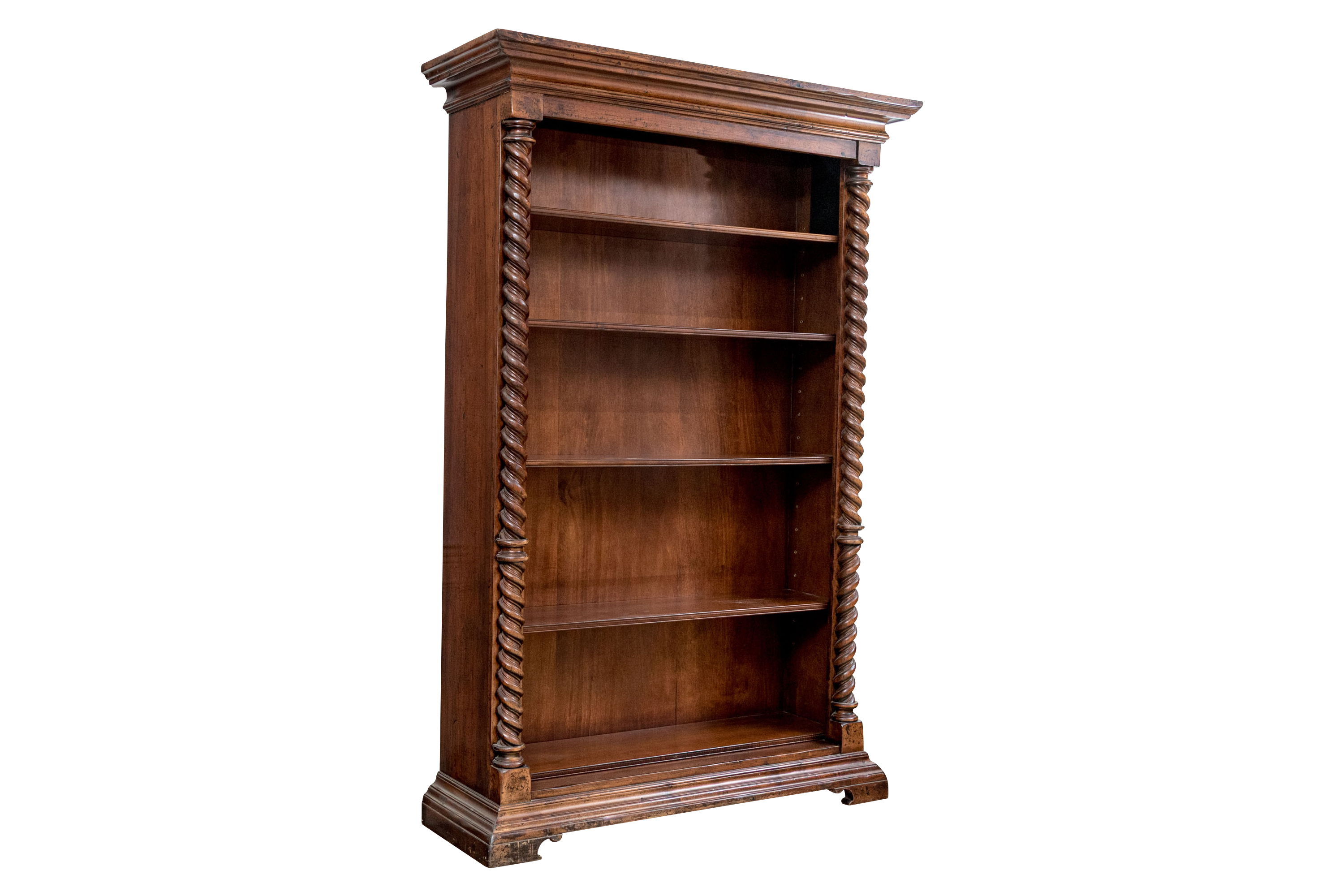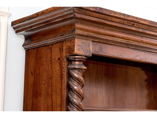 A tall open bookcase in a dark stain with bold barley twist style columns flanking five adjustable shelves. The bookcase with brass grommet form shelf pin sleeves, solid wood backing, tiered cornice and the whole resting upon bracket feet. Marked on verso Made in Italy.
