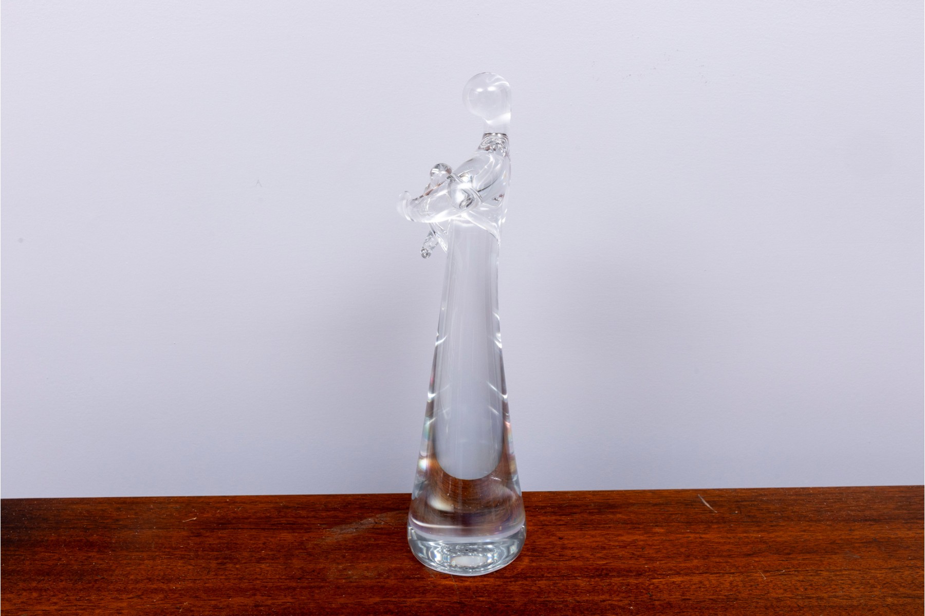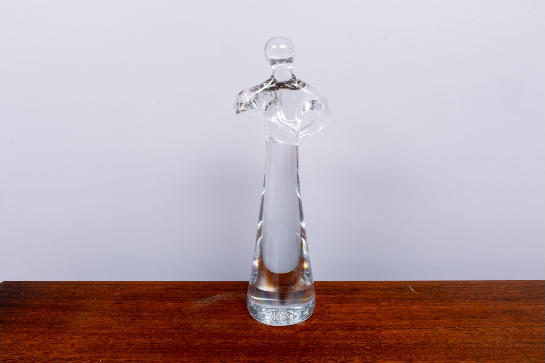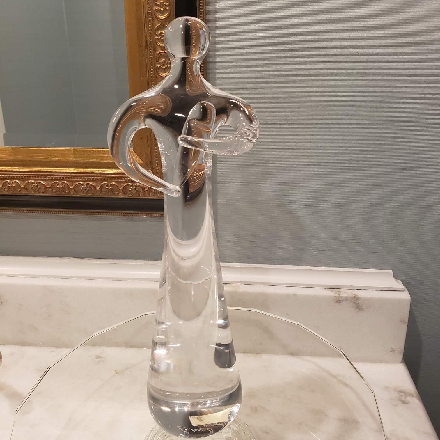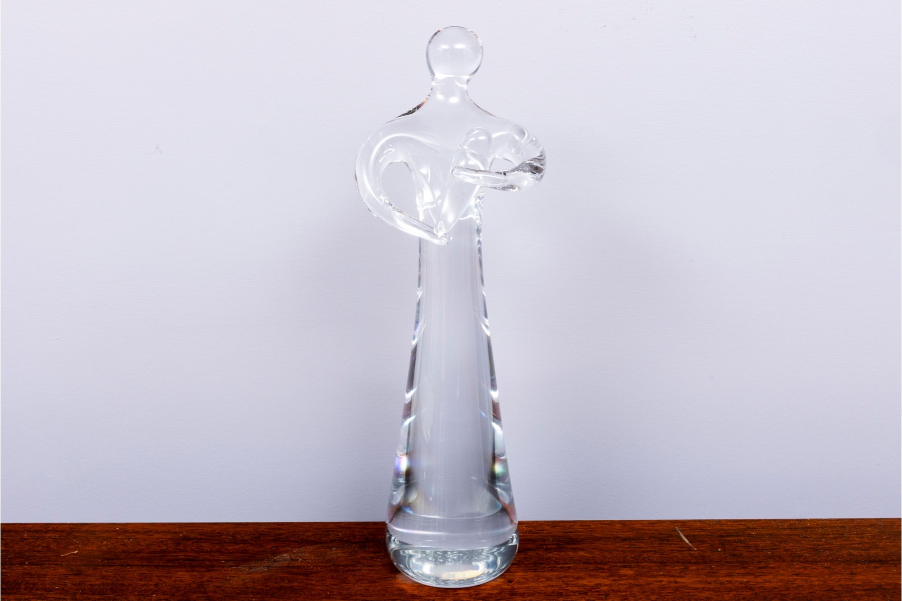 A lovely crystal art glass sculpture of a Madonna figure and child. Made in Sweden. An indistinct etched signature resides beneath the base.