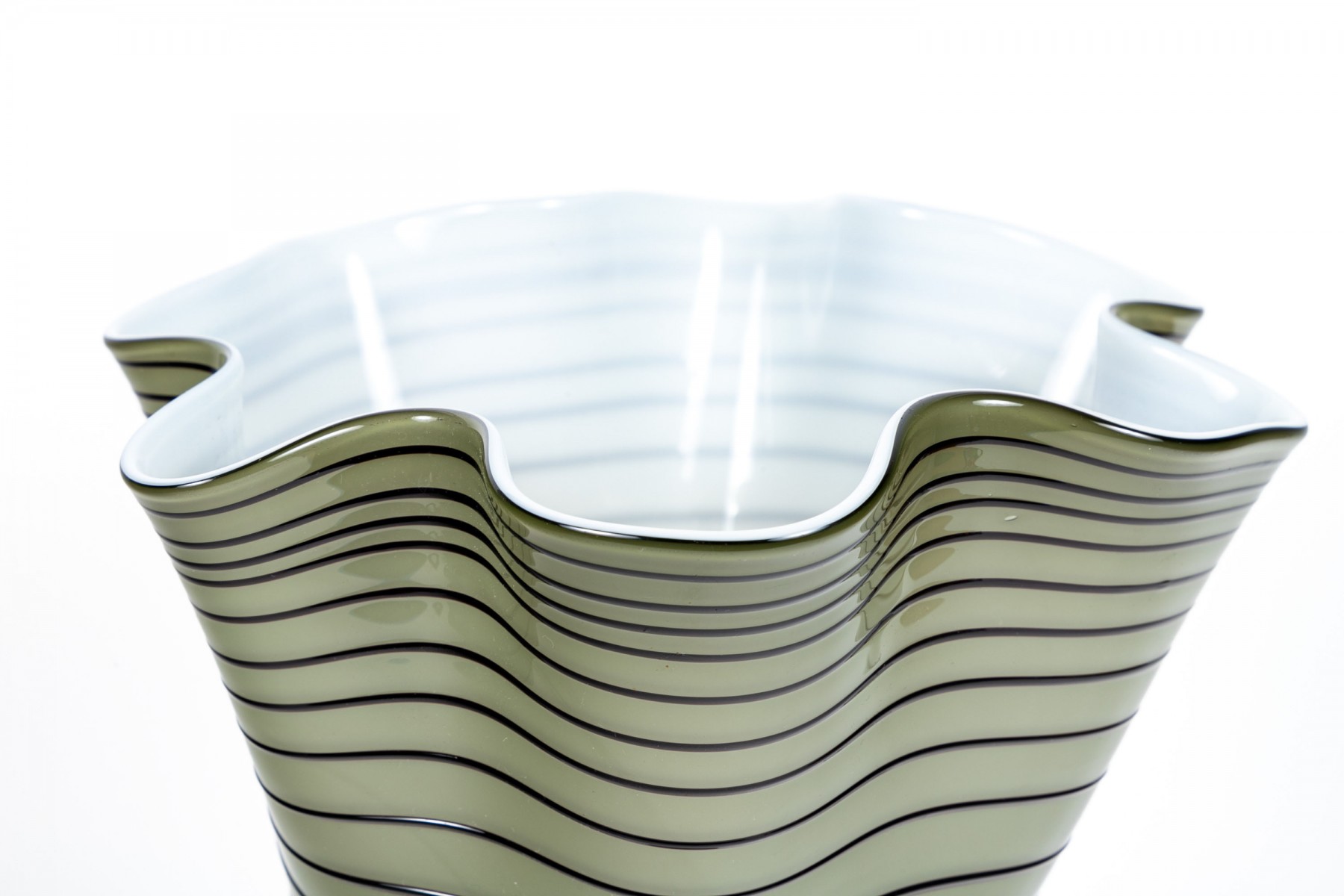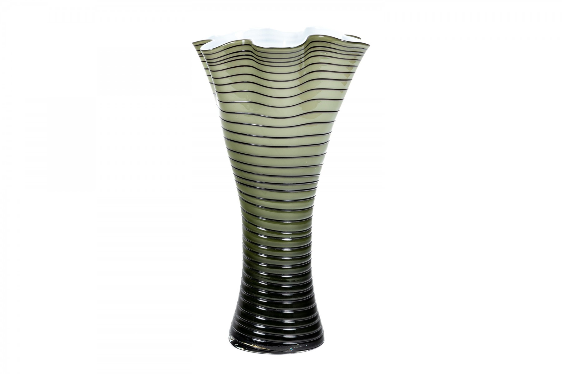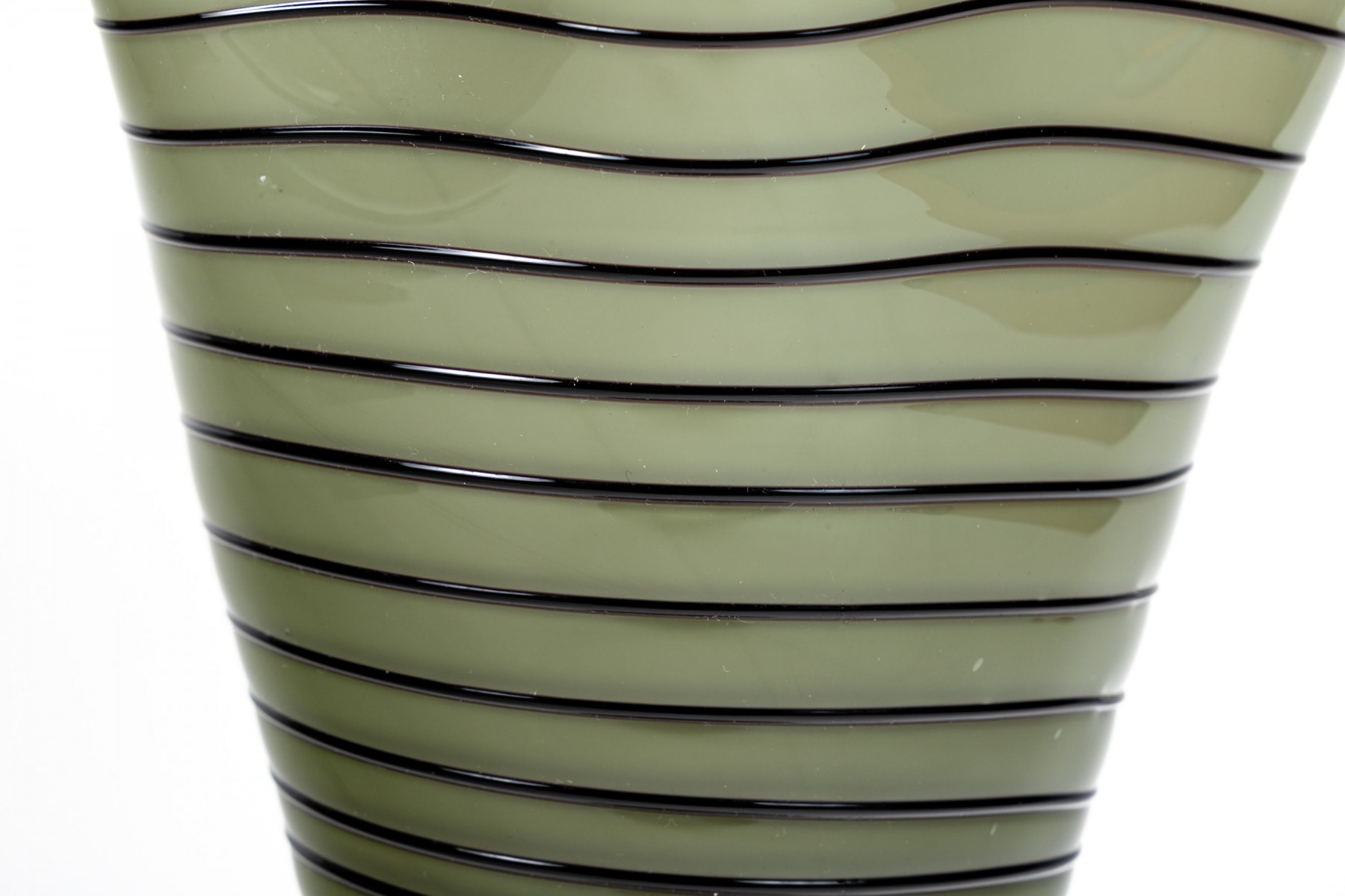 A green and white cased glass vase with ruffle rim overlai.d with black threads.