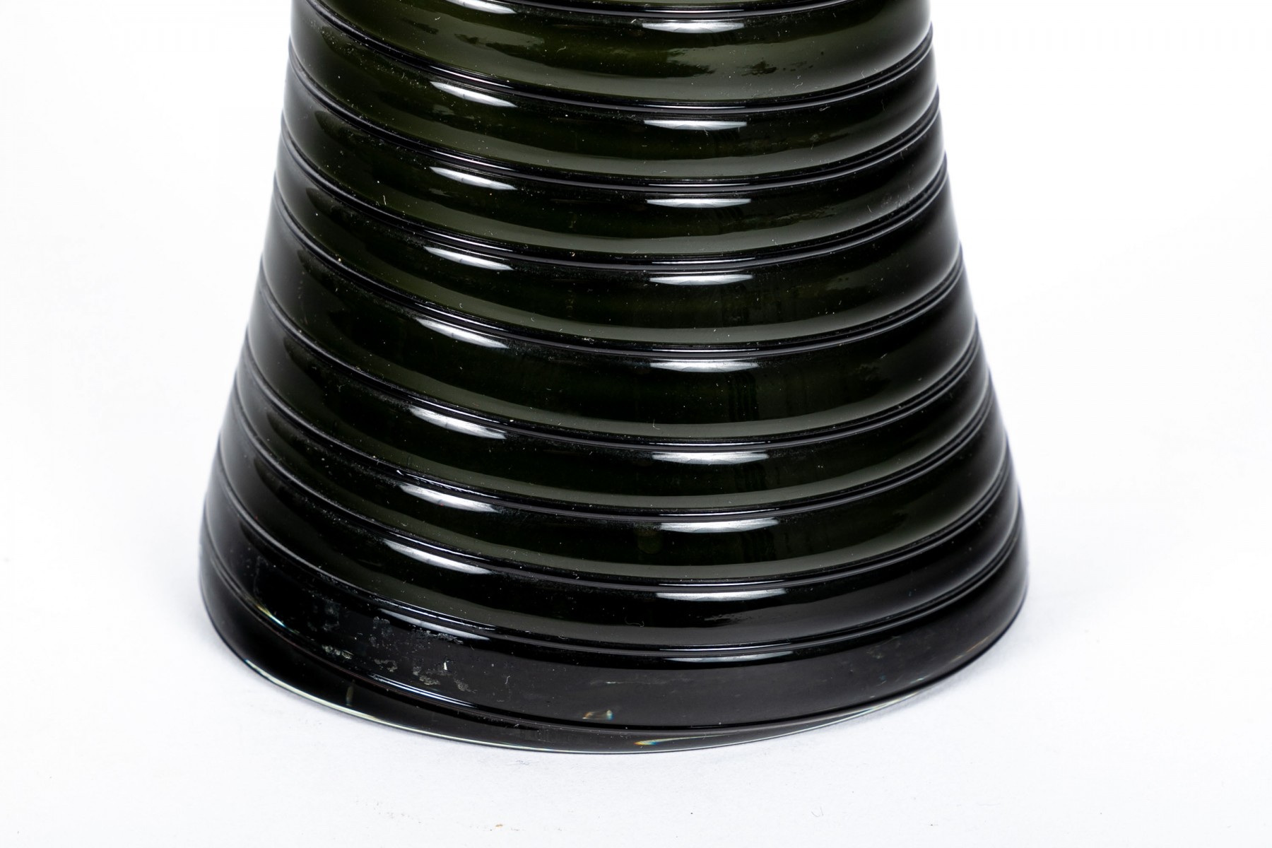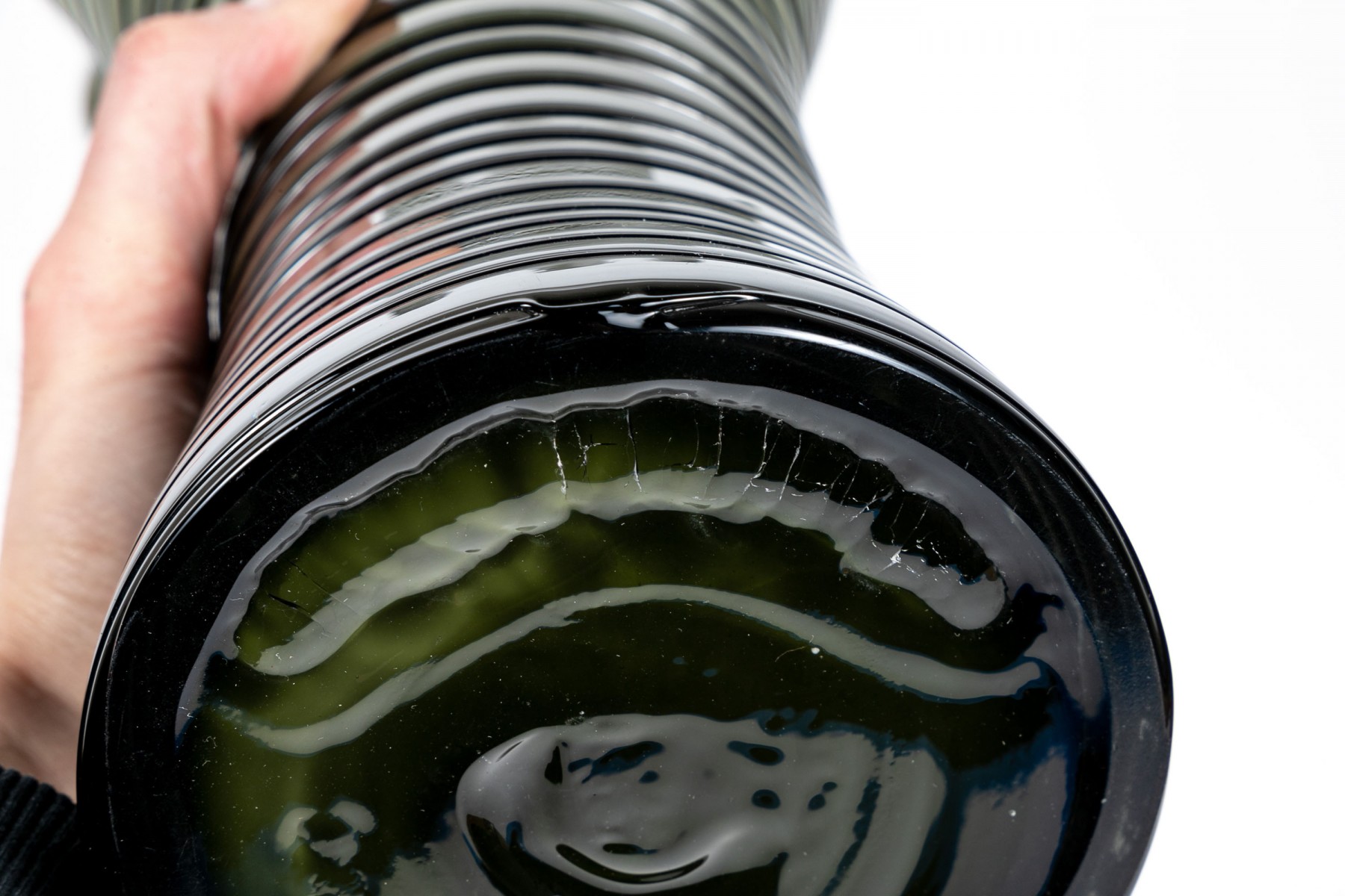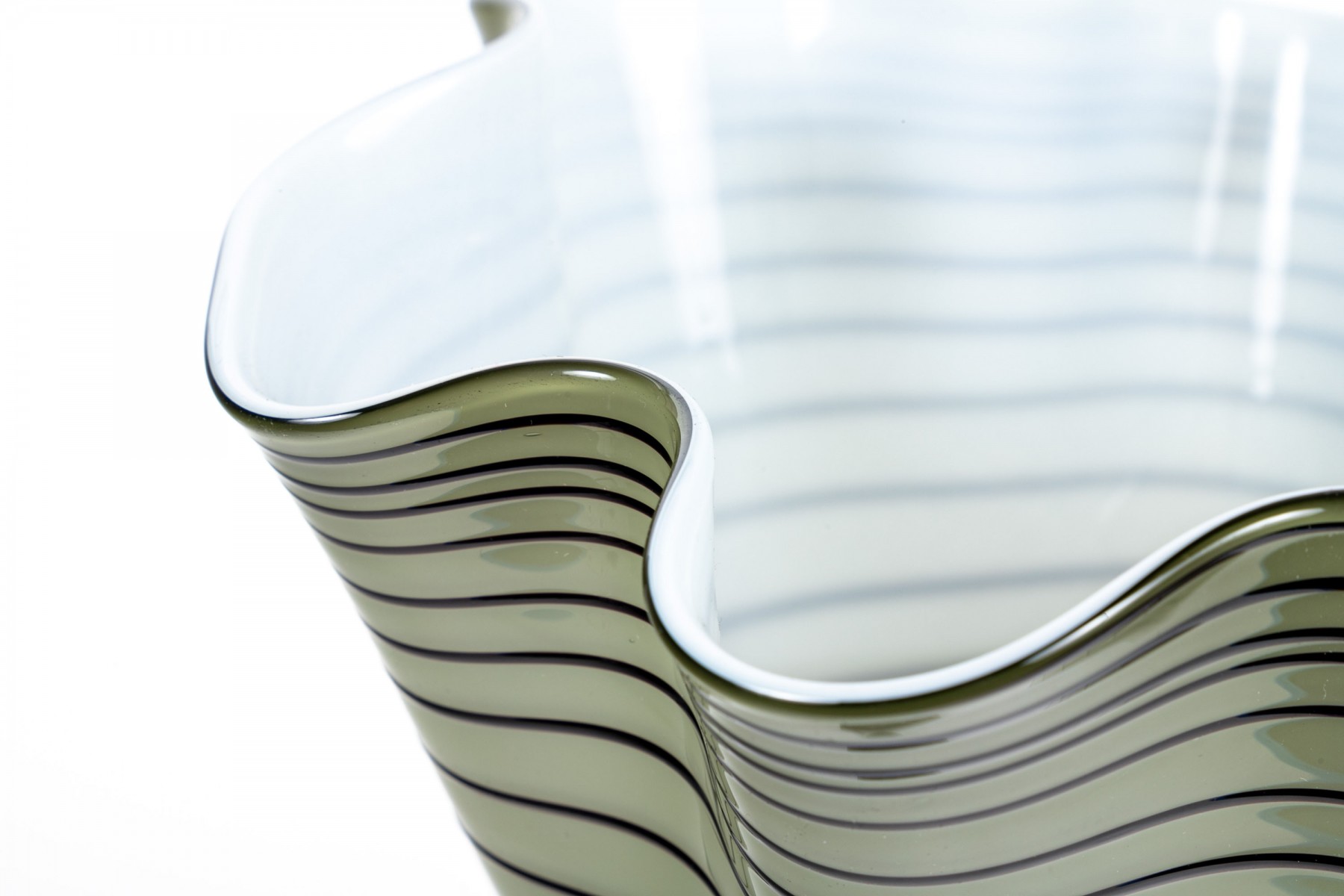 A green and white cased glass vase with ruffle rim overlai.d with black threads.