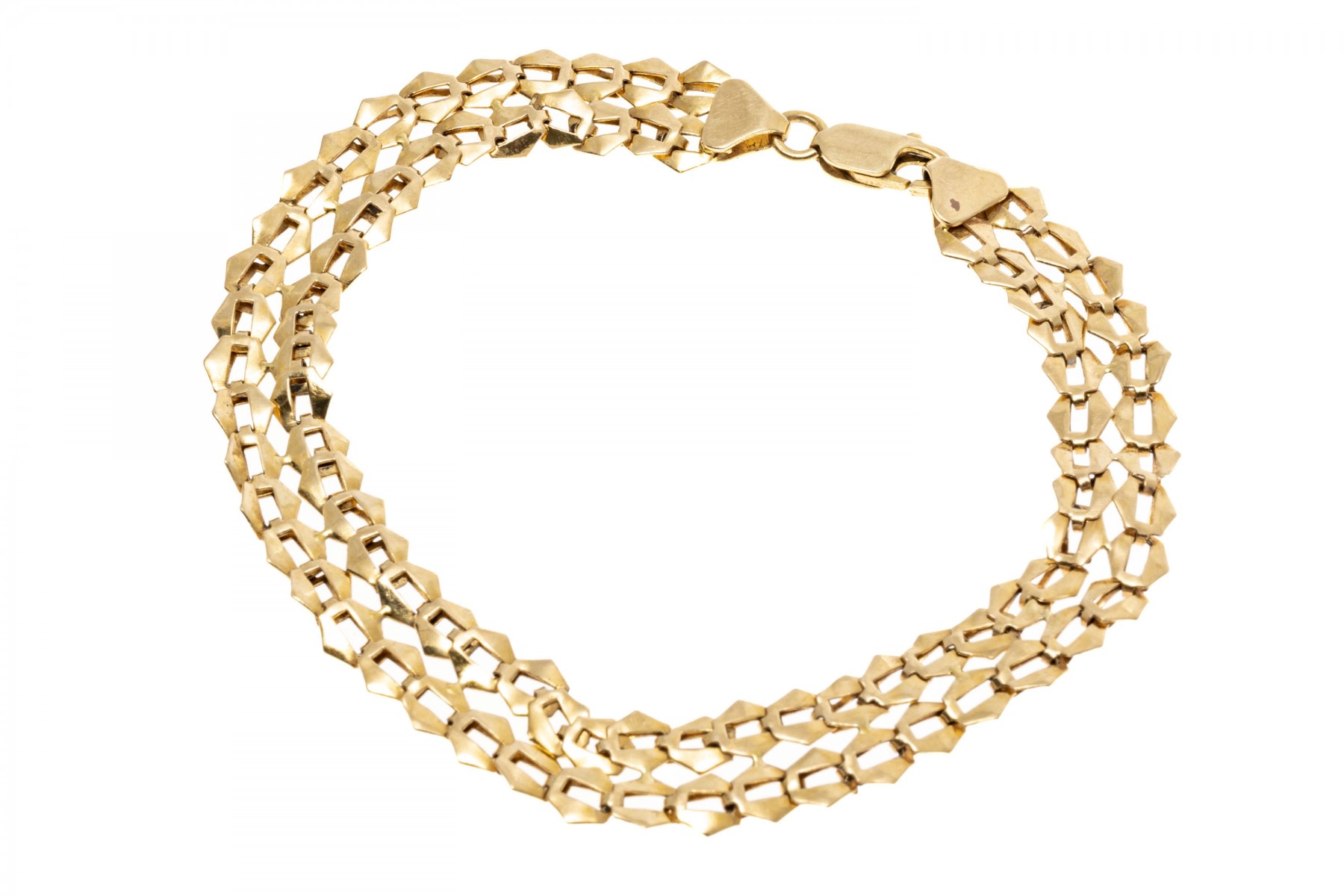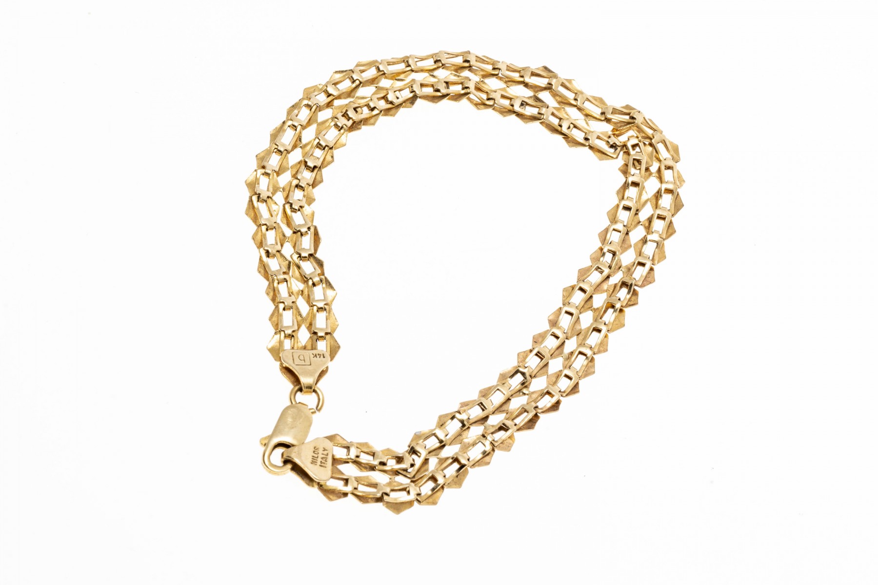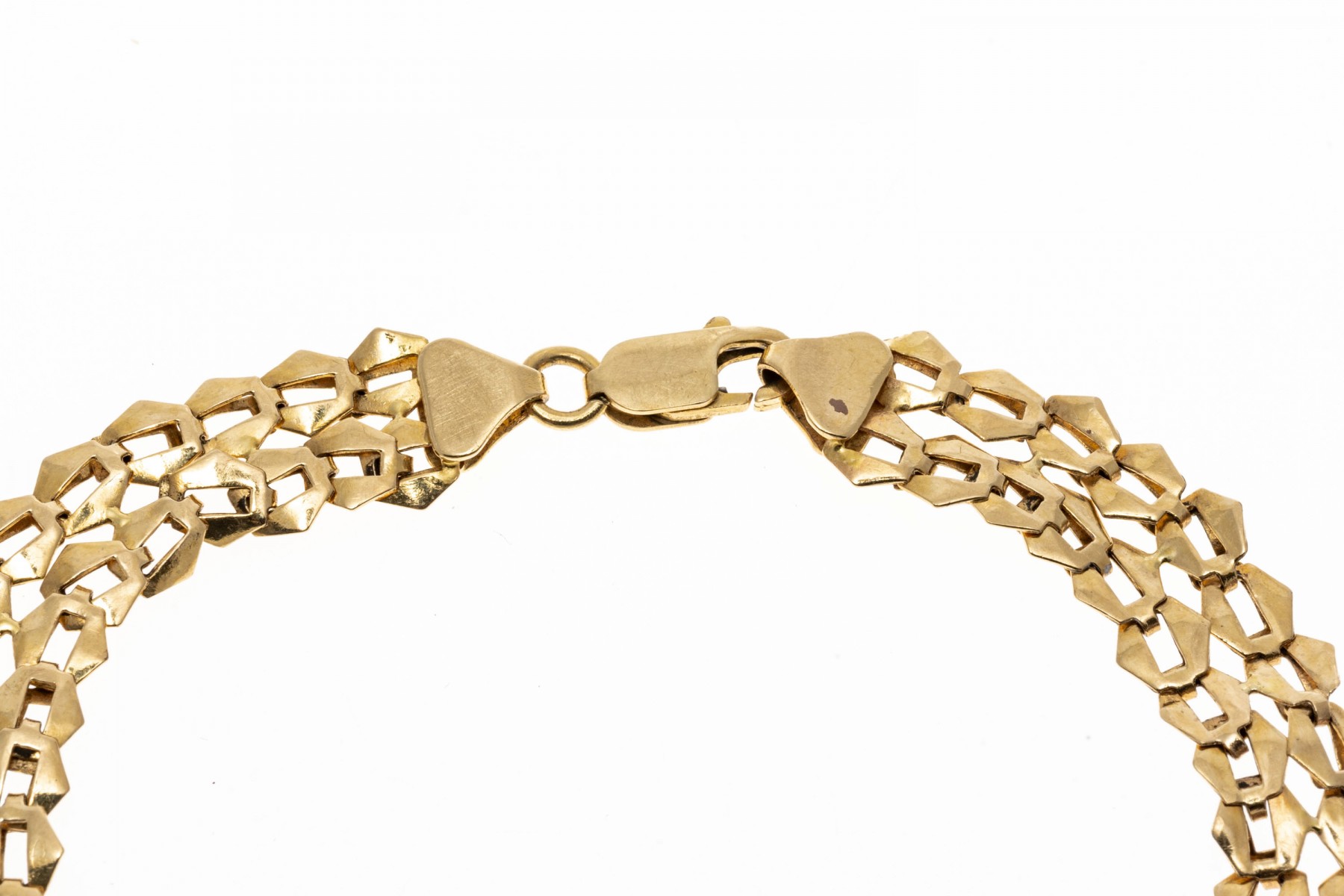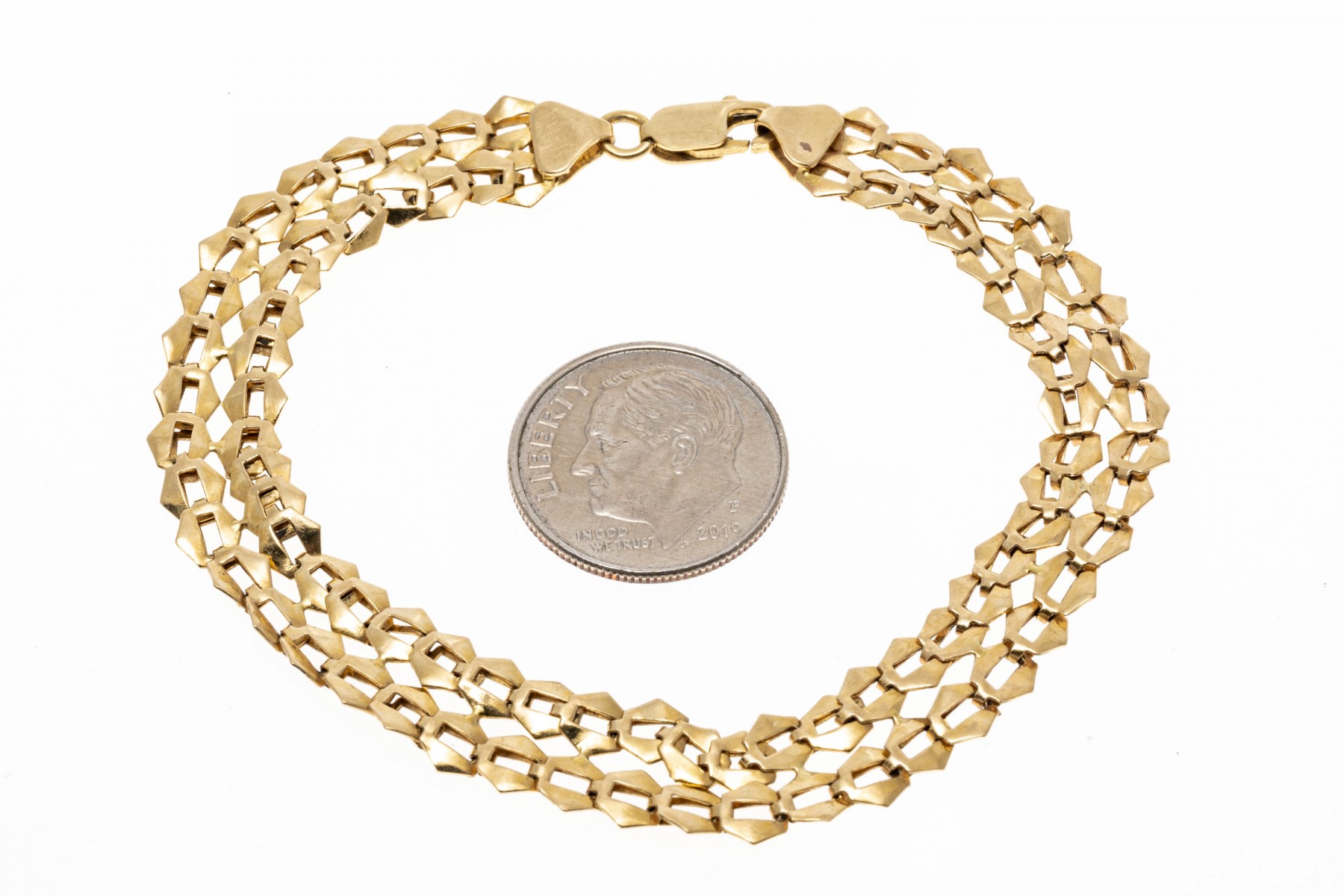 14K yellow gold bracelet. Repeating plate style links of polished yellow gold, securing with a lobster claw style clap.