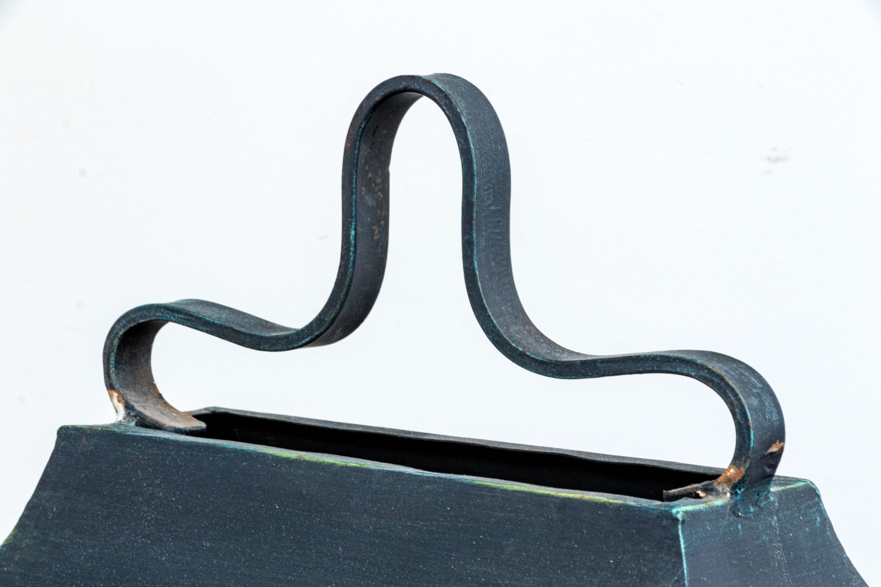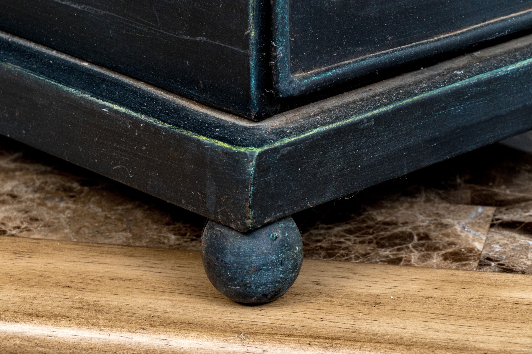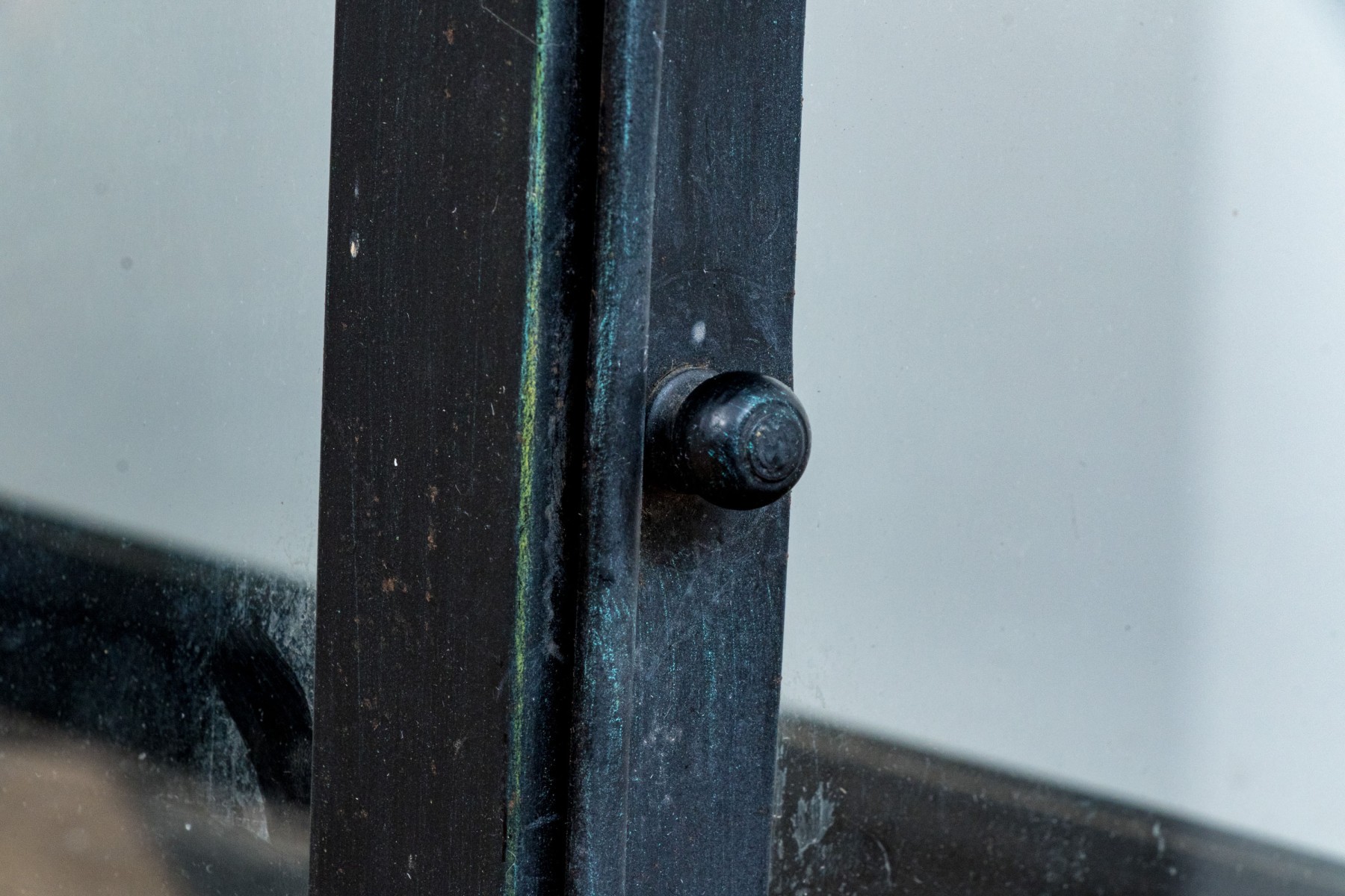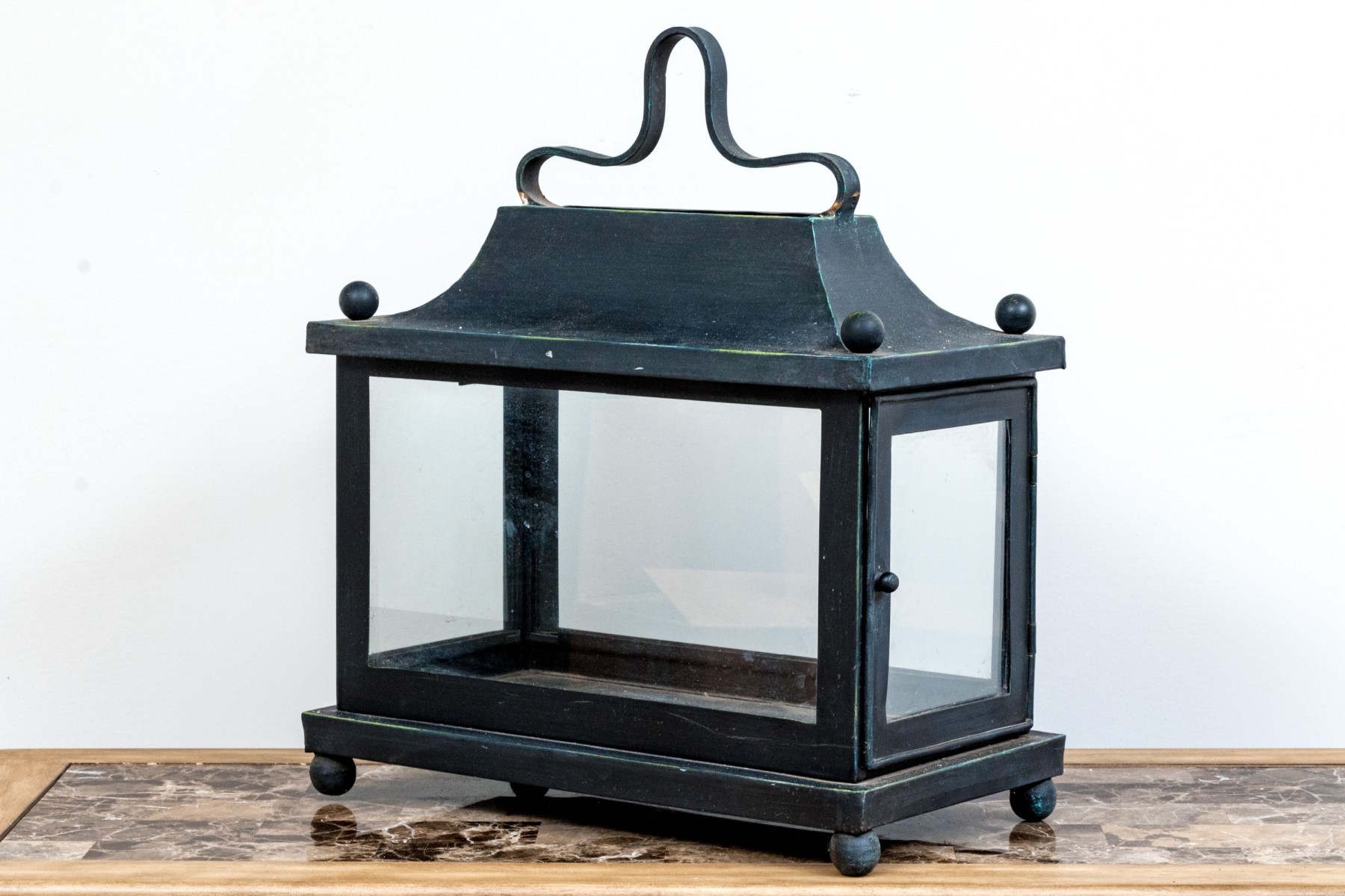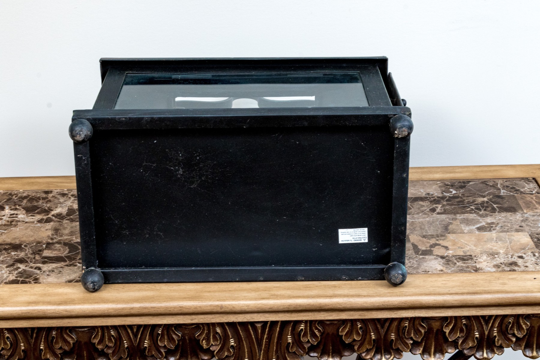 On four short feet with bronze finished metallic frame and glass panels around the exterior, one of which is a hinged door with arched handle.