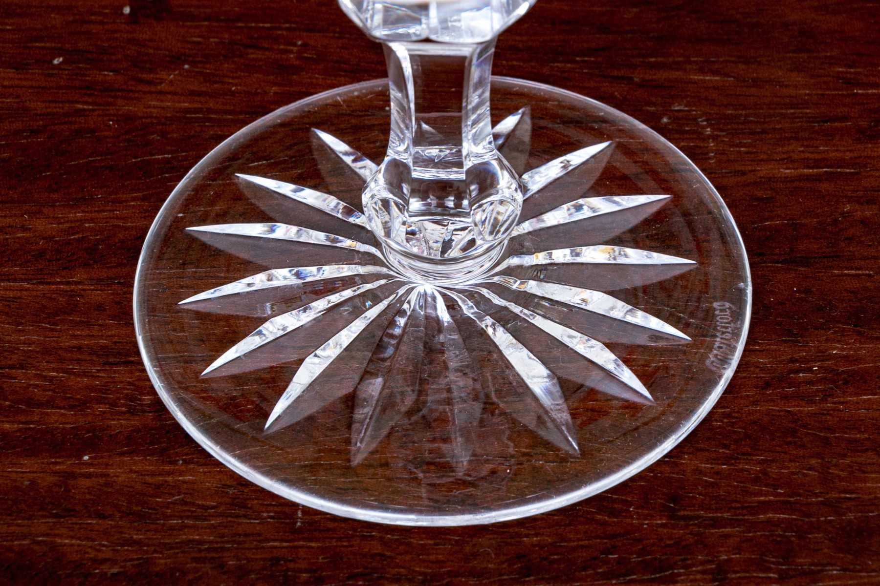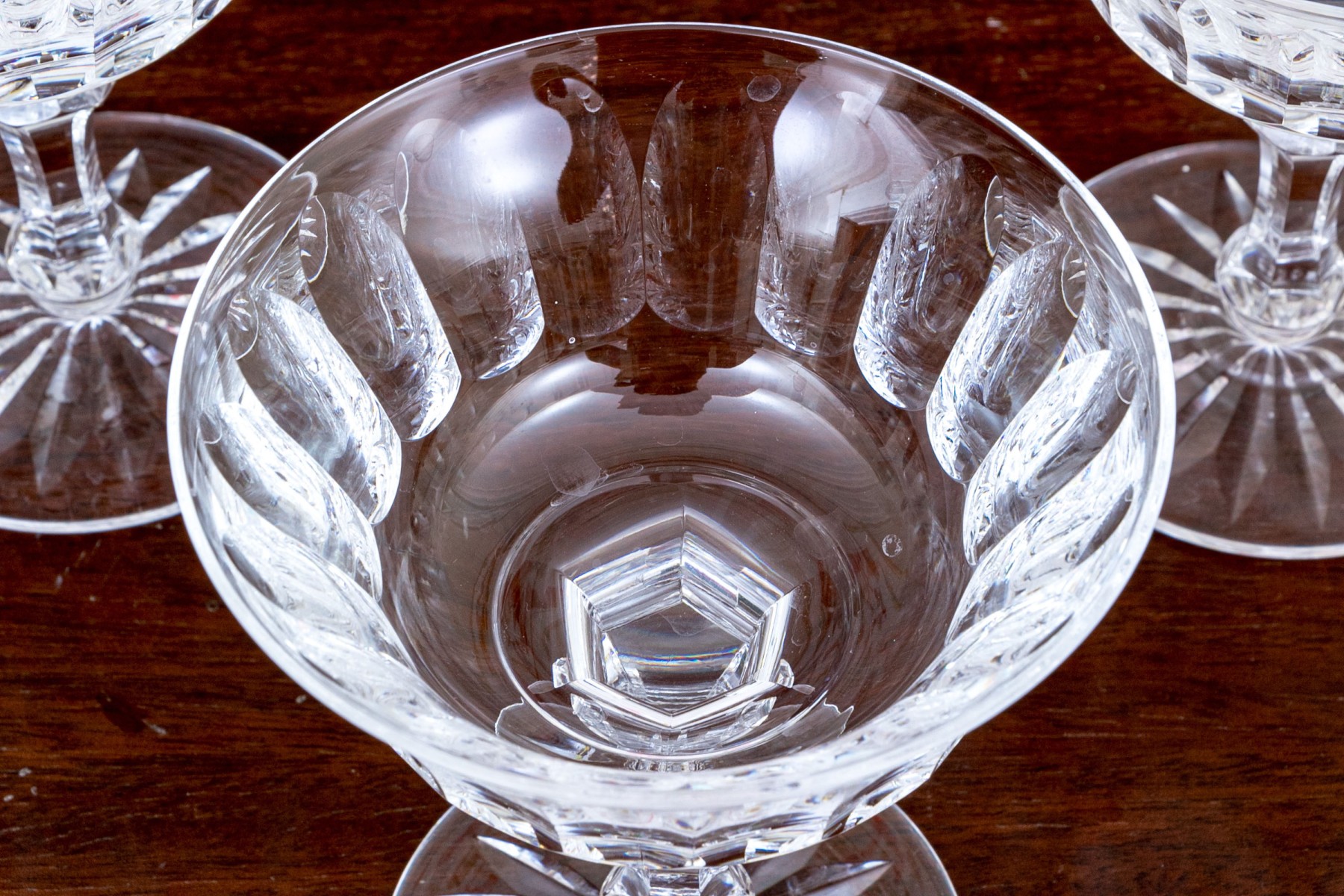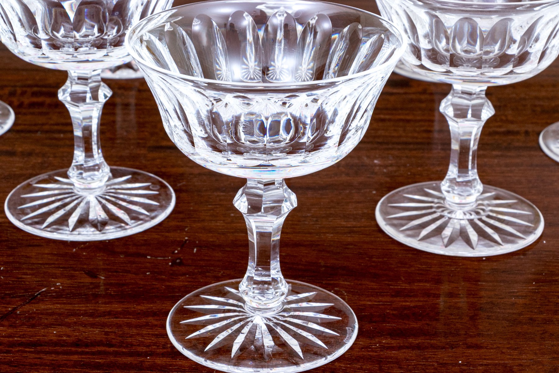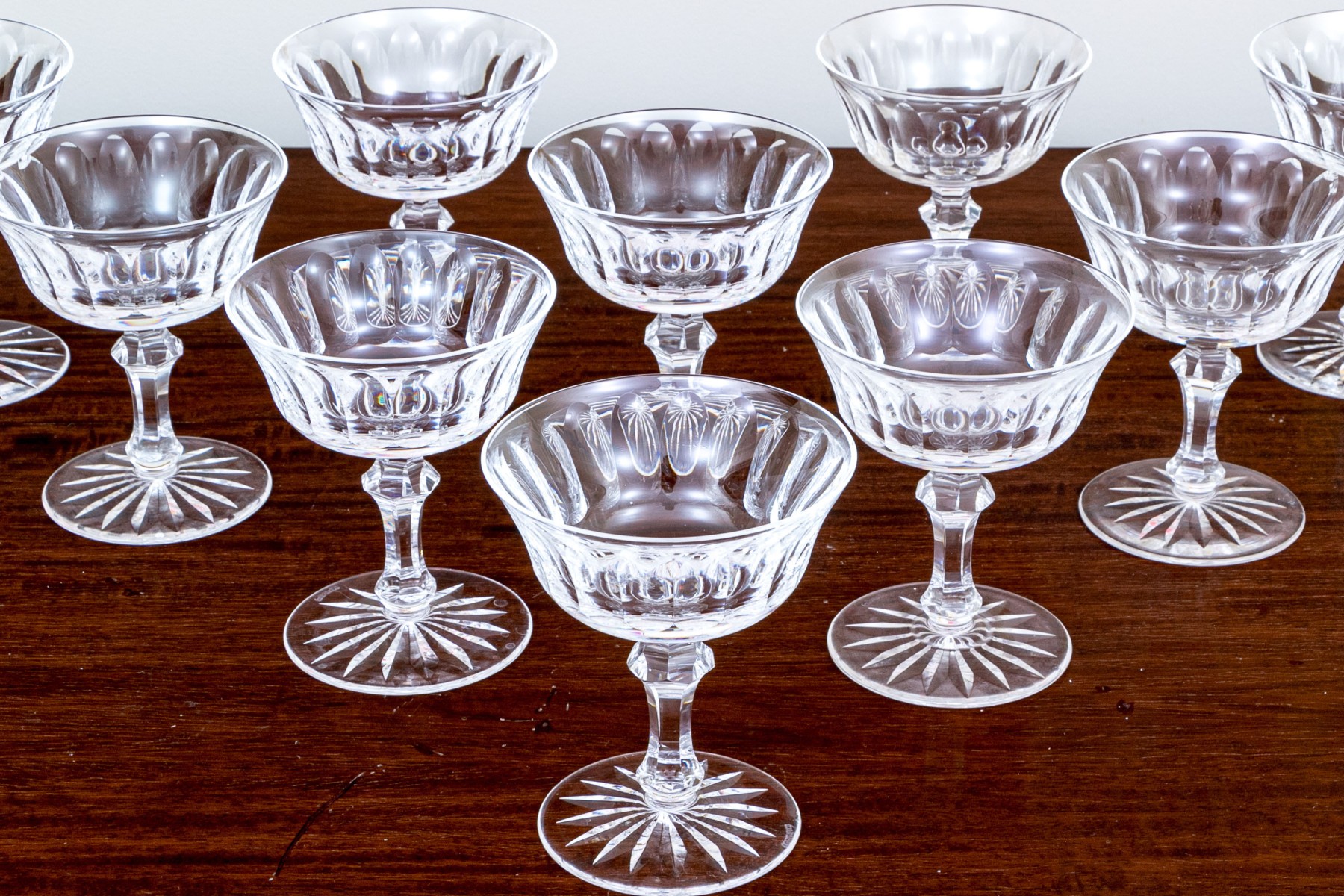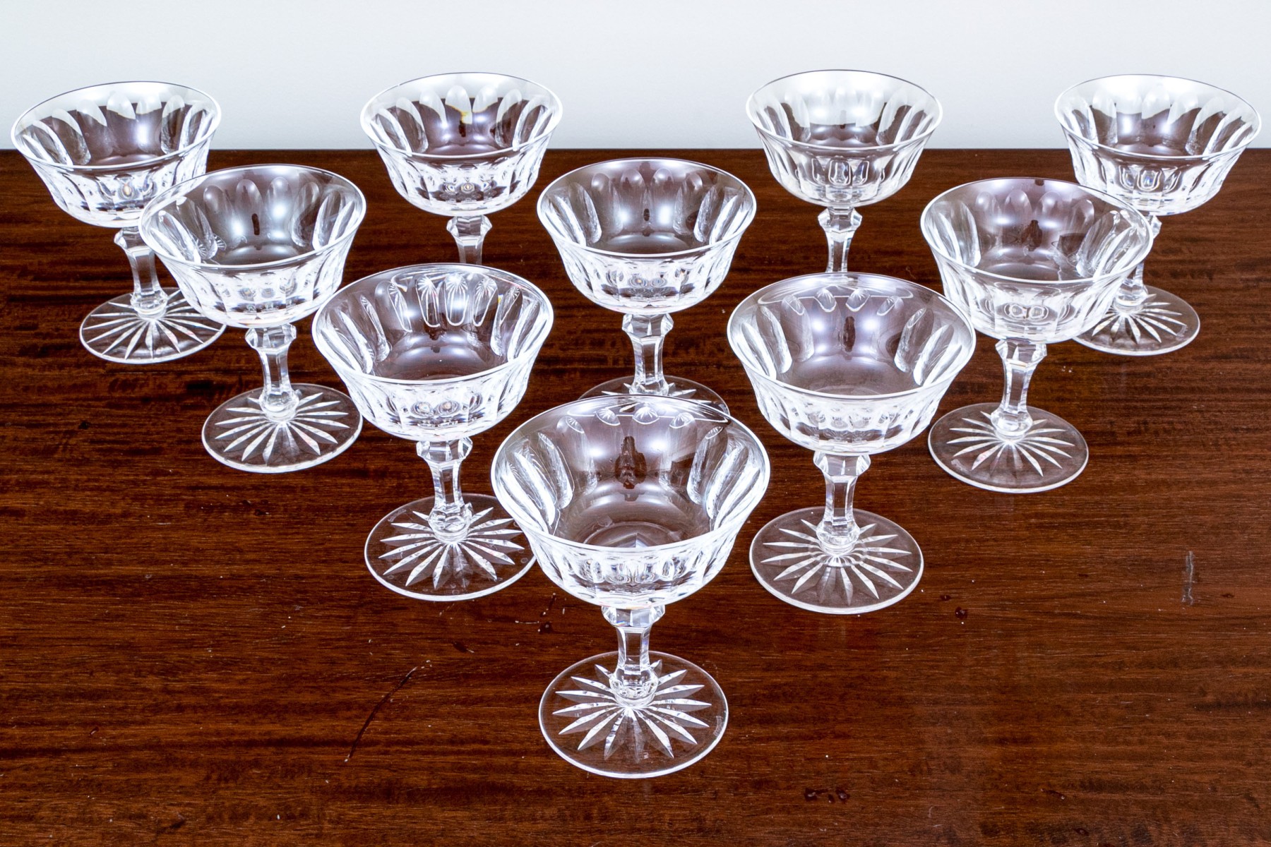 An excellent collection of ten Waterford Crystal champagne/tall sherbet coupes. The quality coupes are nicely weighted with the perfect thickness blending stability with elegance. Features subtly flared rims over wide cylindrical bowls cut with petaled fluting for dazzling shimmer. Faceted stems are flared at the top and bottom, following a concave curve. The circular feet are cut with radiating sunbursts, adding to the sophisticated style of the designs.