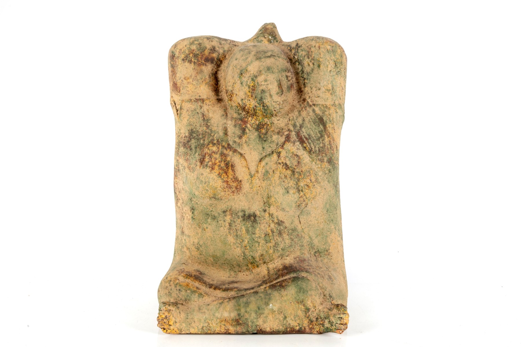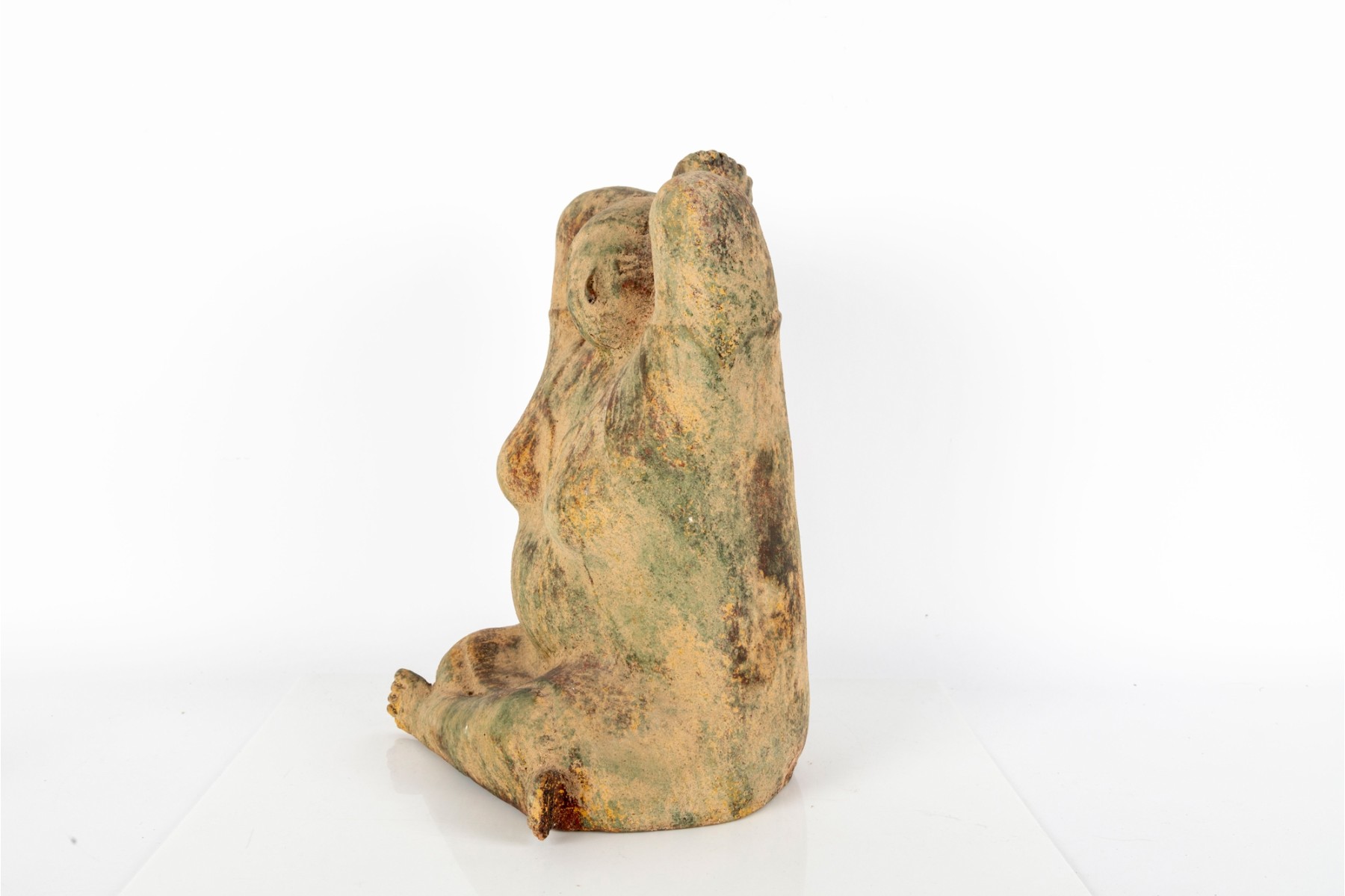 This is a weathered terra cotta garden sculpture depicting a seated woman with her arms raised behind her head. The aged patina, with traces of green and ochre hues, suggests exposure to the elements, enhancing its rustic appeal.