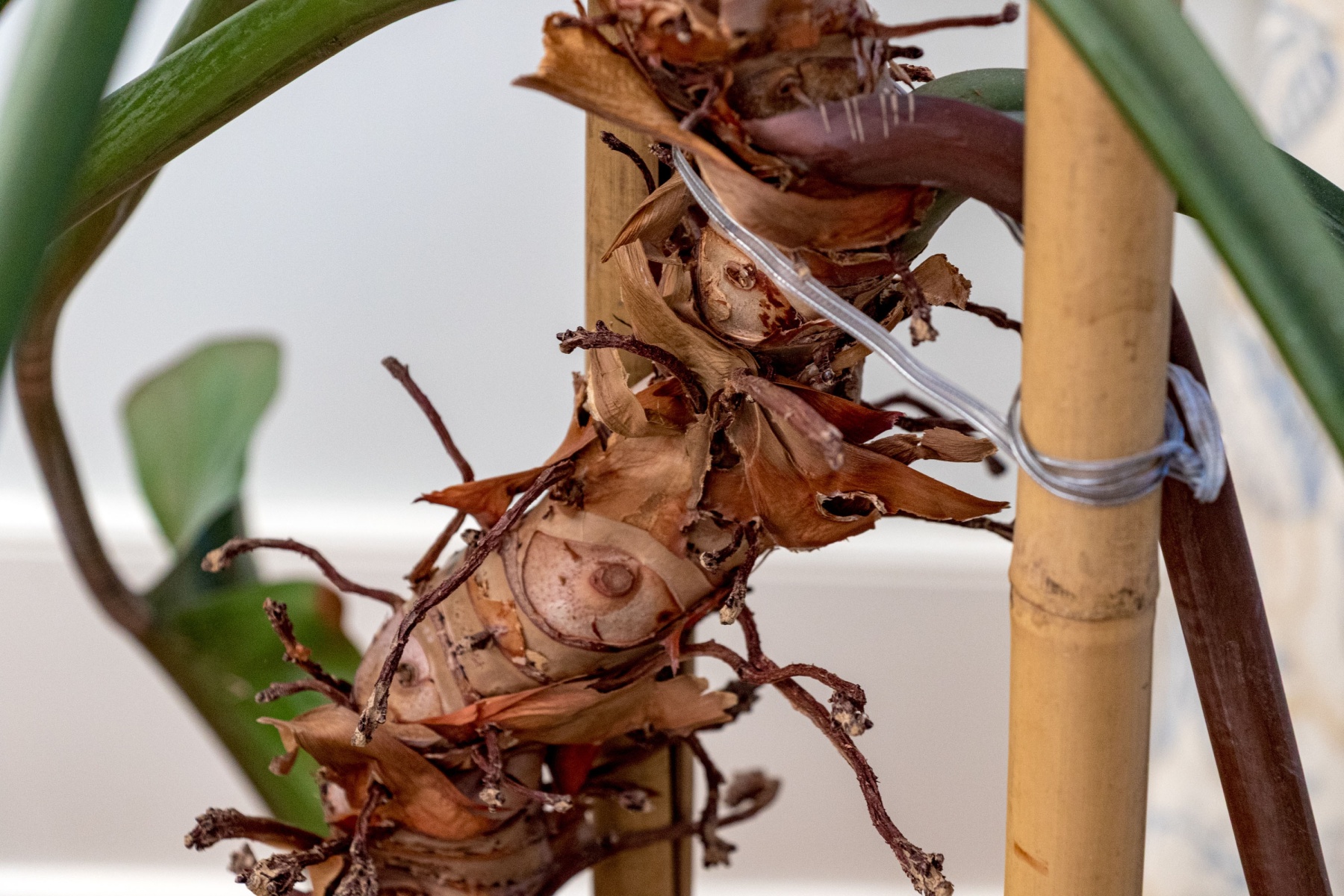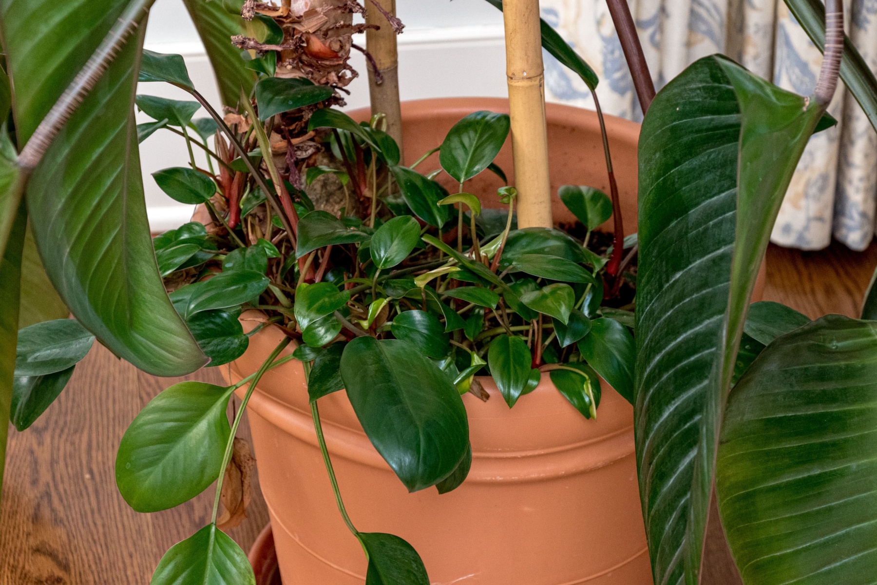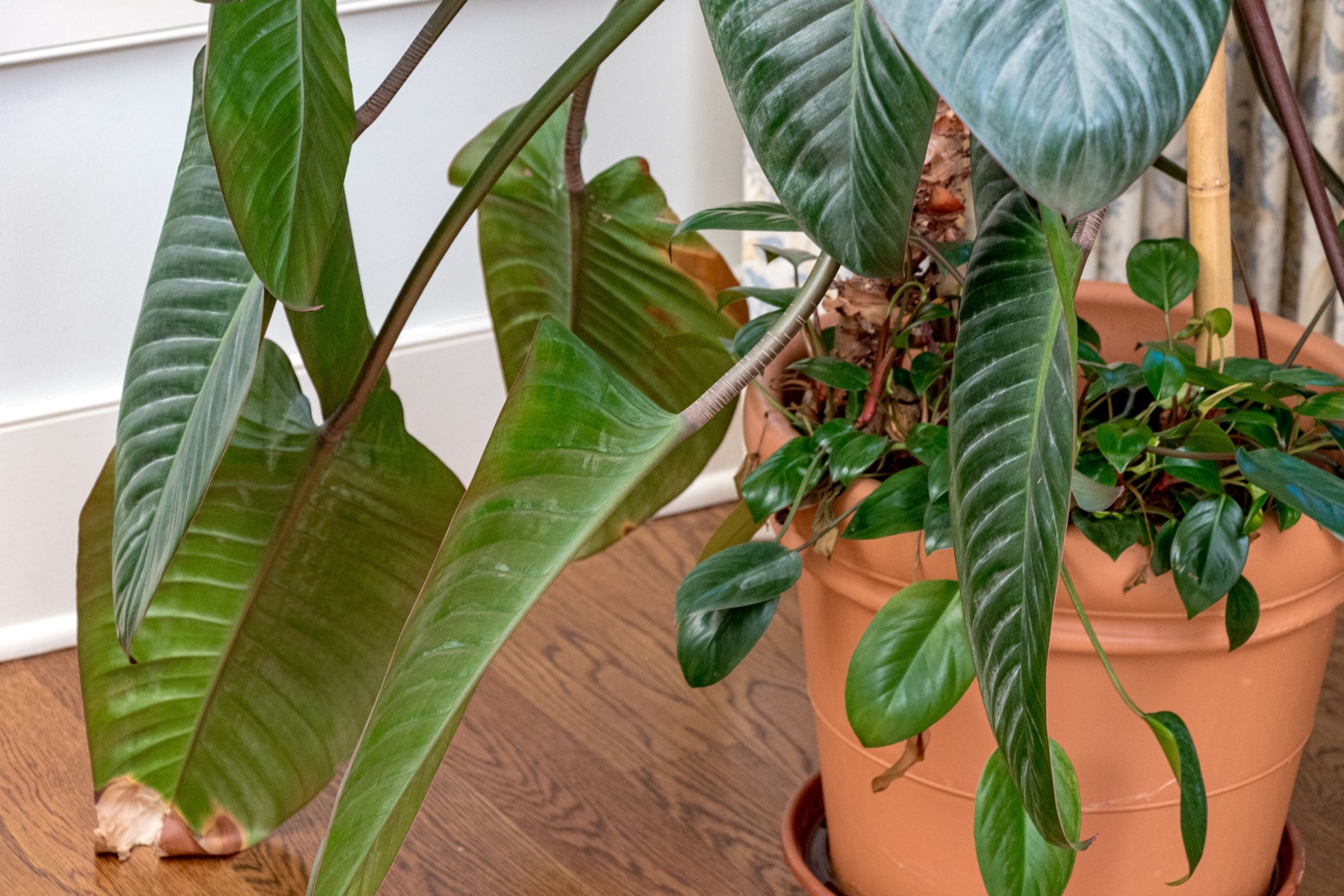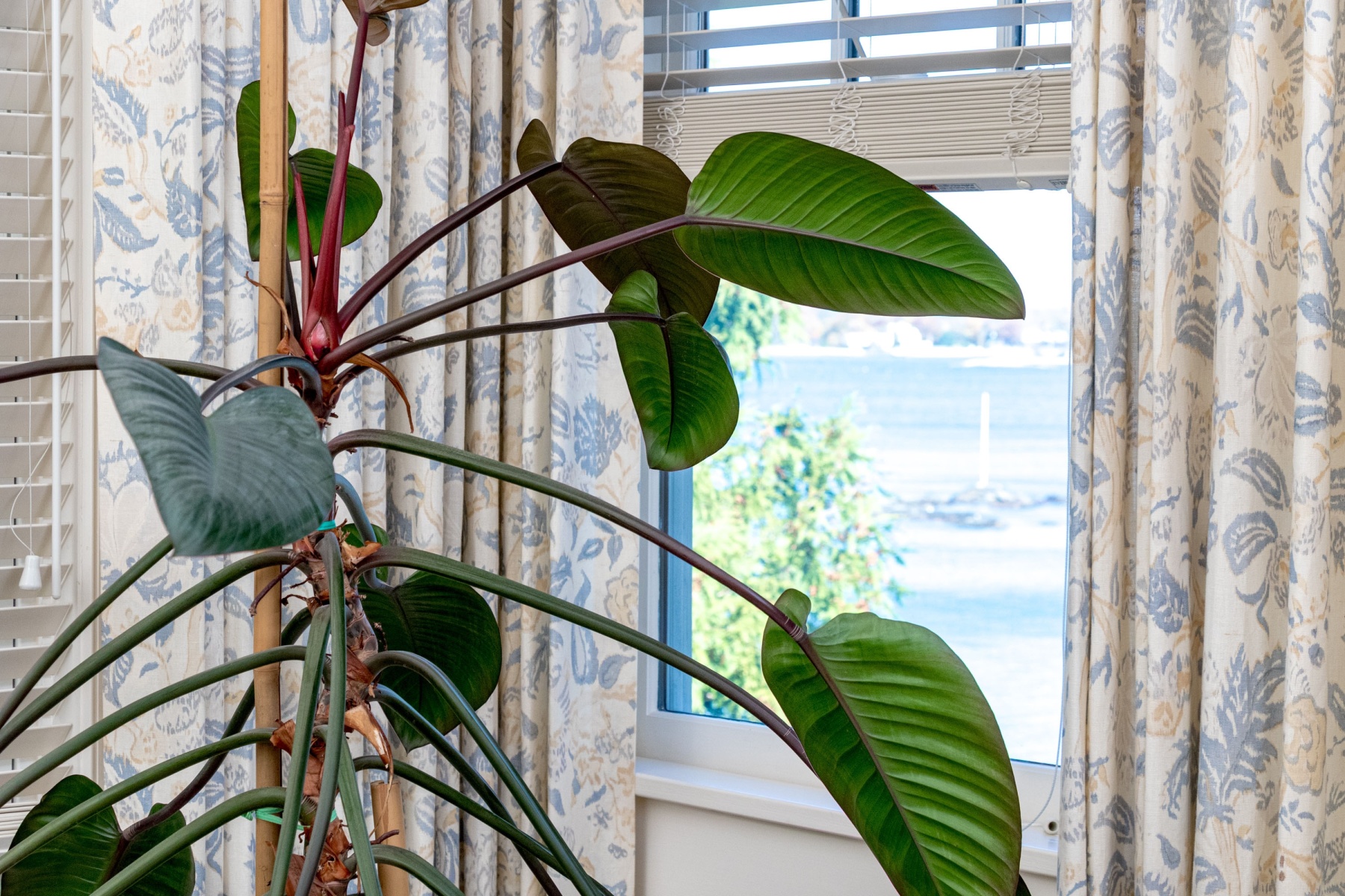 A lovely terracotta planter pot with an undertray. Includes a large palm plant with an impressive arrangement of leaves emerging from the center stalk.