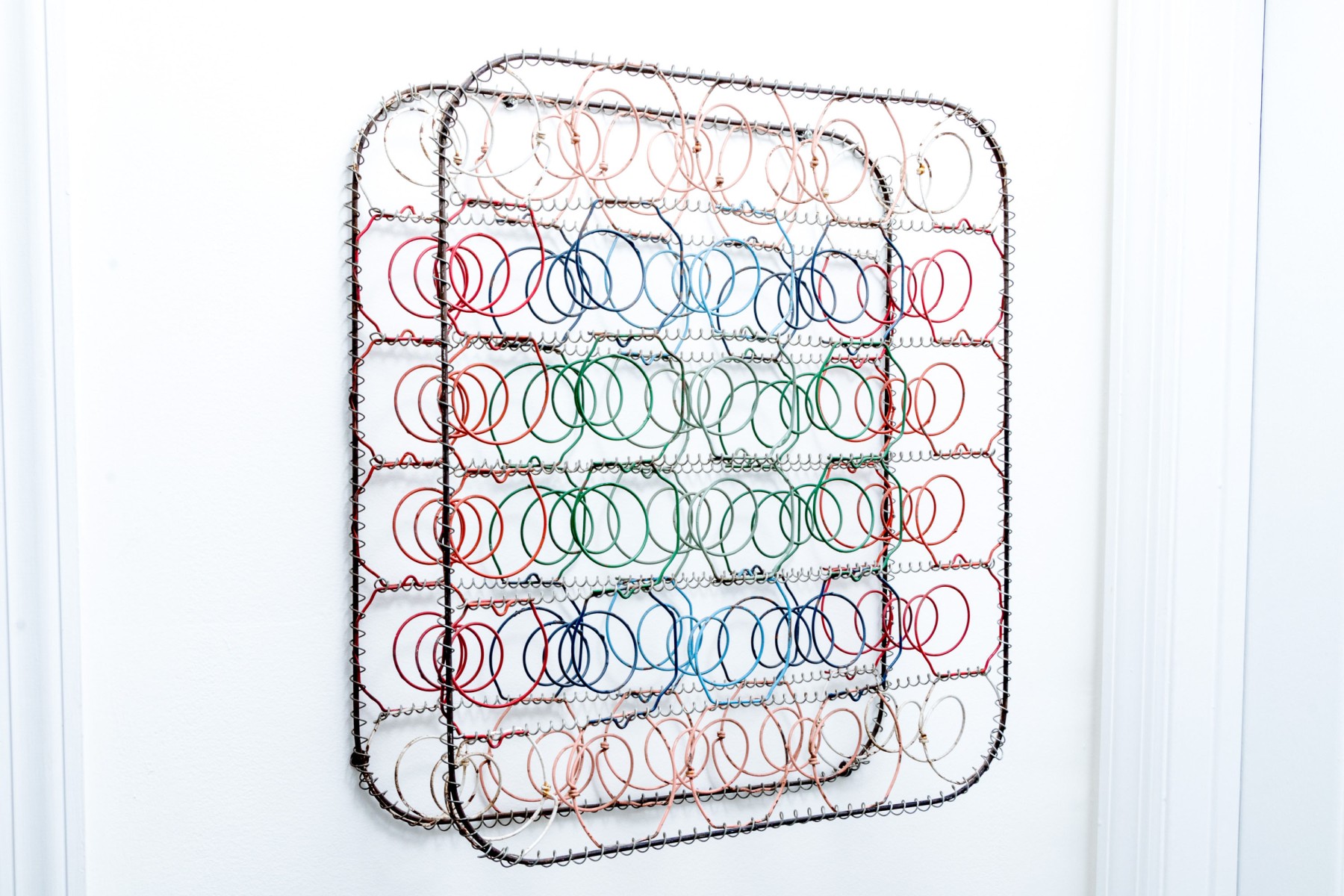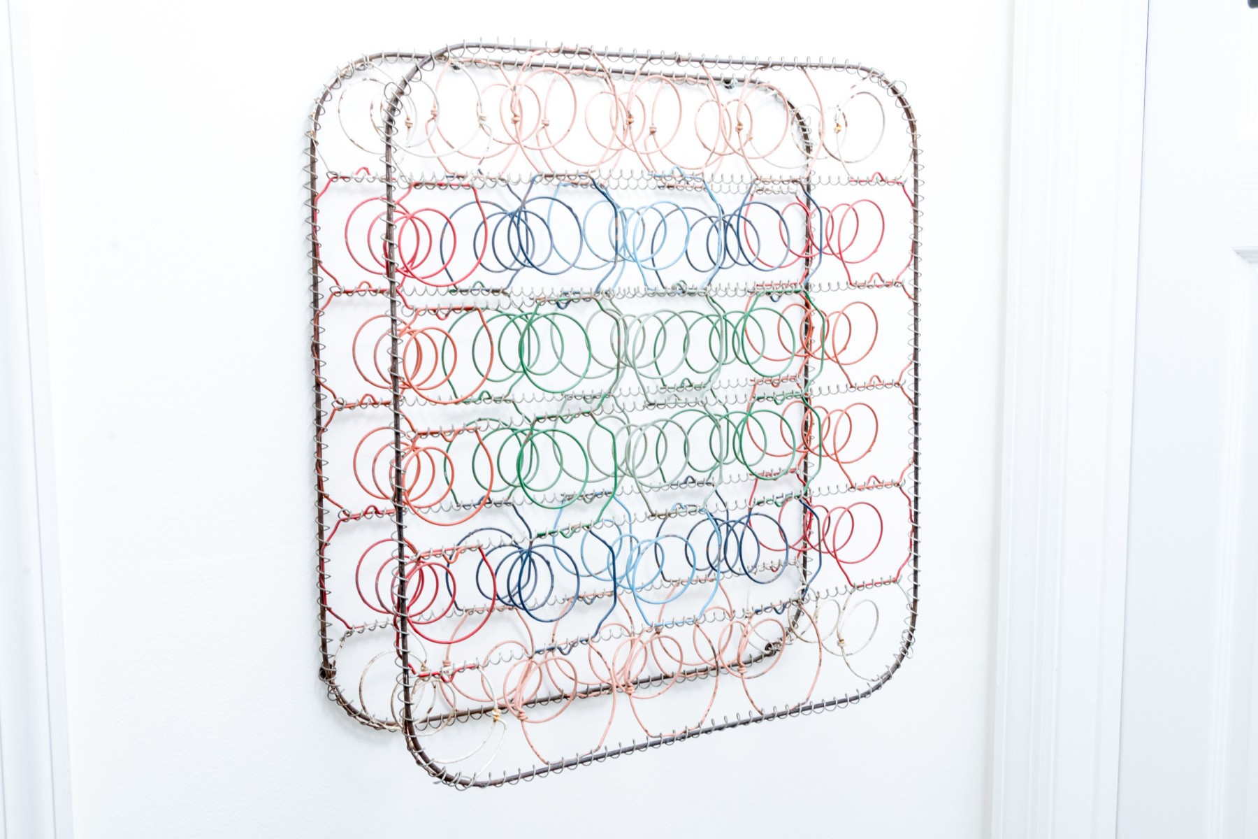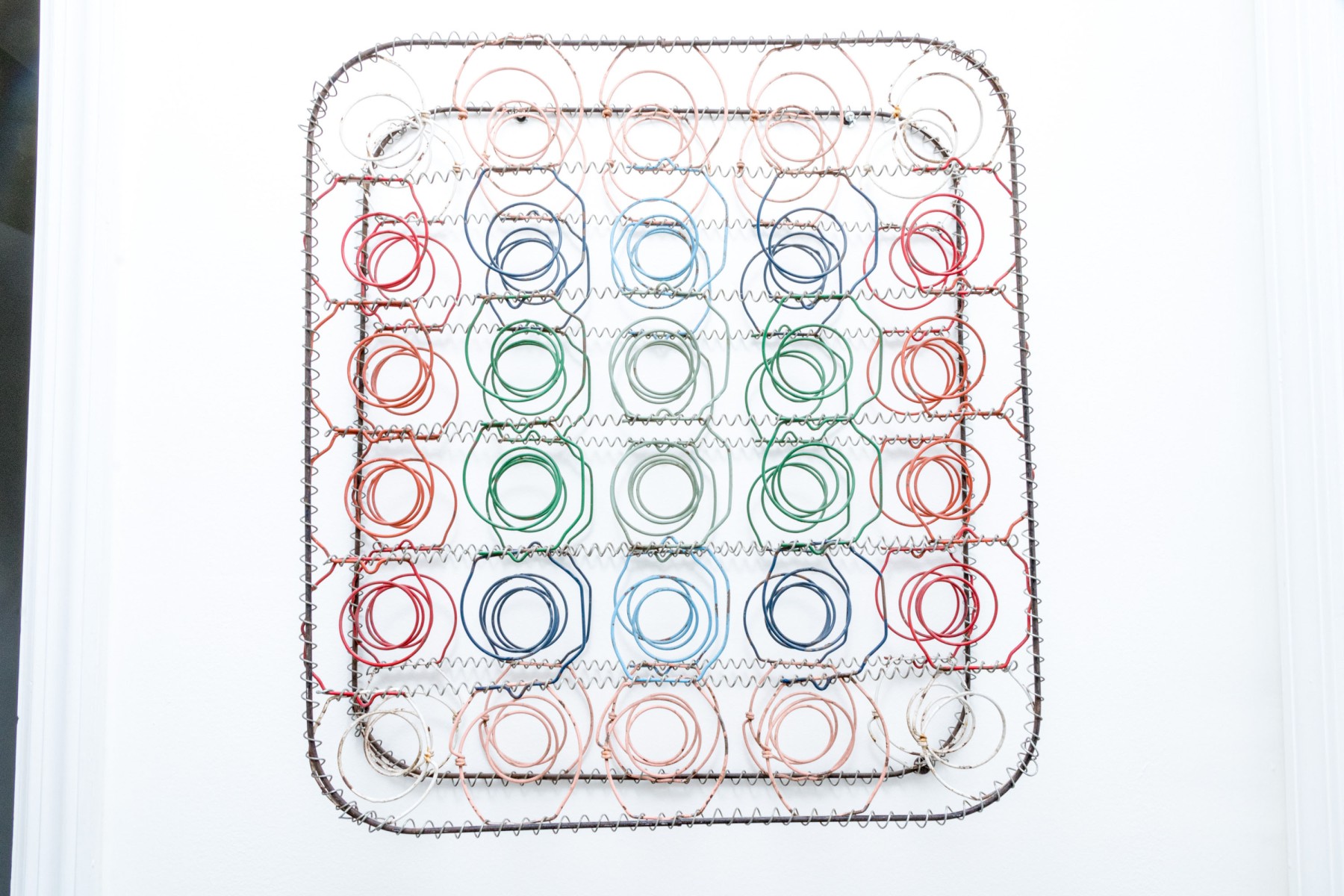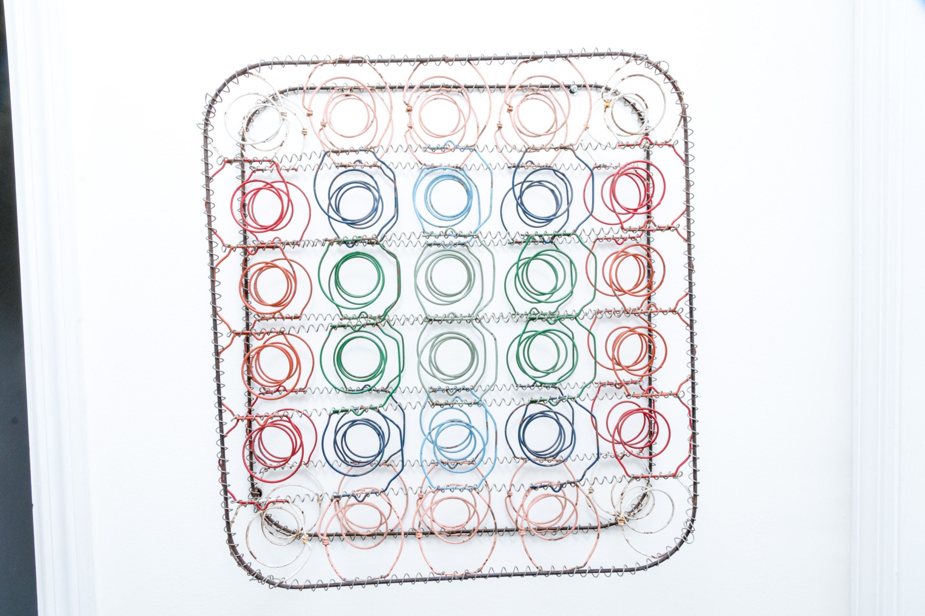 A unique mixed media metal wall sculpture incorporating industrial chic and just a touch of postmodern stylish flare, with rounded rectangular frames wrapped in spiraling wire supporting a grid of colorful springs in rd, blue, orange, and green to create a form reminiscent of a boxspring.