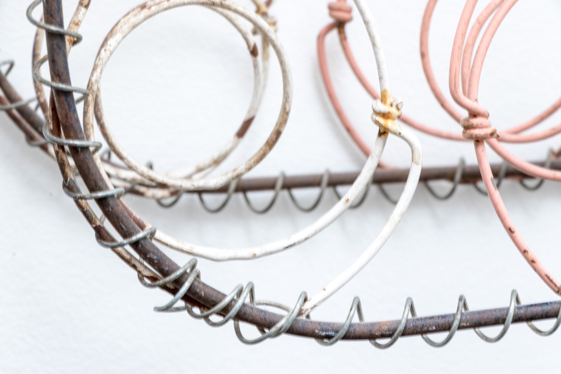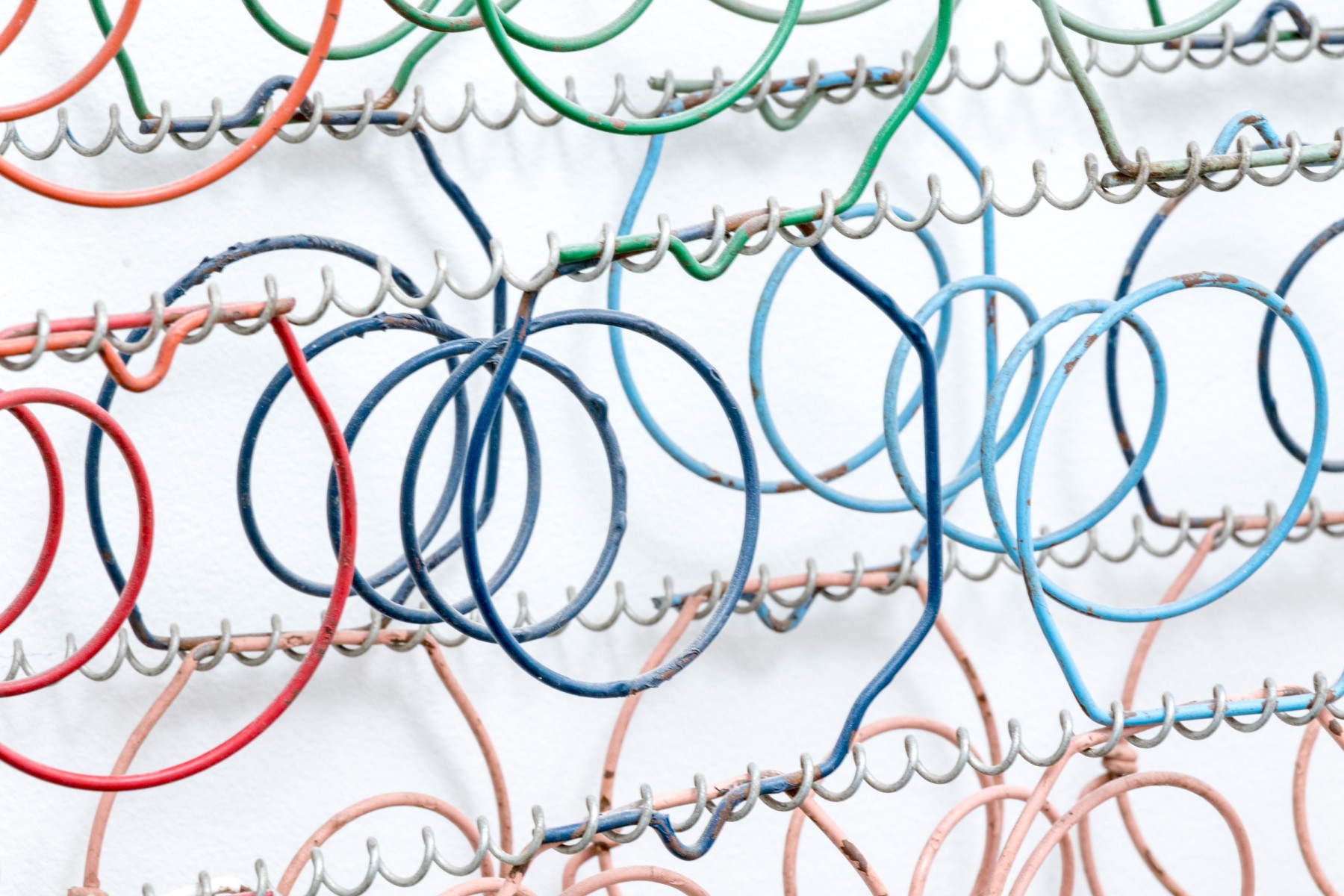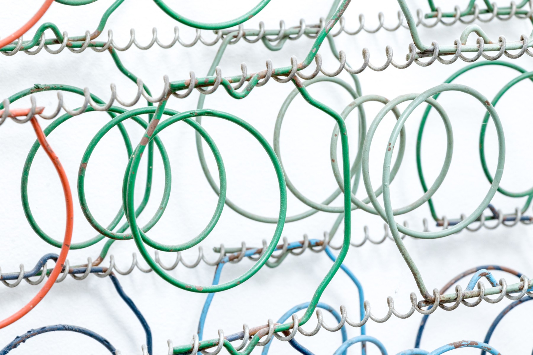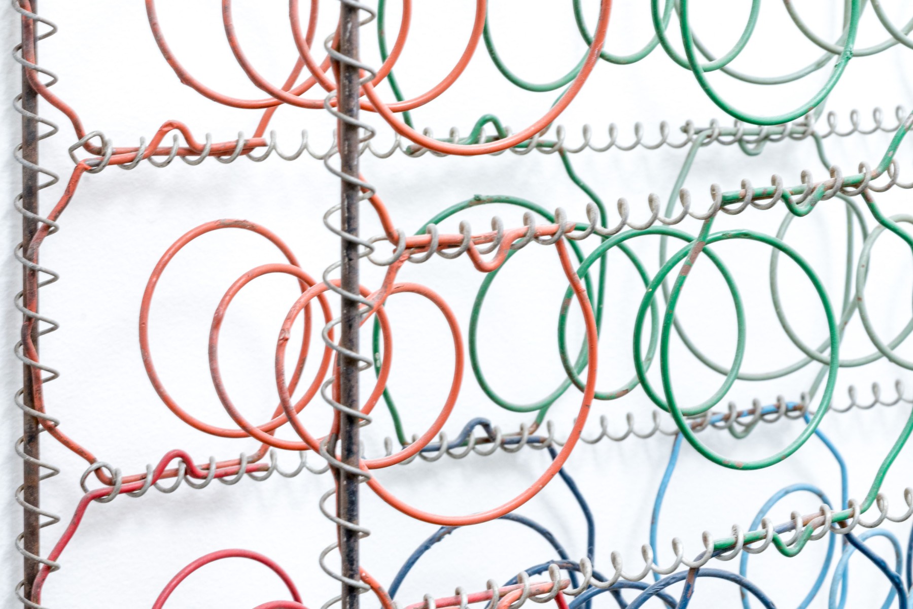 A unique mixed media metal wall sculpture incorporating industrial chic and just a touch of postmodern stylish flare, with rounded rectangular frames wrapped in spiraling wire supporting a grid of colorful springs in rd, blue, orange, and green to create a form reminiscent of a boxspring.