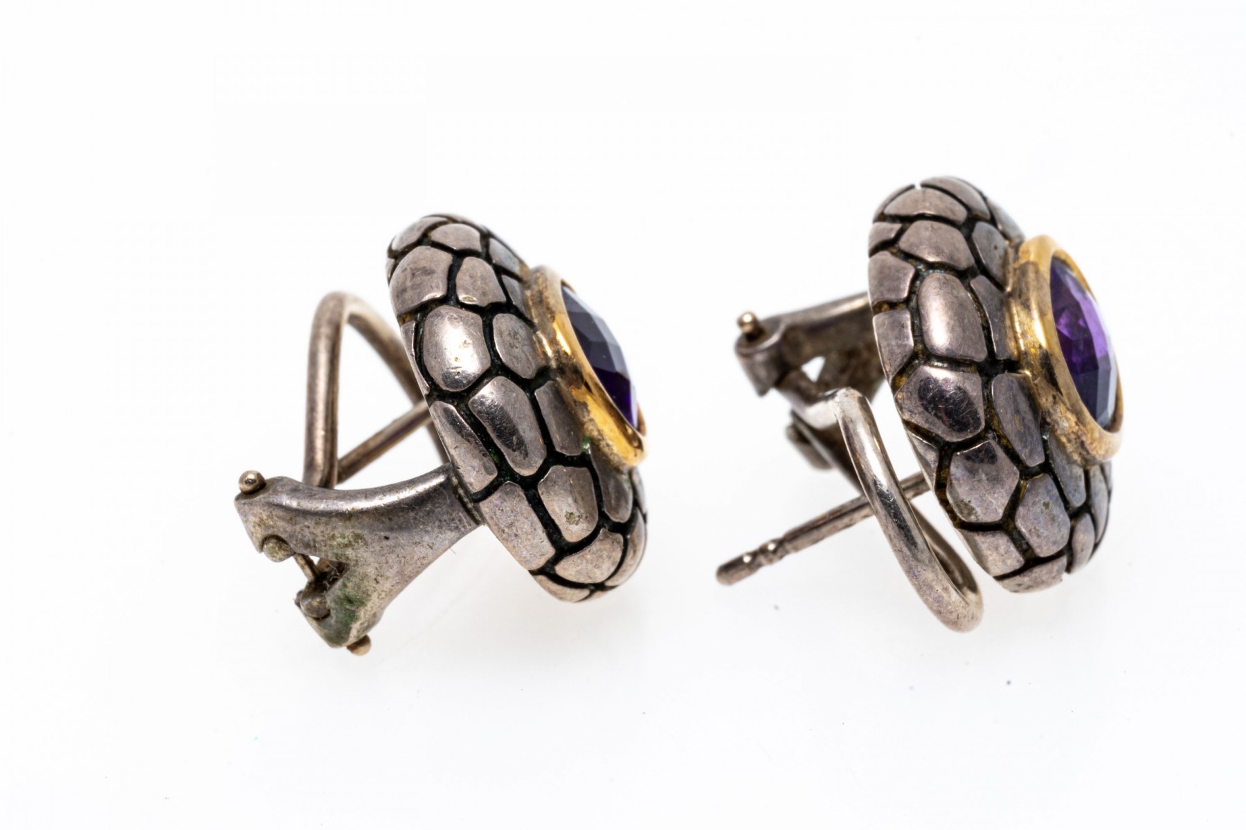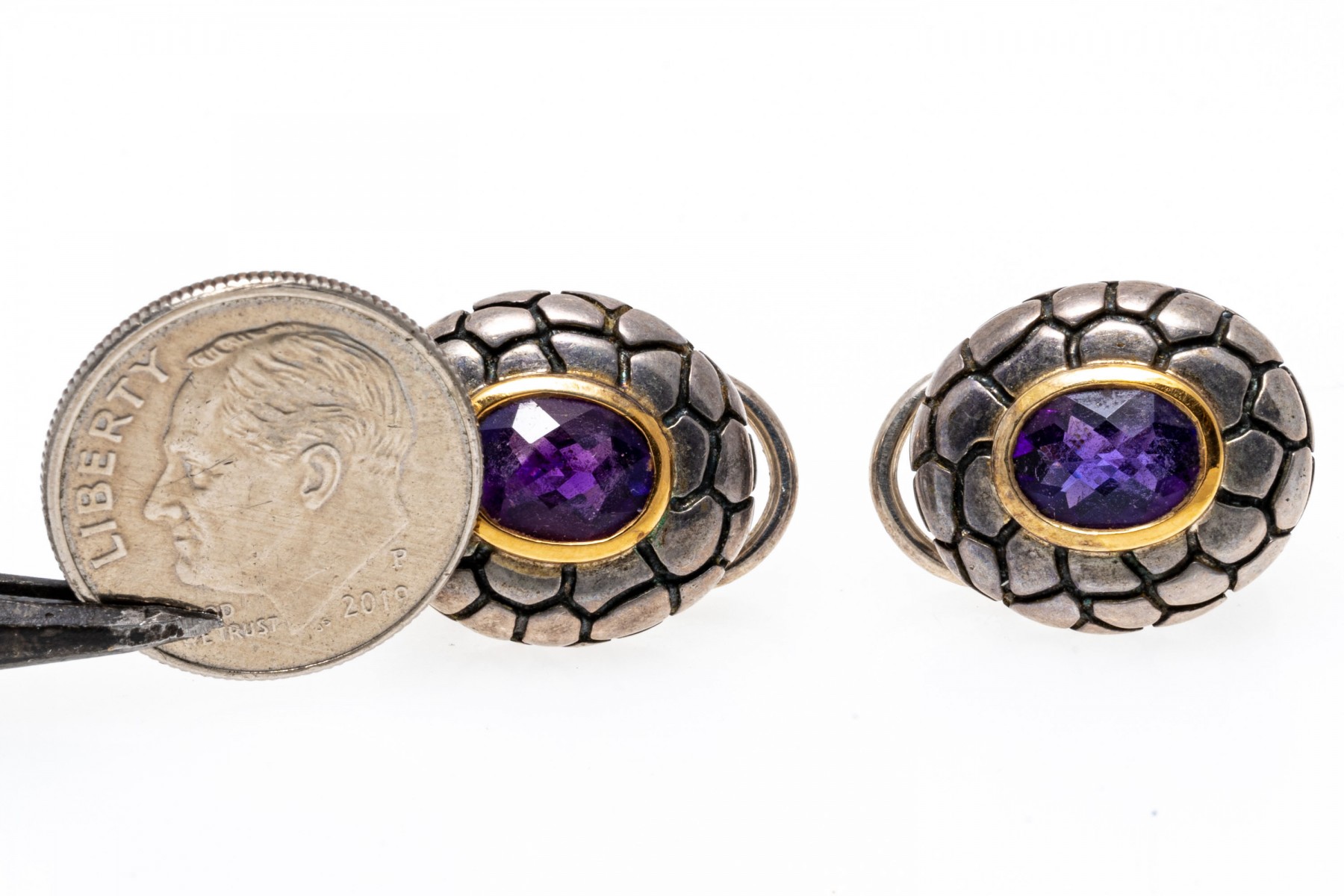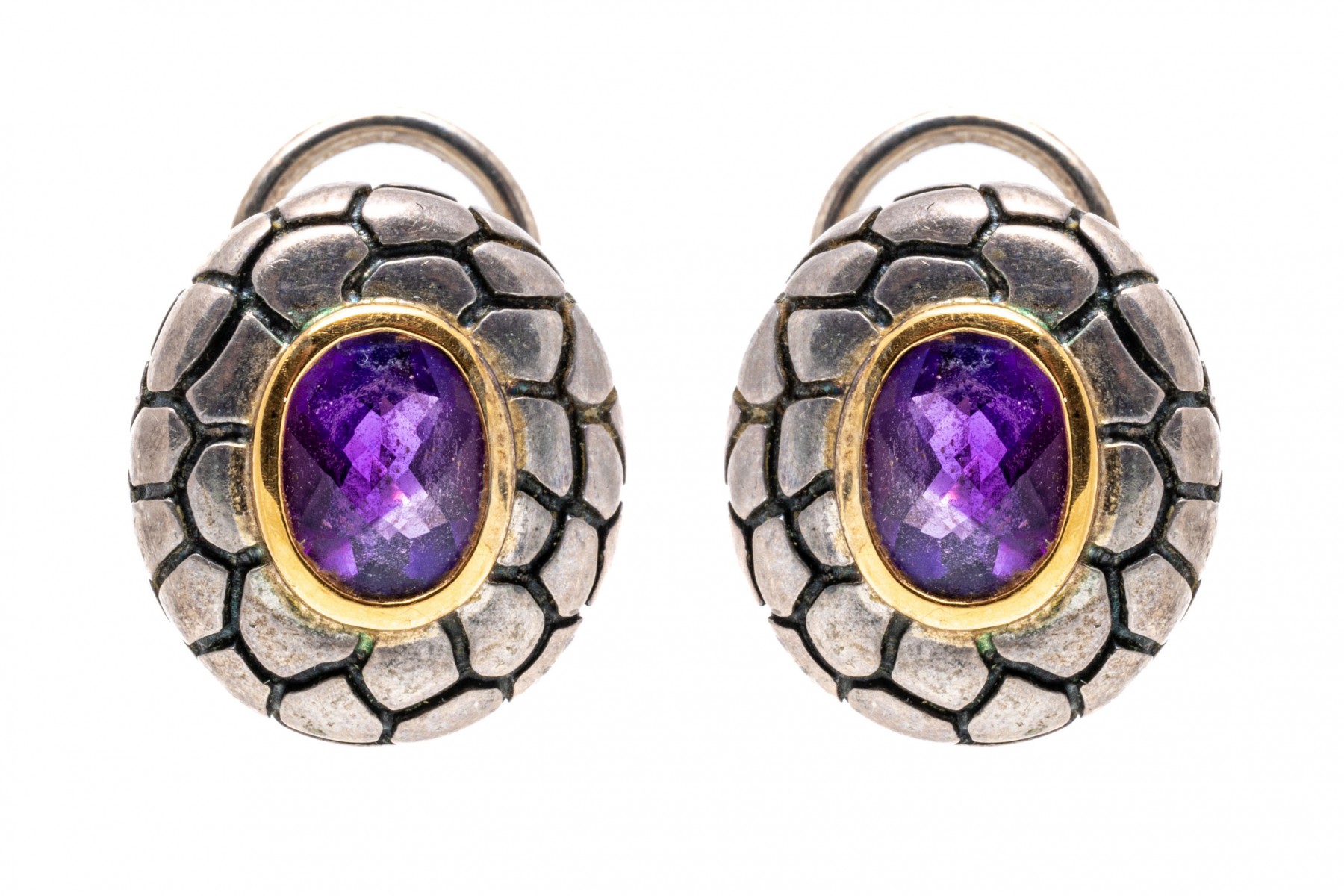 A pair of sterling silver earrings with a textured design. With in an 14K yellow gold bezel setting are oval faceted amethyst with a bright purple color. Post and omega backings.