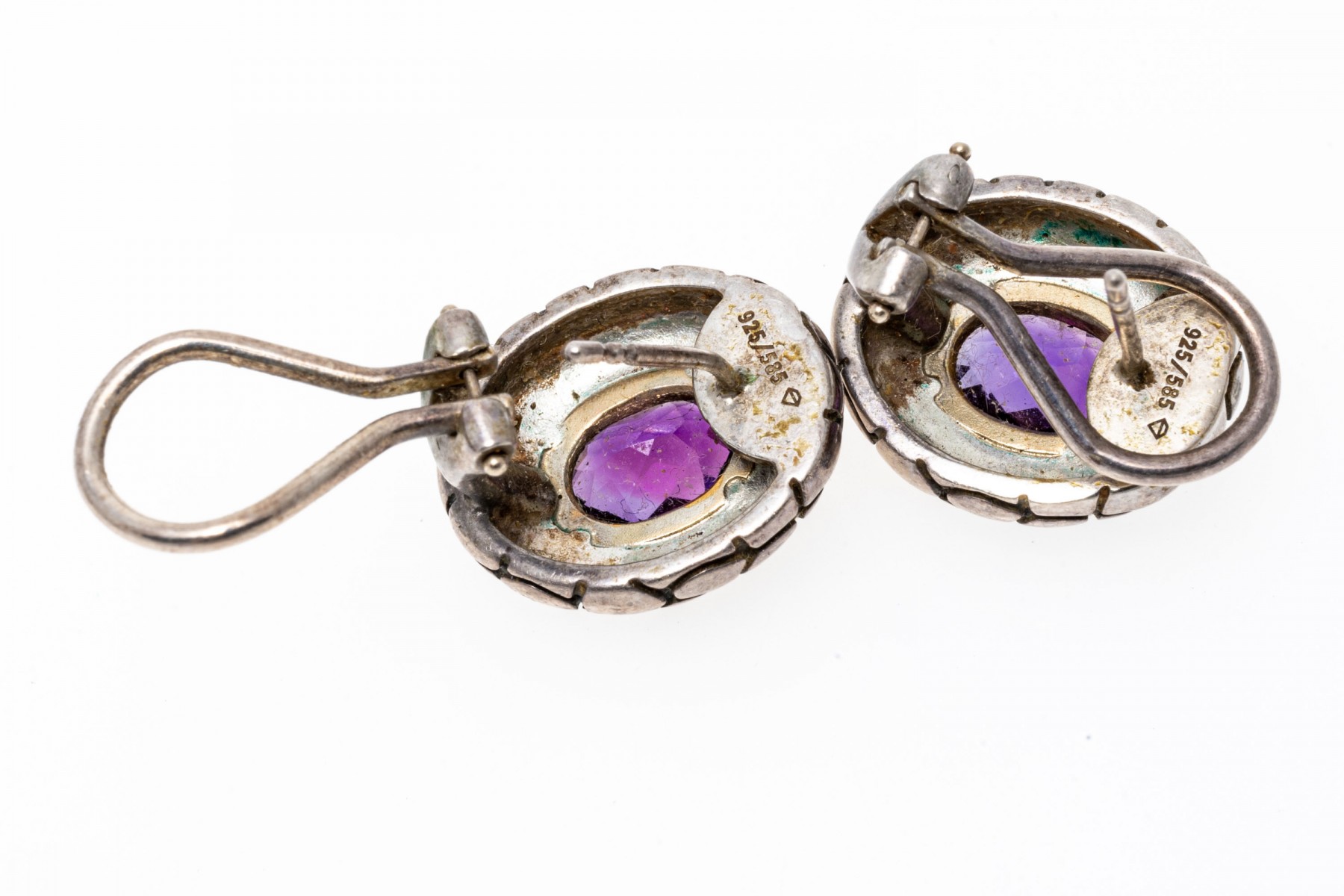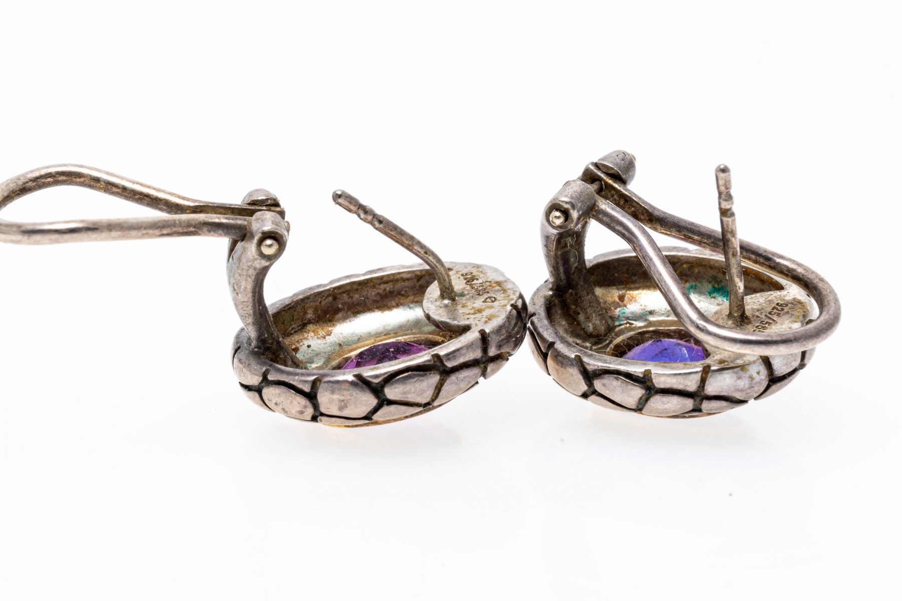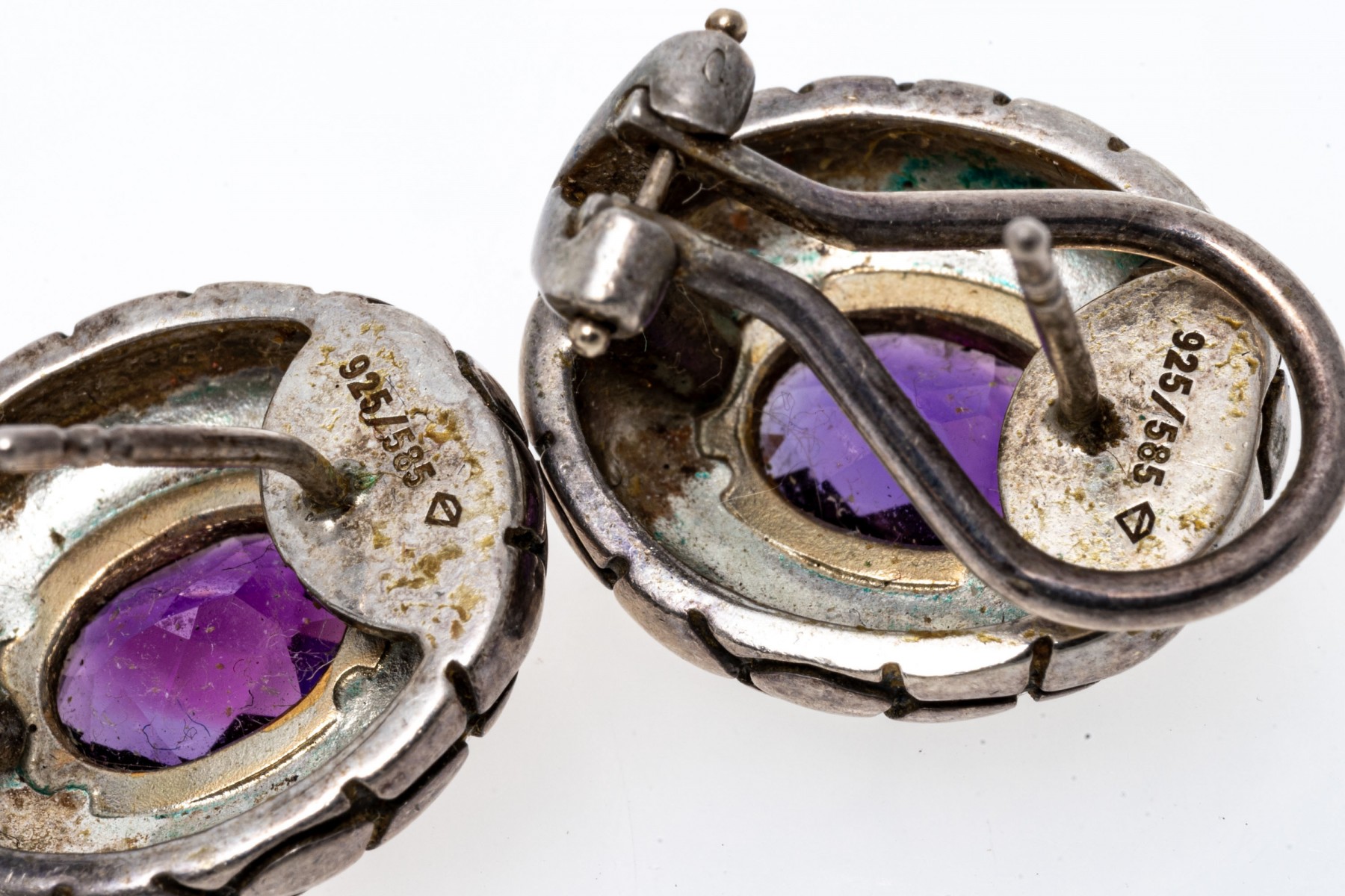 A pair of sterling silver earrings with a textured design. With in an 14K yellow gold bezel setting are oval faceted amethyst with a bright purple color. Post and omega backings.