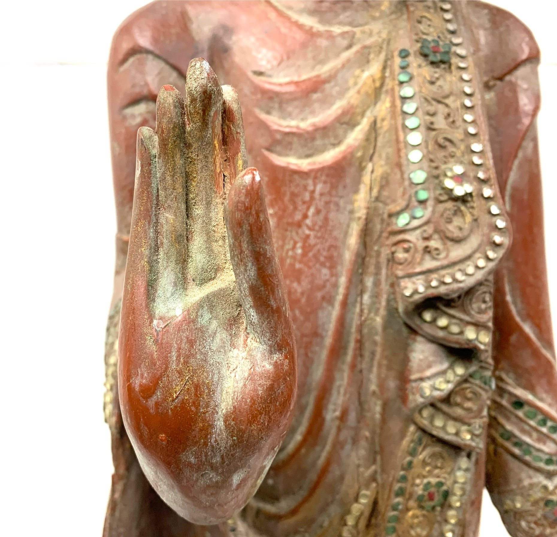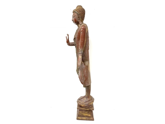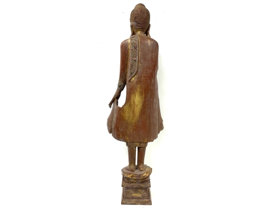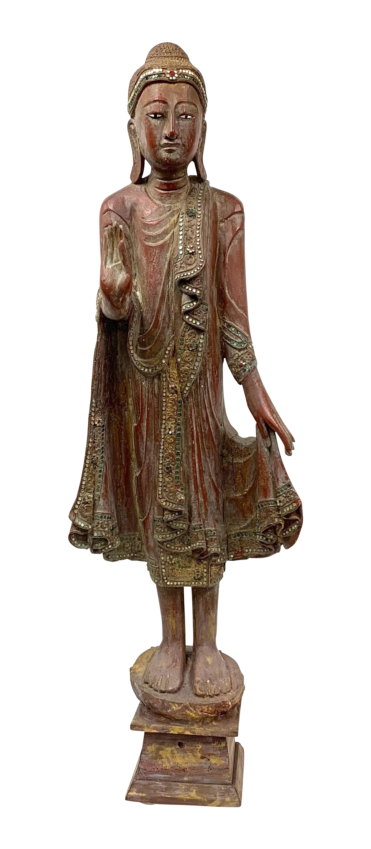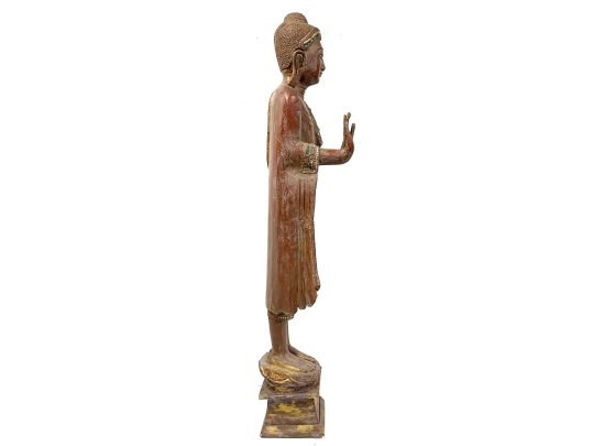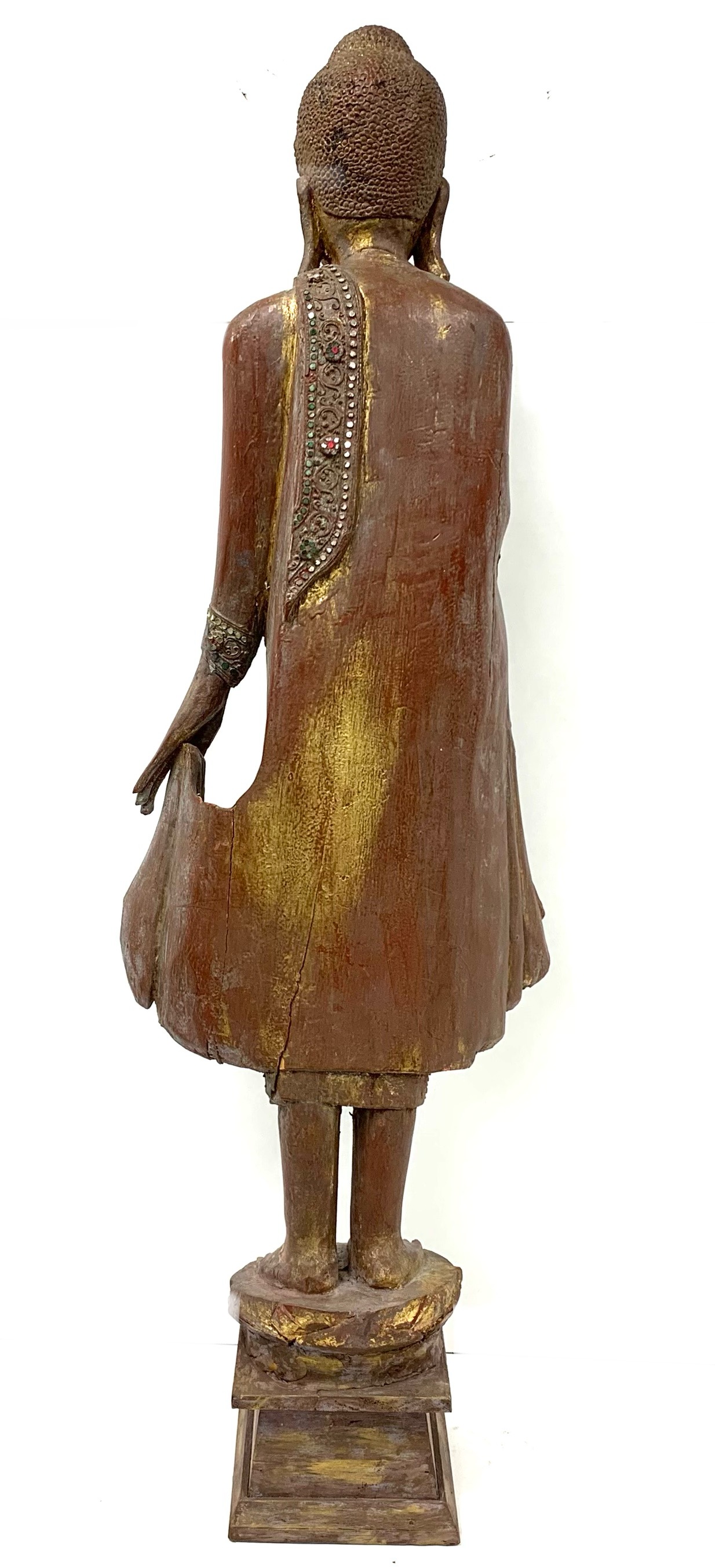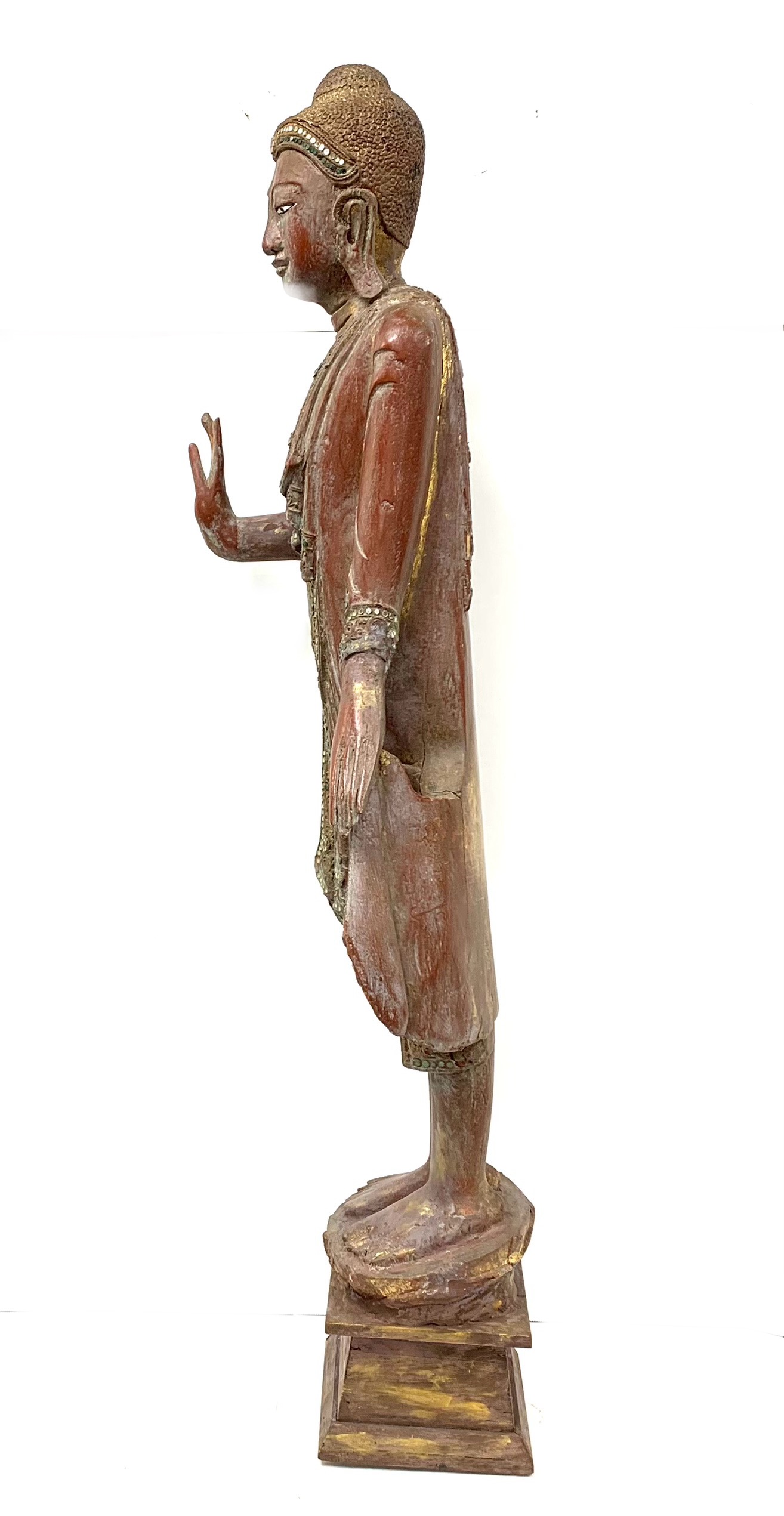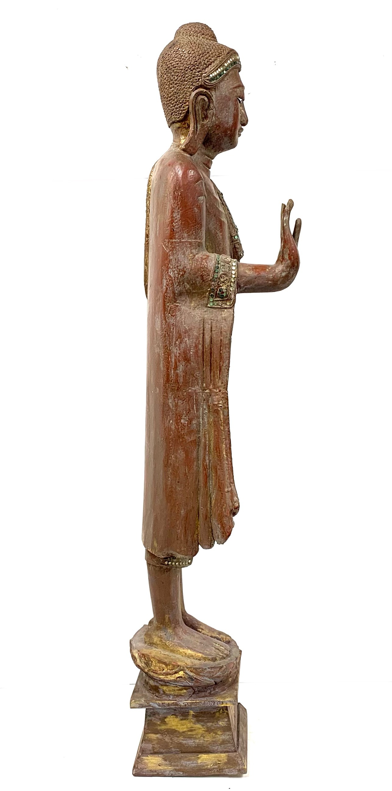 A large carved wood standing Buddha likely from Burma in the Mandalay style. The wooden statue is gilded and decorated with colorful inset mosaic glass stones. It features characteristics including an oval face, elongated arms and fingers and meticulously carved drapery. The statue resting on a lotus leaf and surmounted on a plinth base.
