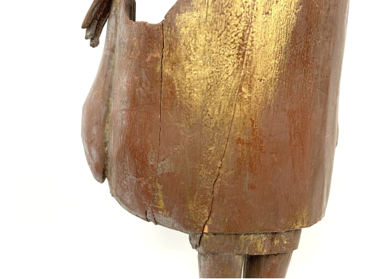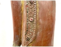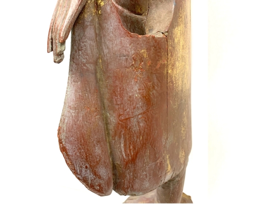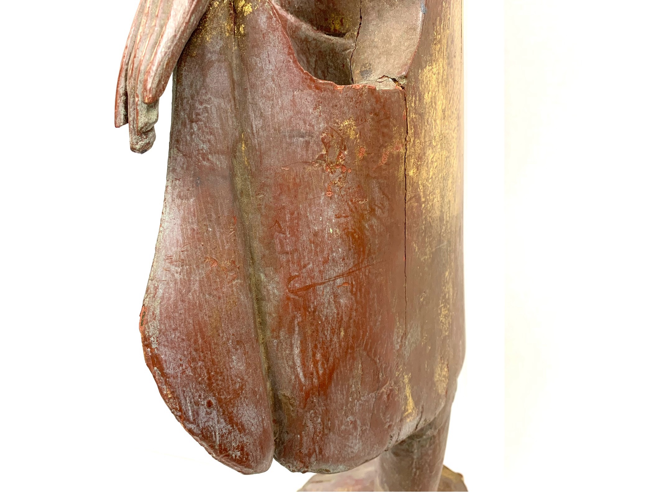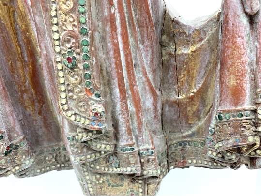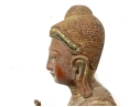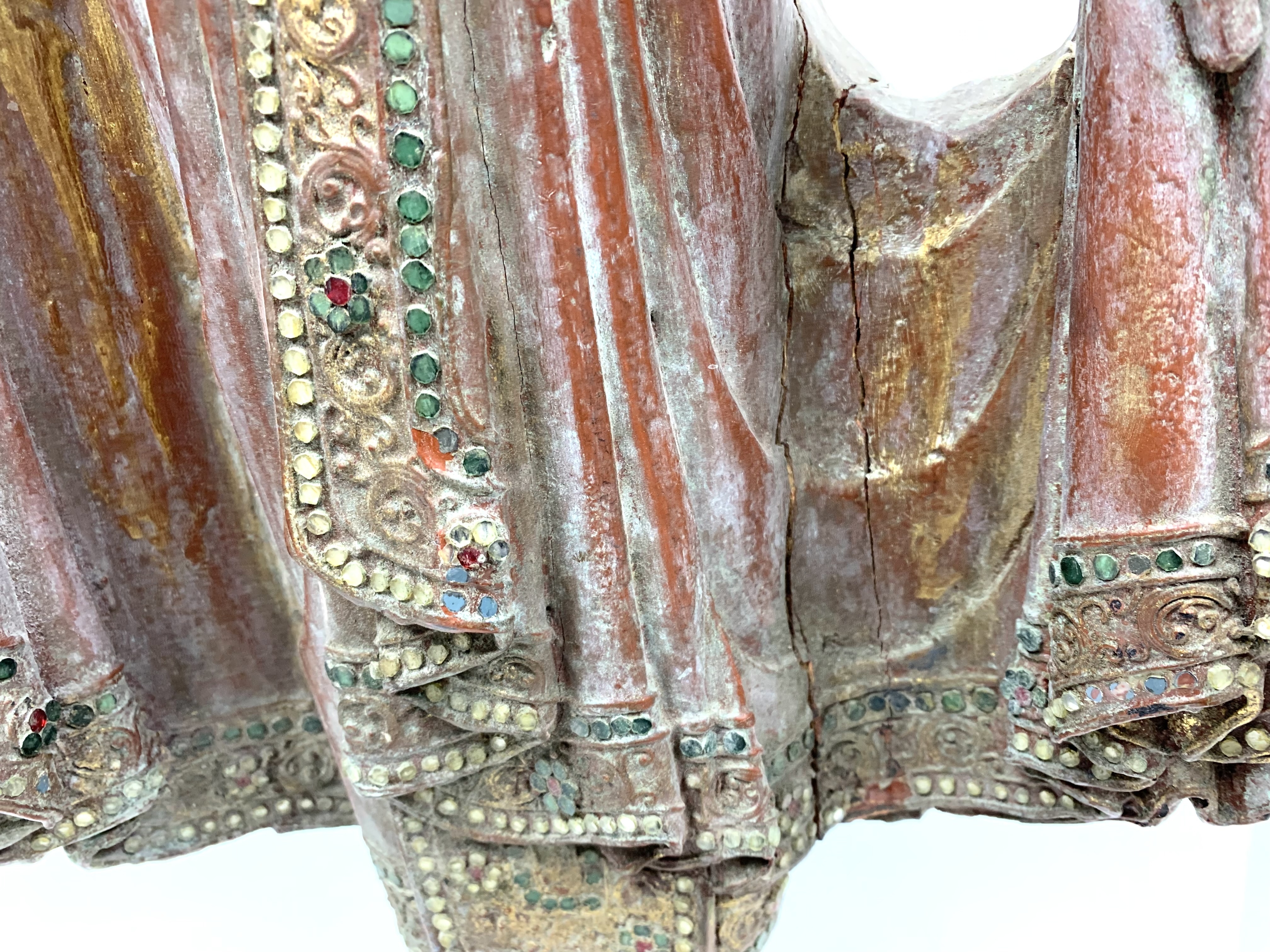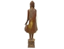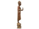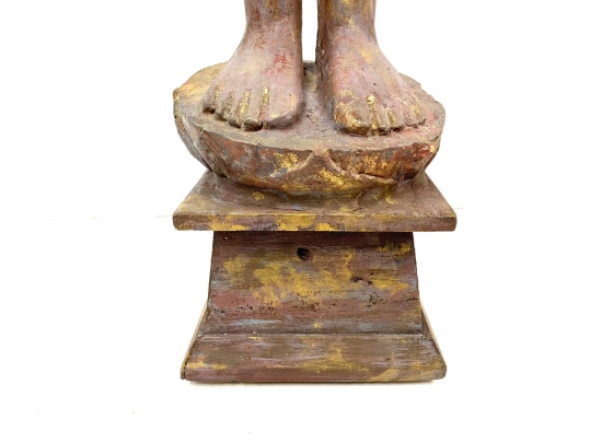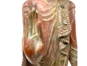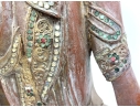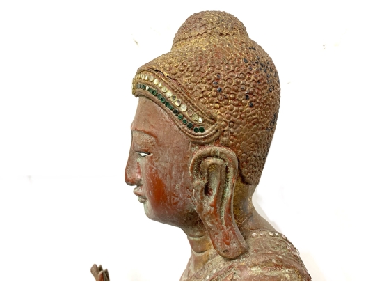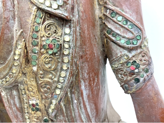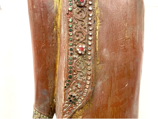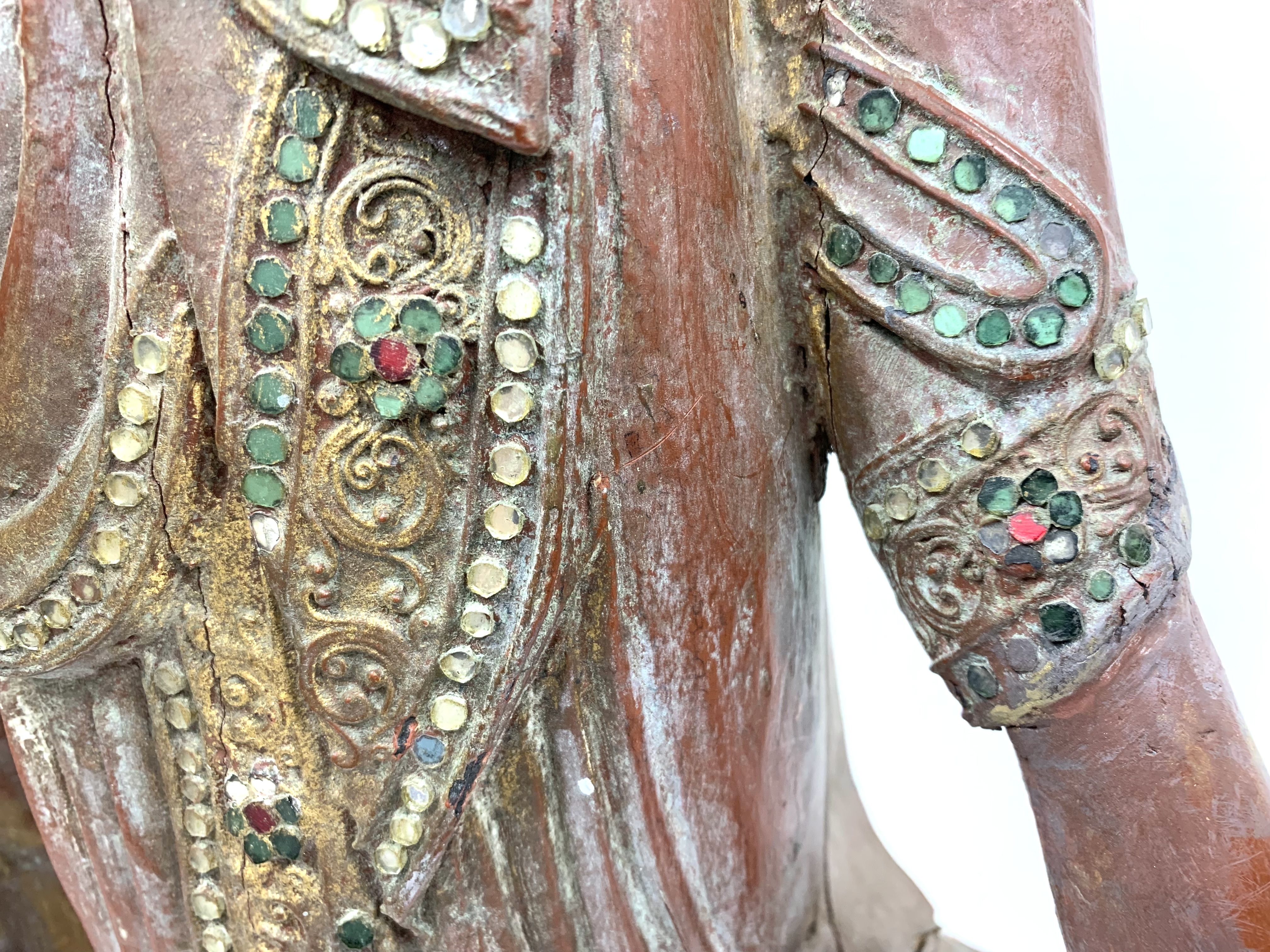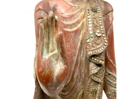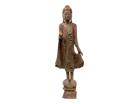 A large carved wood standing Buddha likely from Burma in the Mandalay style. The wooden statue is gilded and decorated with colorful inset mosaic glass stones. It features characteristics including an oval face, elongated arms and fingers and meticulously carved drapery. The statue resting on a lotus leaf and surmounted on a plinth base.