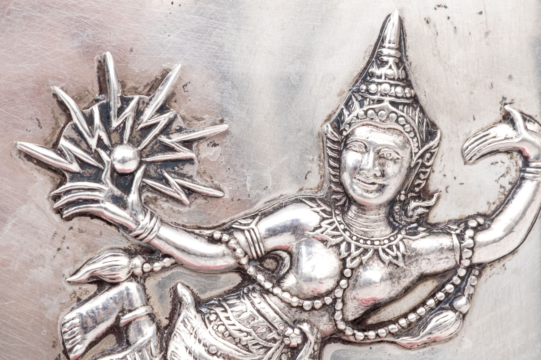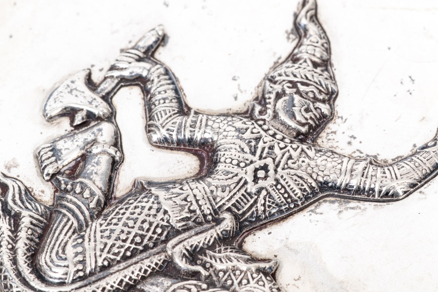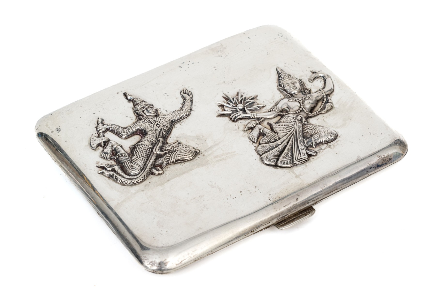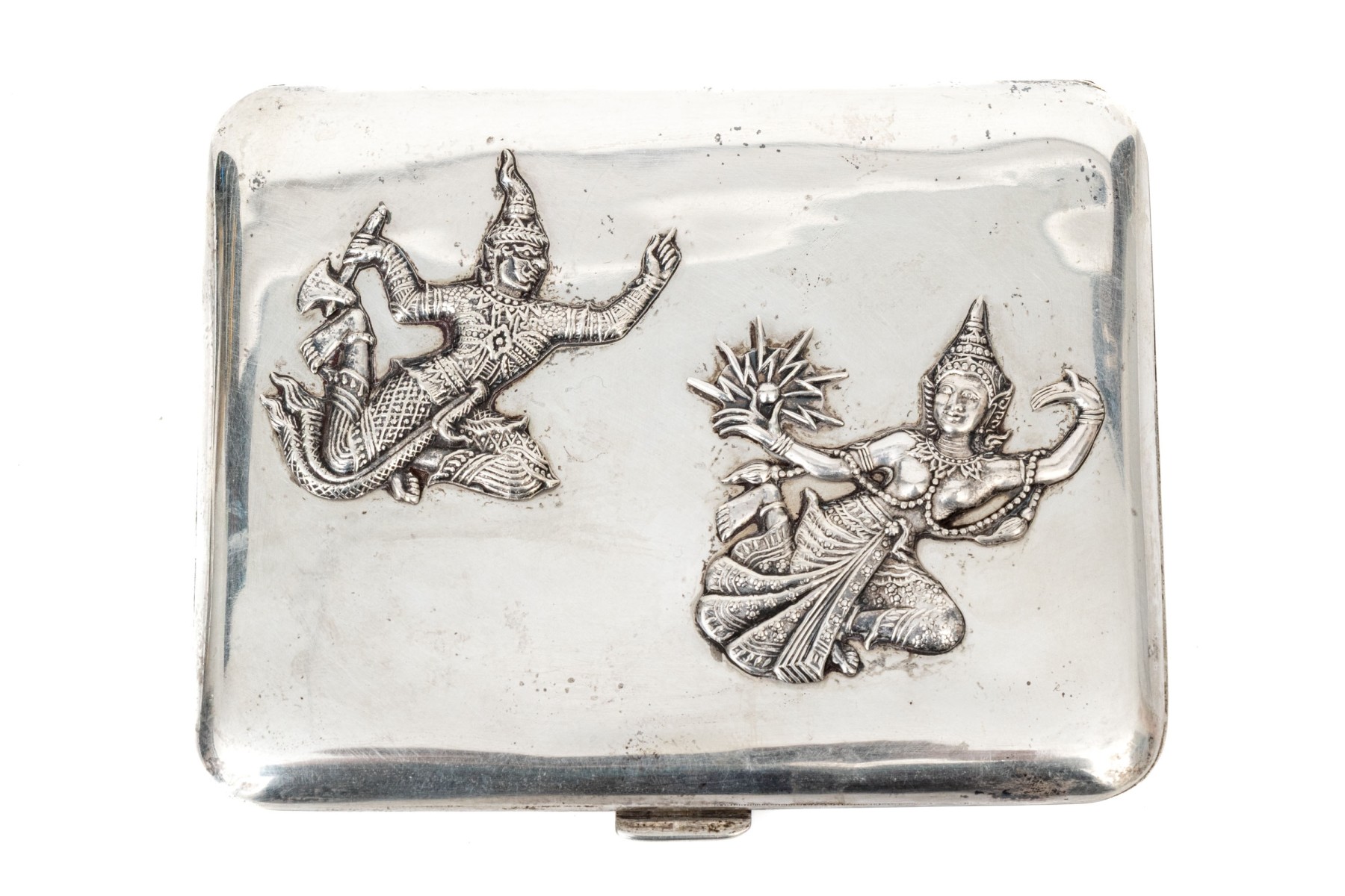 Marked on the inside silver band. The lid is decorated with a male and female dancer wearing elaborate costumes in relief. With a push tab closure on the side.