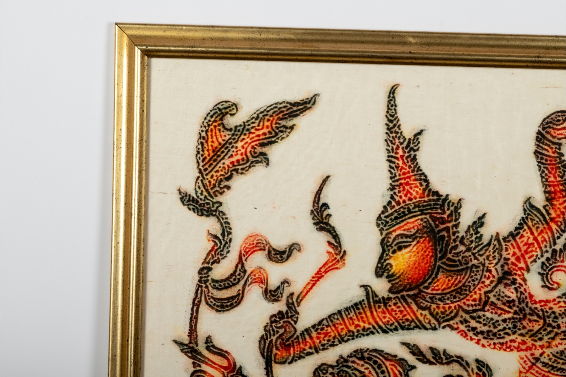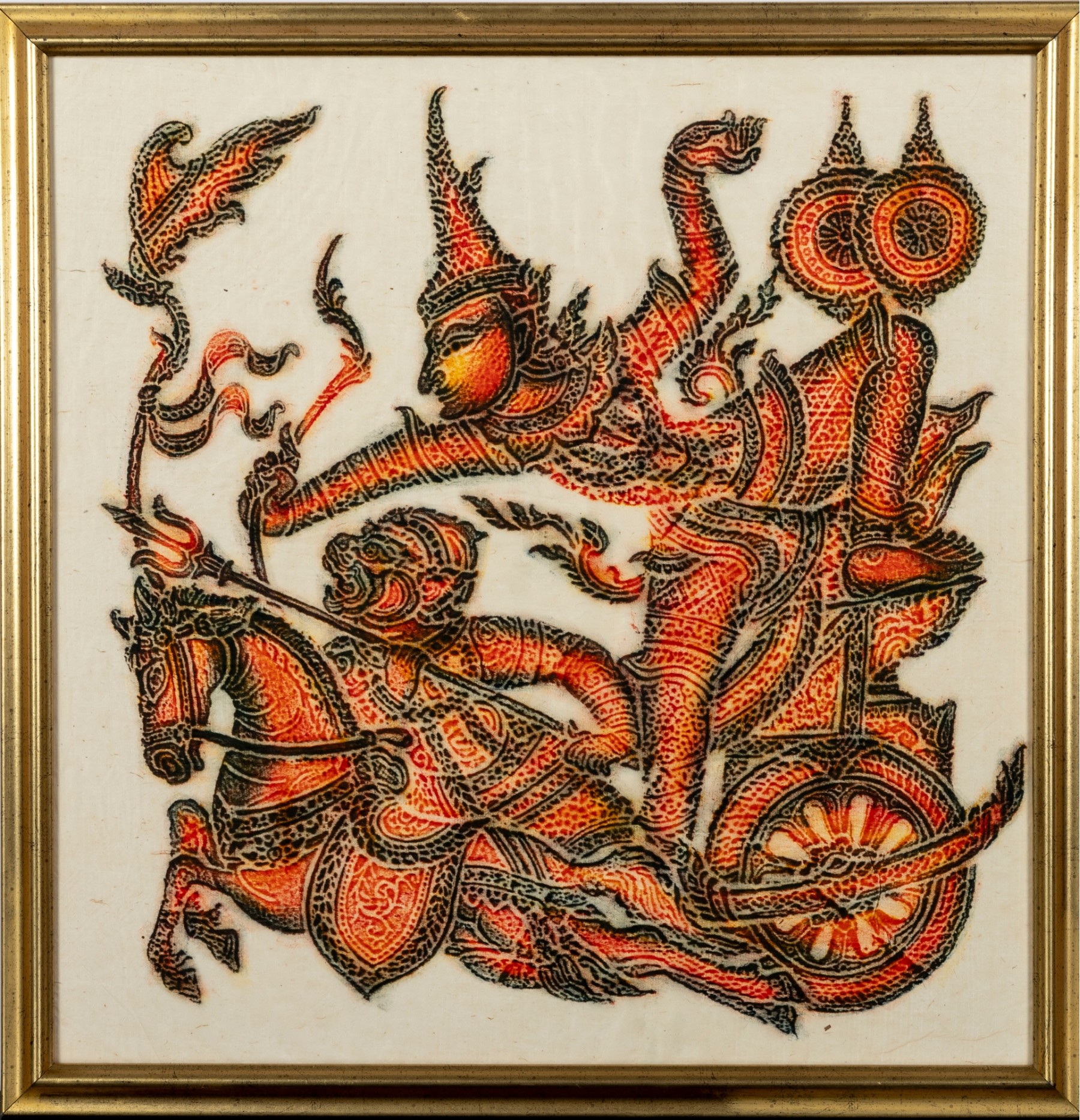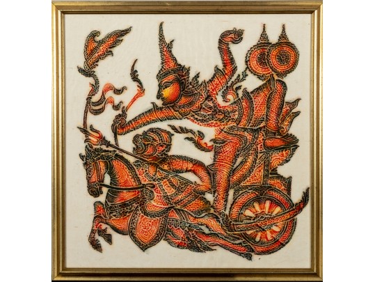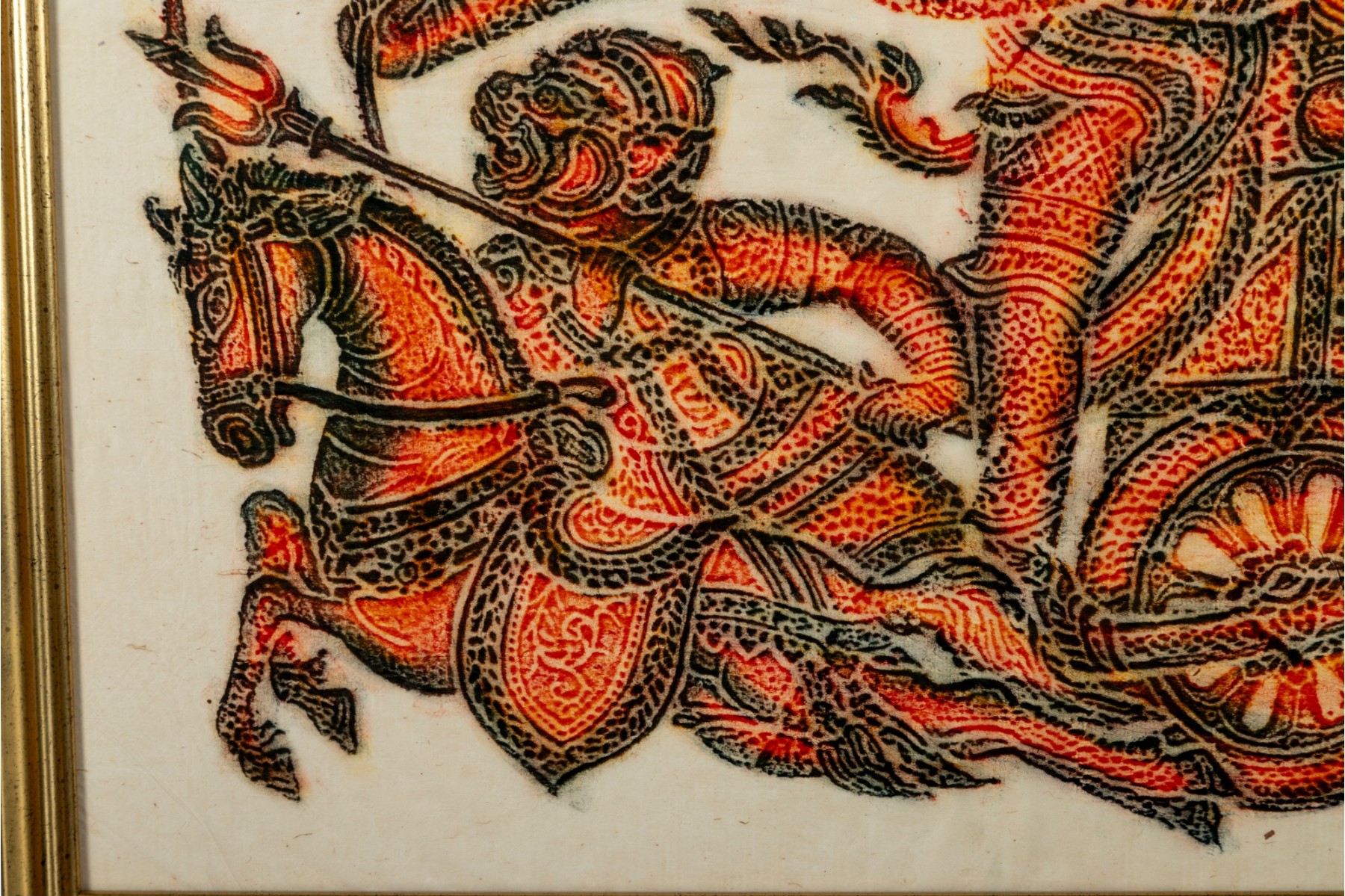 A wonderful Thai temple rubbing depicting a scene from the Ramakien, showcasing Prince Rama and Hanuman on a chariot rendered in beautiful detail and vibrant orange, yellow, and black. Displayed in a gilt frame.