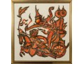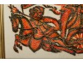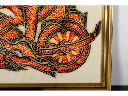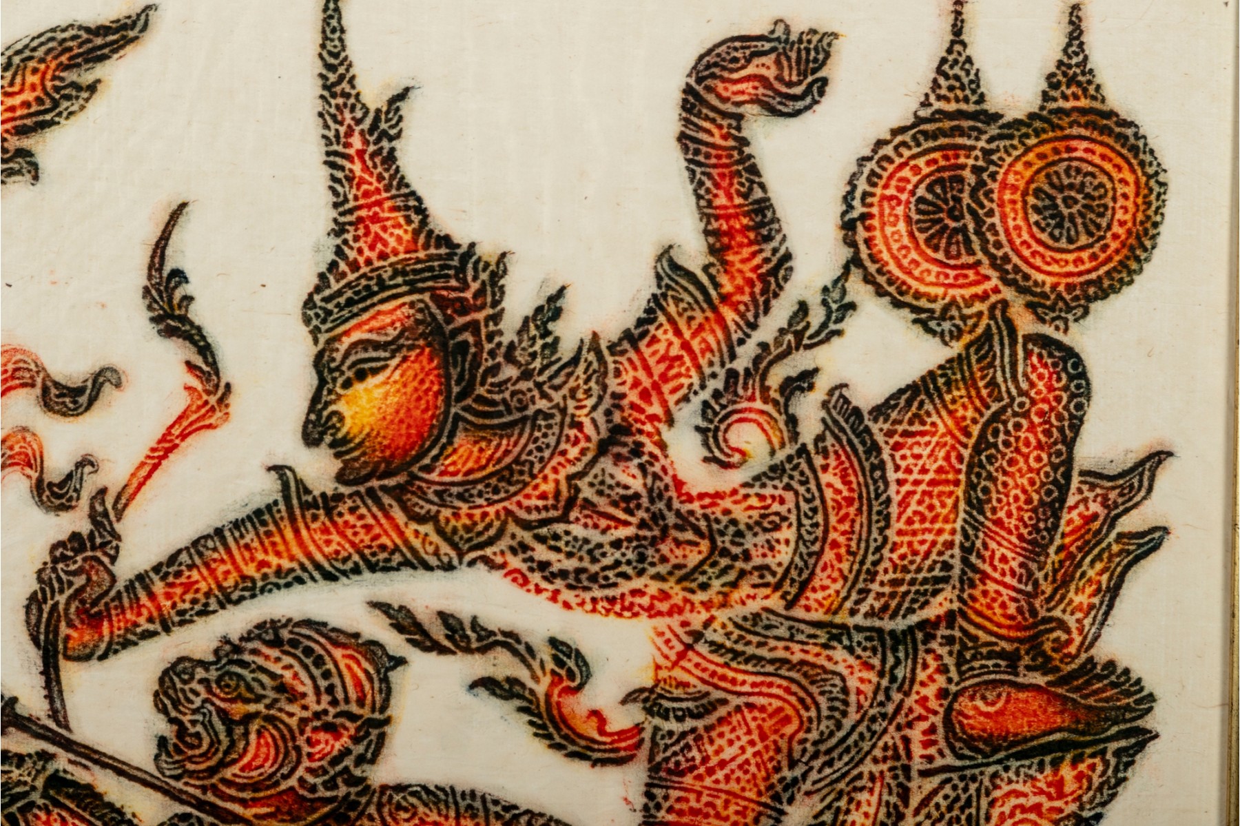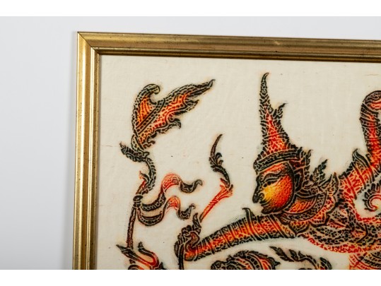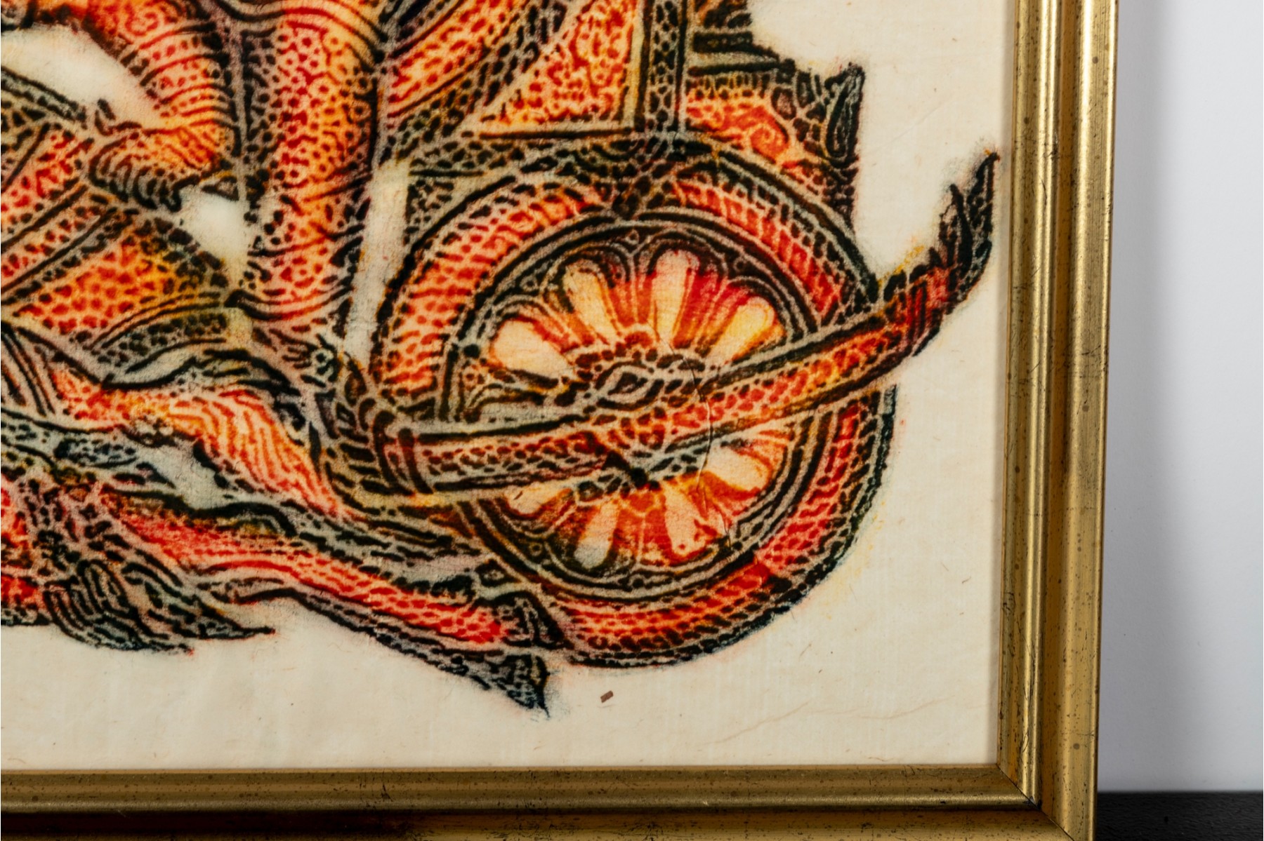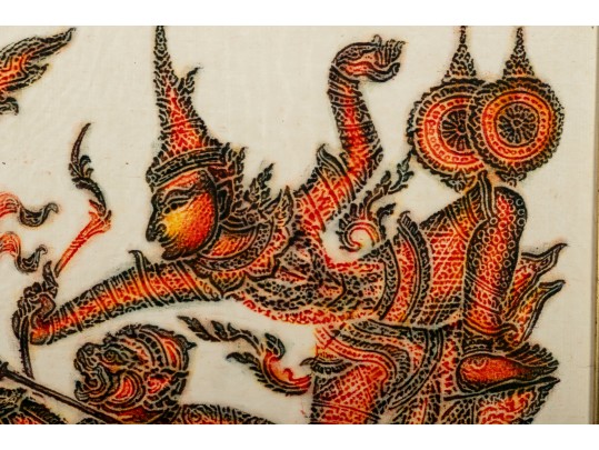 A wonderful Thai temple rubbing depicting a scene from the Ramakien, showcasing Prince Rama and Hanuman on a chariot rendered in beautiful detail and vibrant orange, yellow, and black. Displayed in a gilt frame.