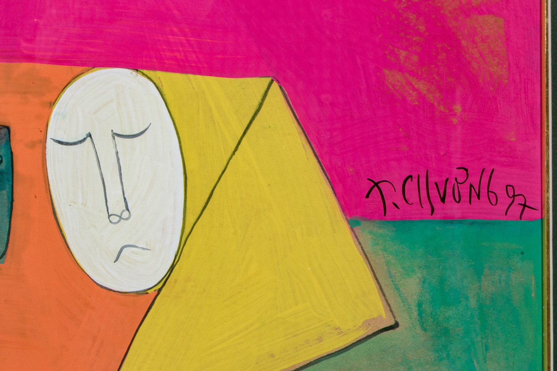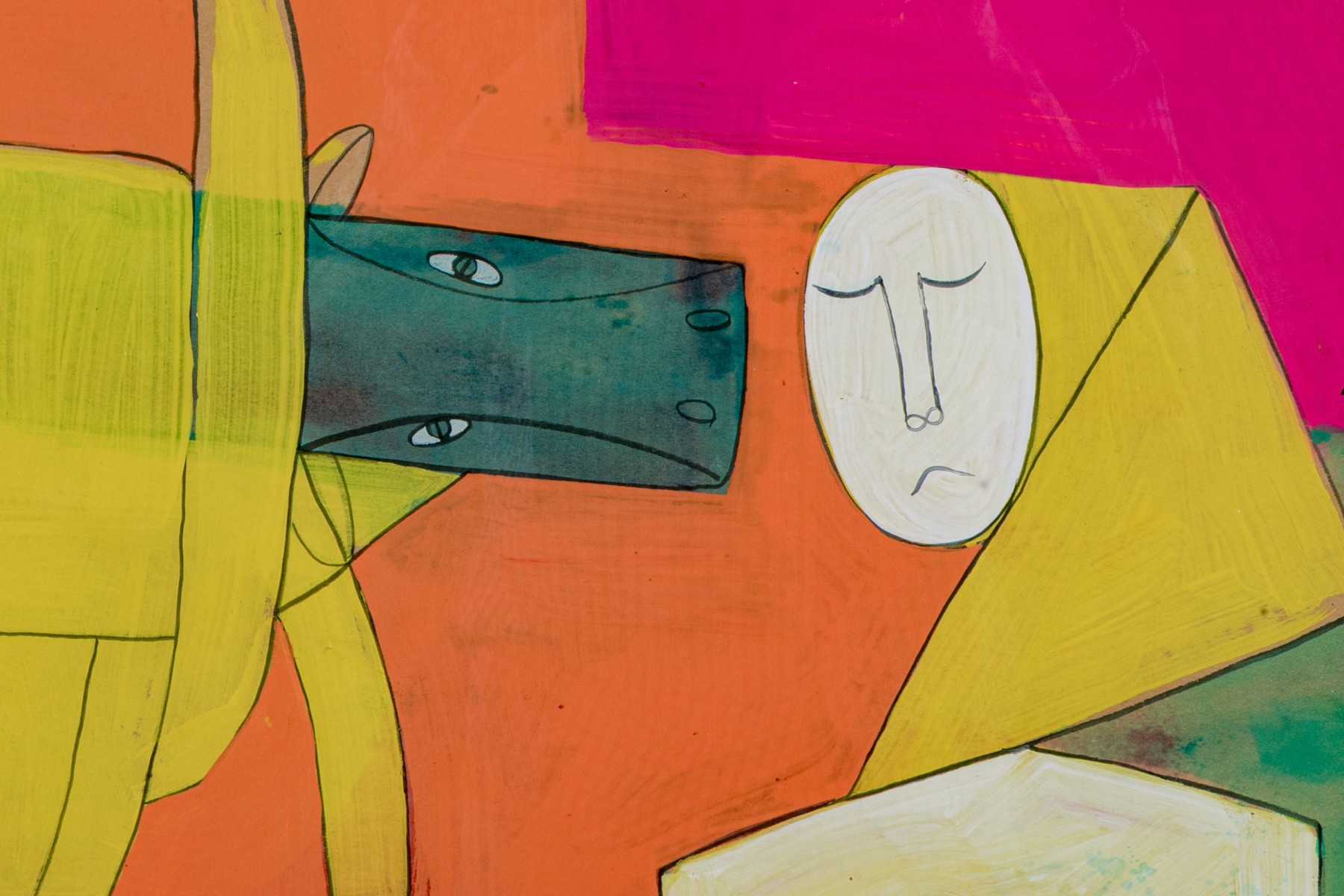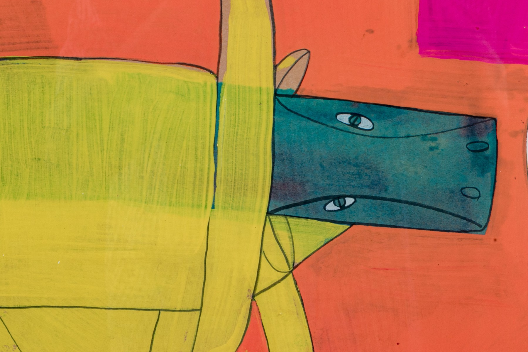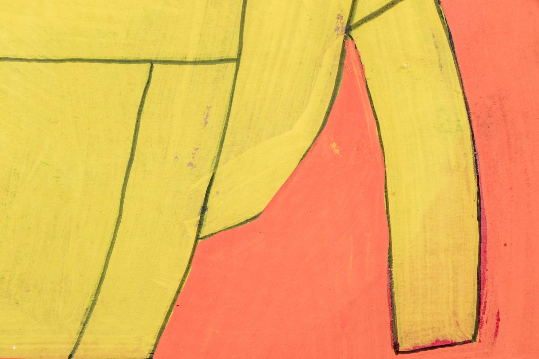 Thanh Chuong (Vietnam, B. 1948/9) lacquer on board depicting an abstract man with a buffalo in orange, yellow, green, and pink.
