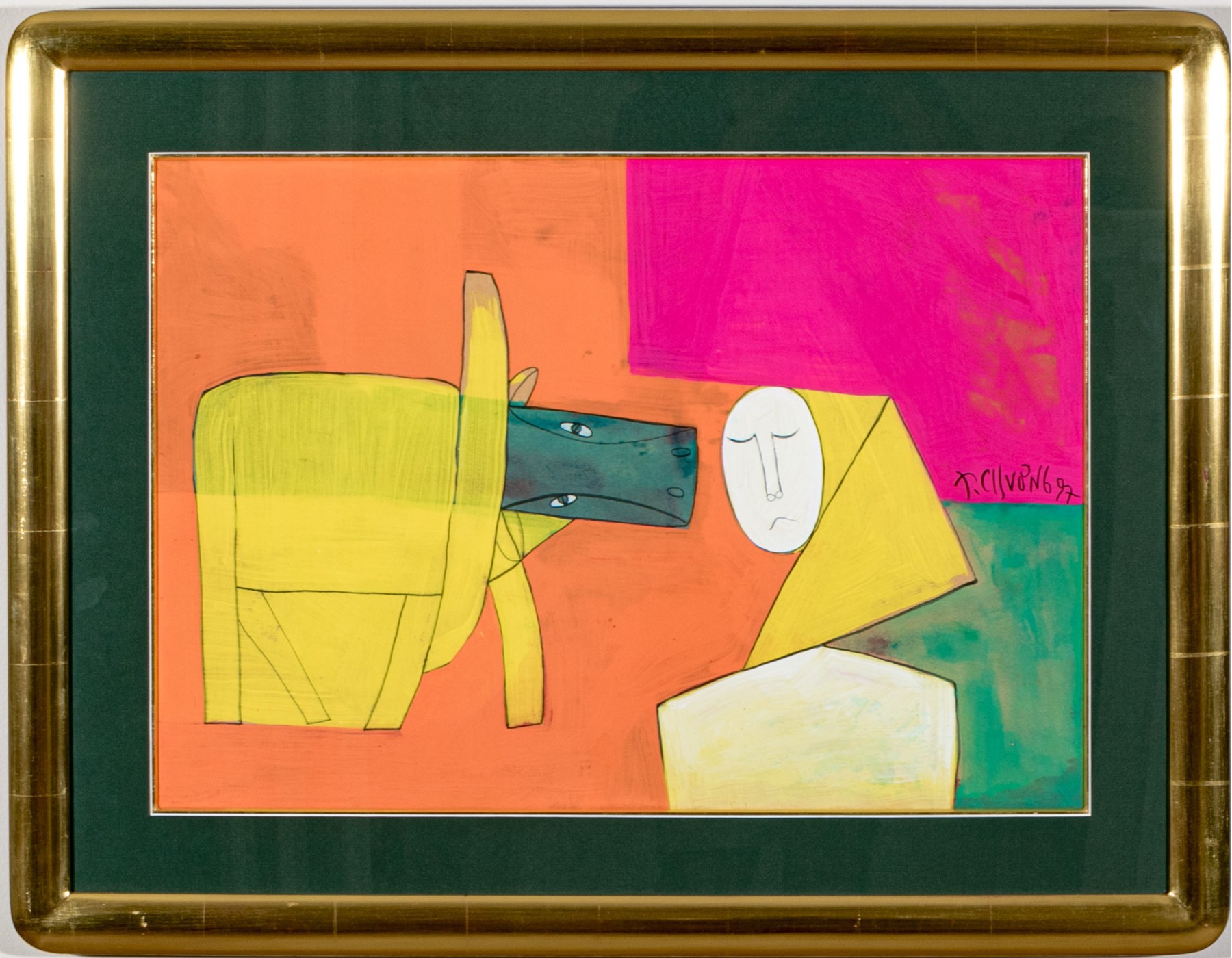 One of the premier Vietnamese contemporary artists, Chuong's preferred method of lacquer on board has been utilized with the vibrant near color field style abstract figural painting.