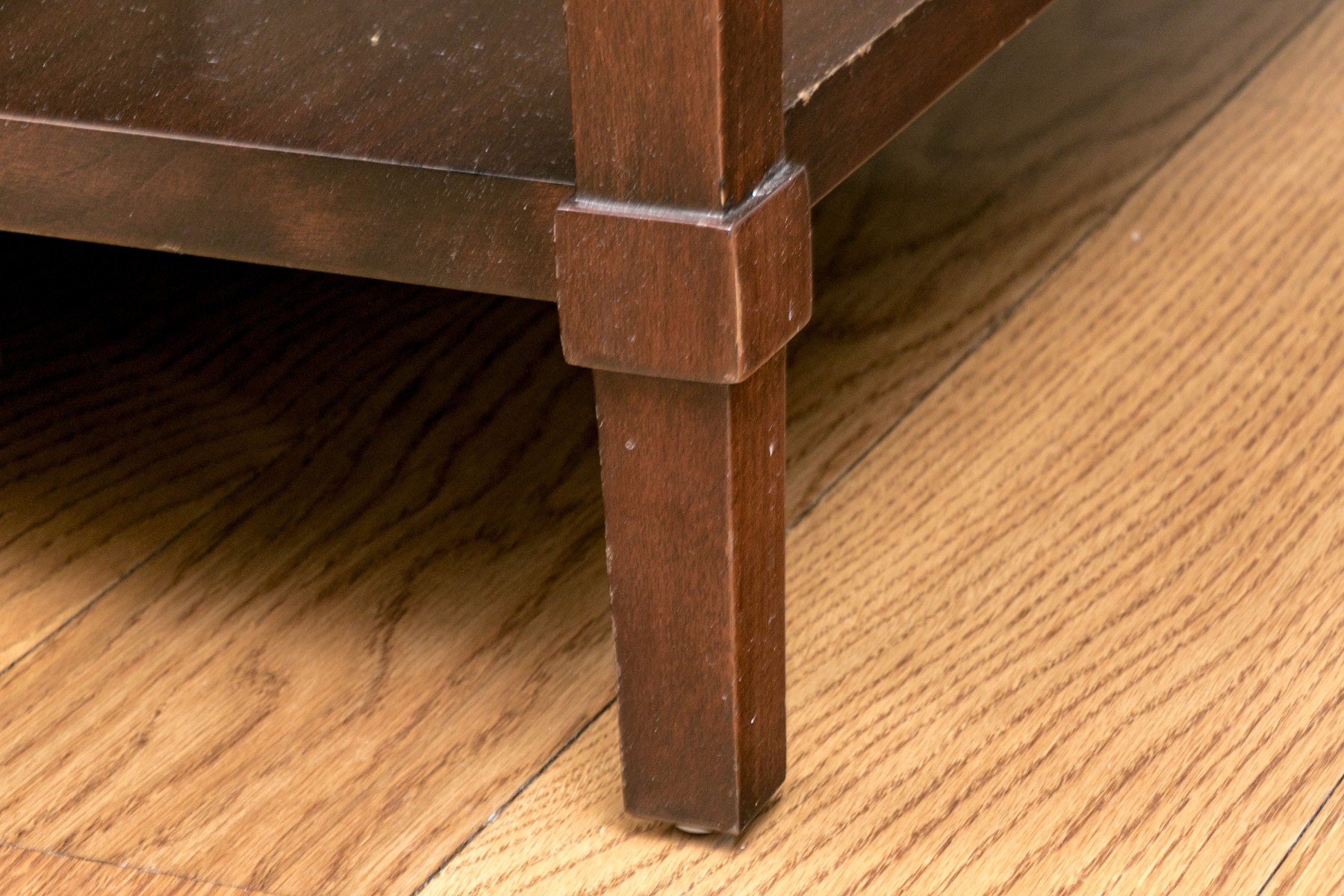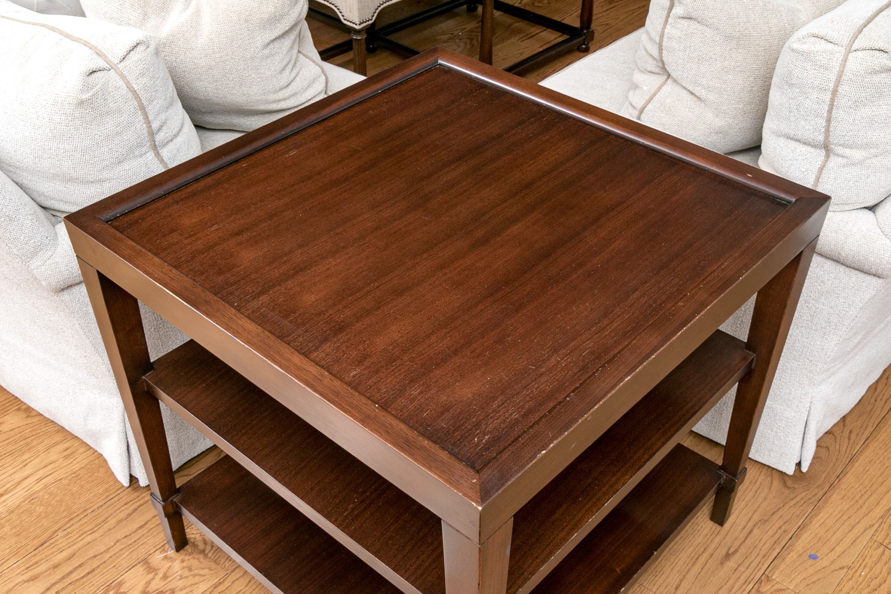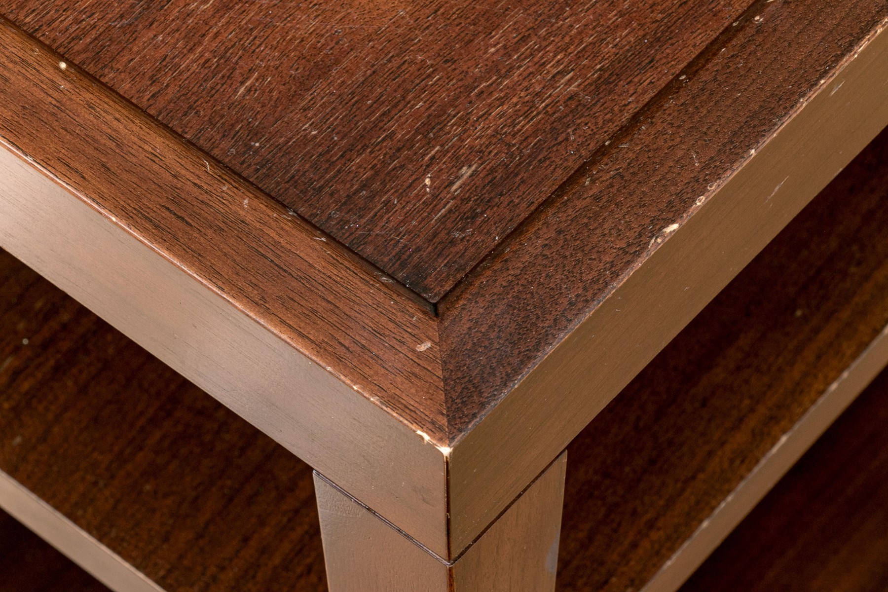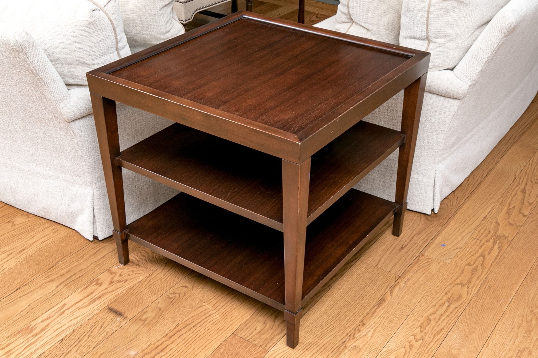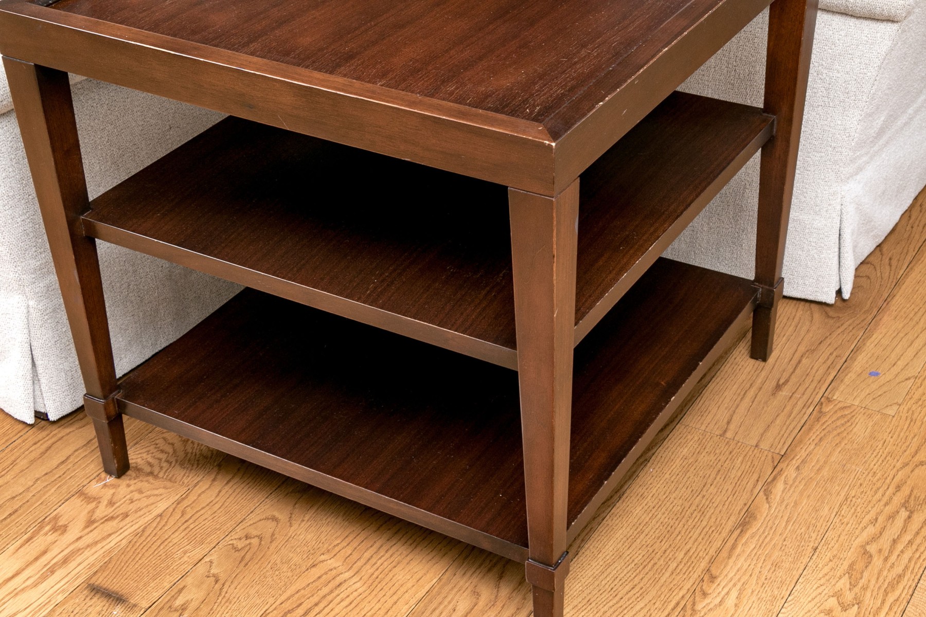 This lovely brown side table has three tiers with a beveled top making it a great statement piece and perfect for storage.