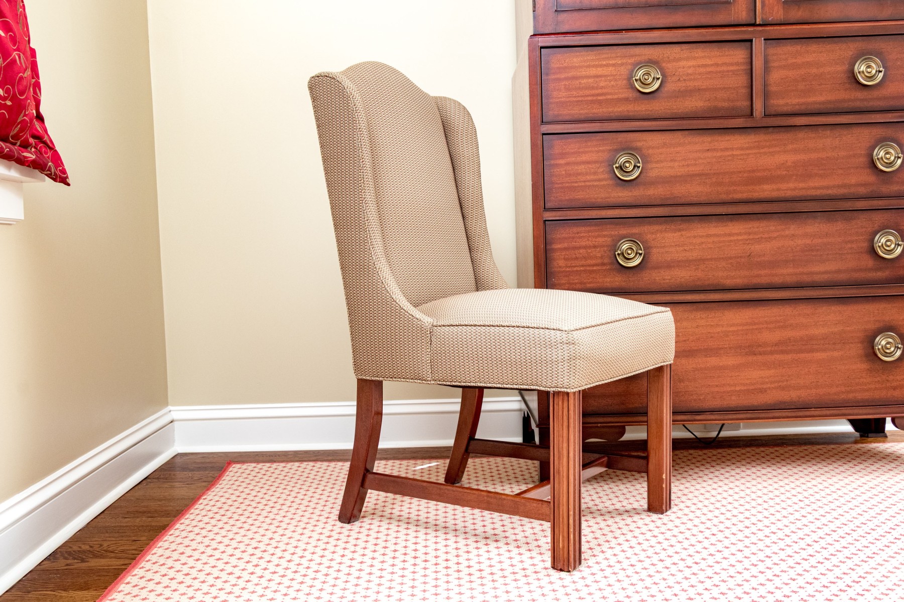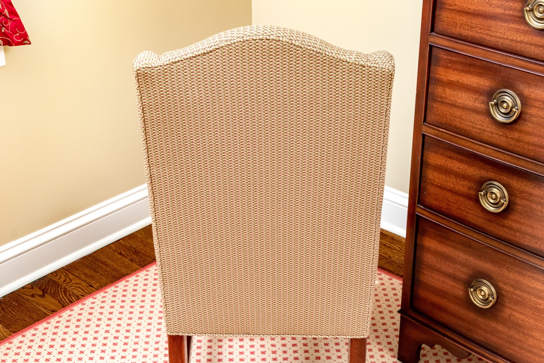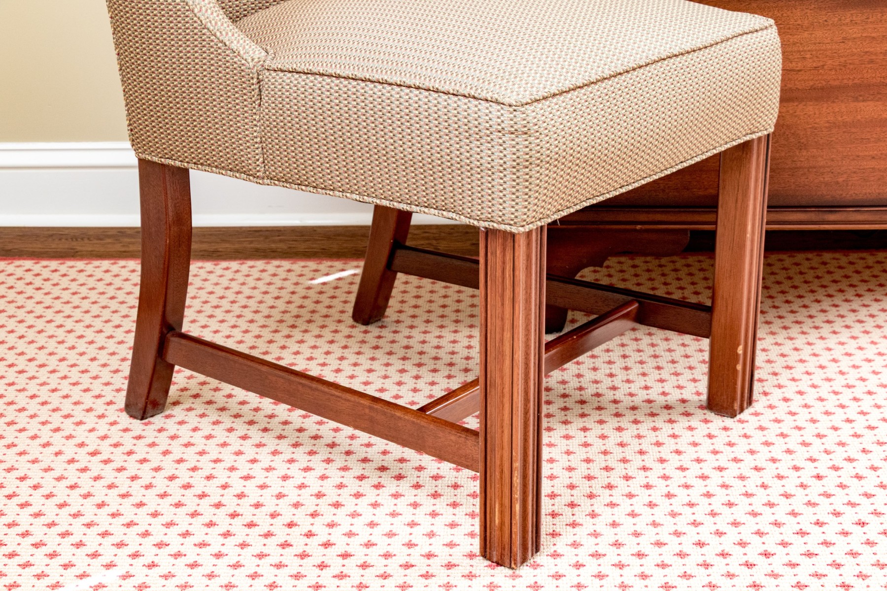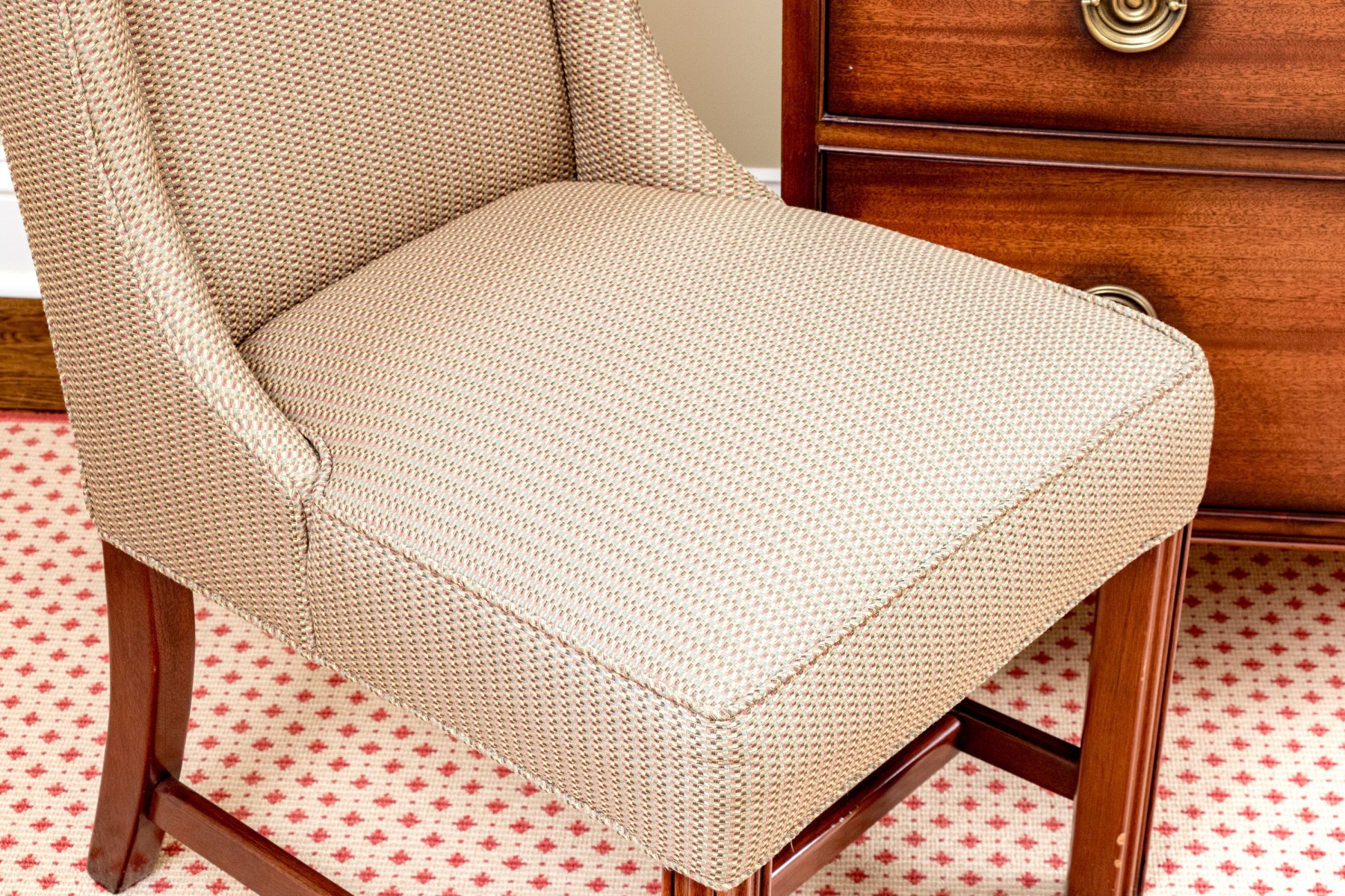 An elegant The Charles Stewart Company accent chair featuring a stately camel back with short wing sides and a comfortable, deep-set seat upholstered in textural patterned fabric incorporating olive beige, green, orange, and red accents. Finished with piped trims and nicely carved front legs in warm-toned orange brown wood with an H-stretcher.