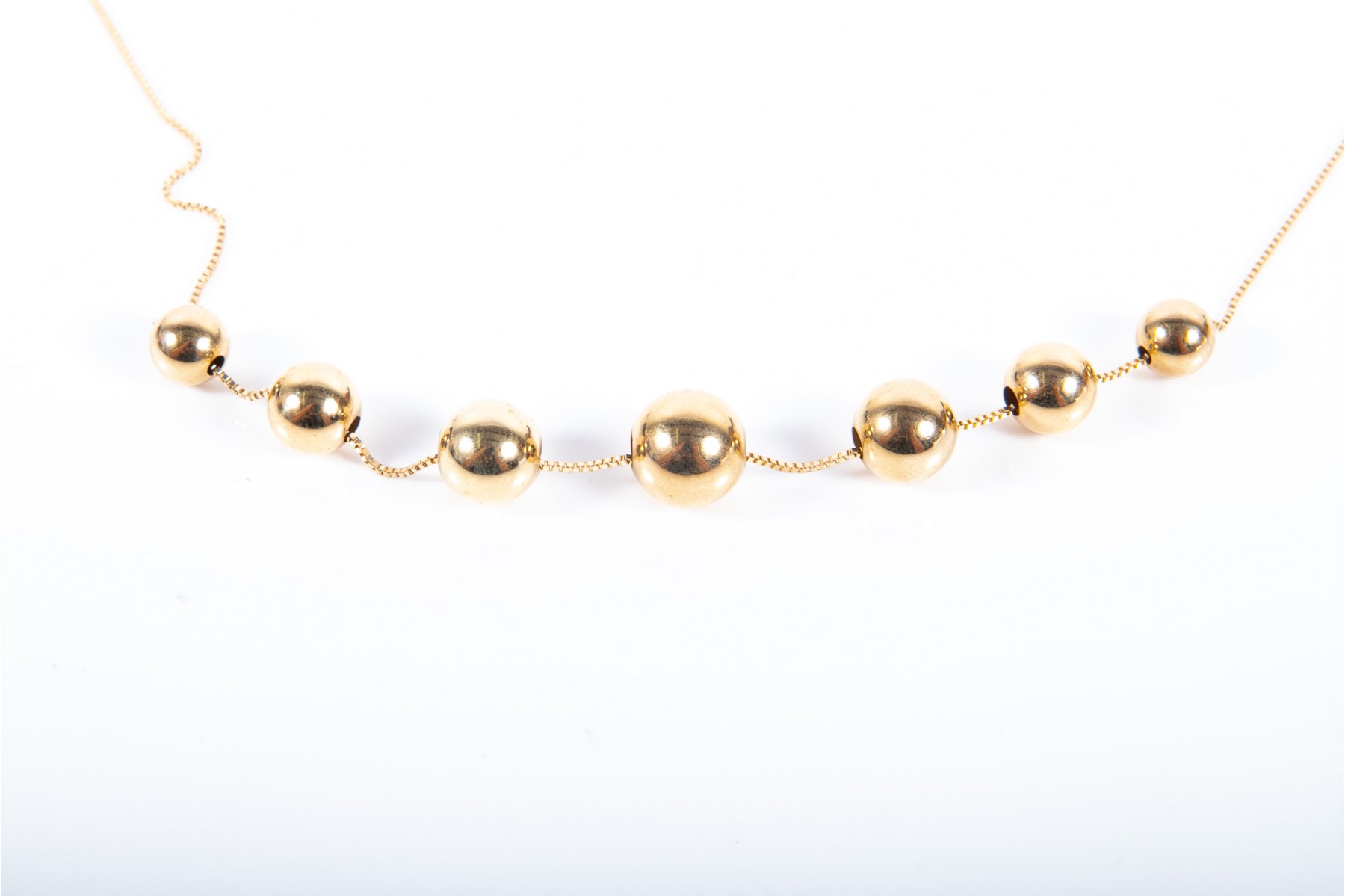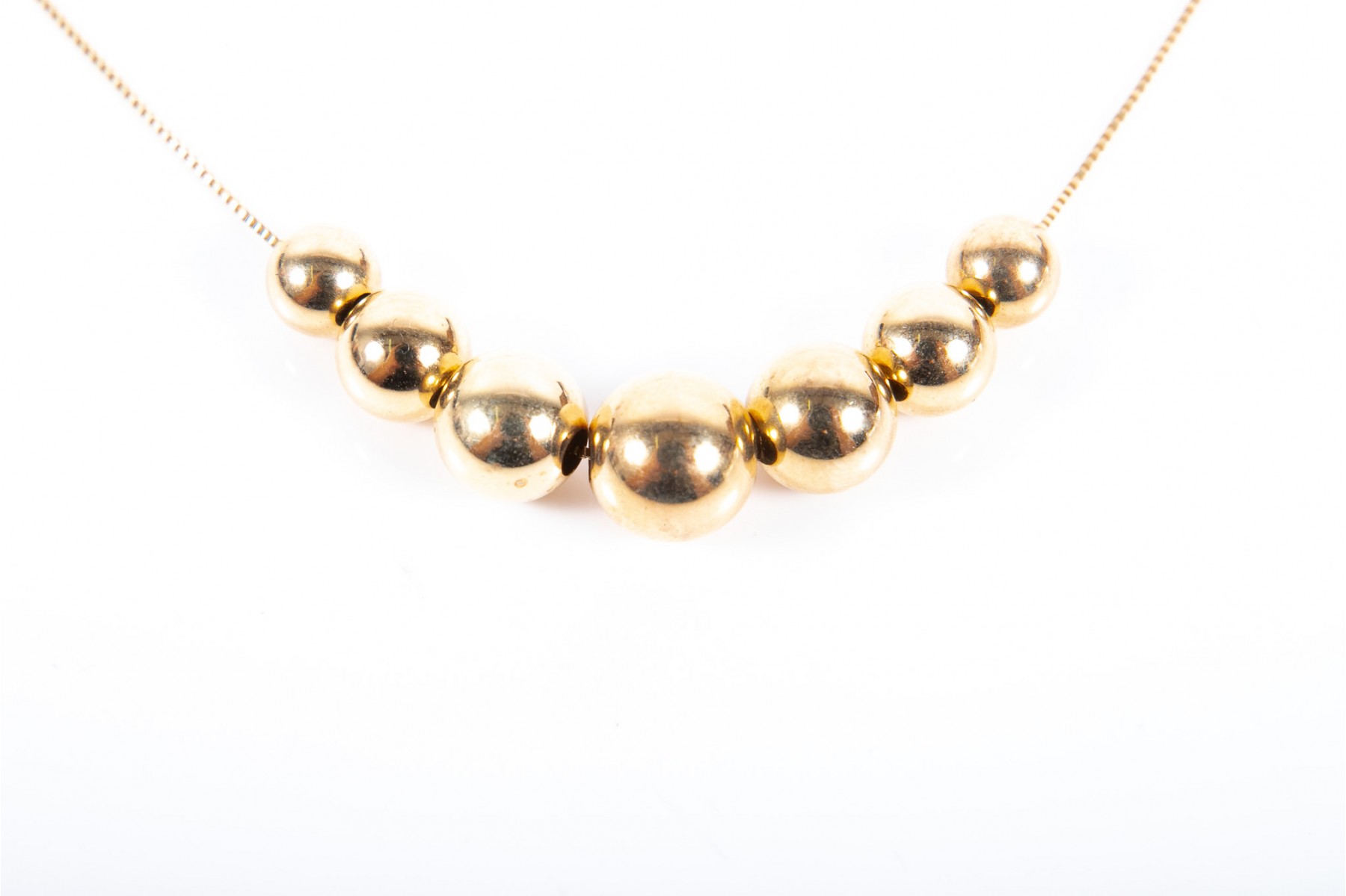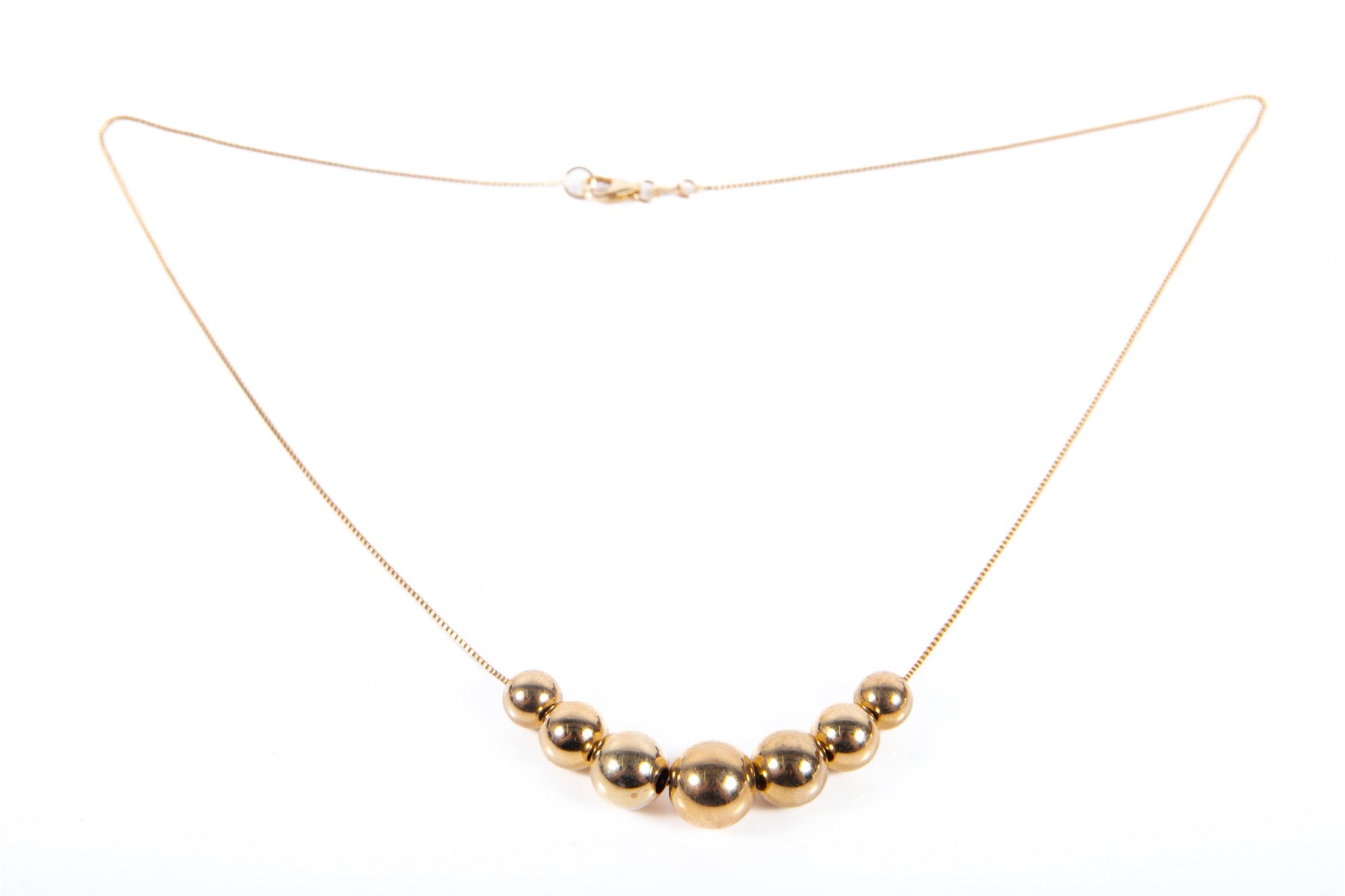 The Danbury Mint yellow gold box chain necklace displaying an elegant graduating arrangement of spherical beads. Accompanied by a black velvet display box from The Danbury Mint.