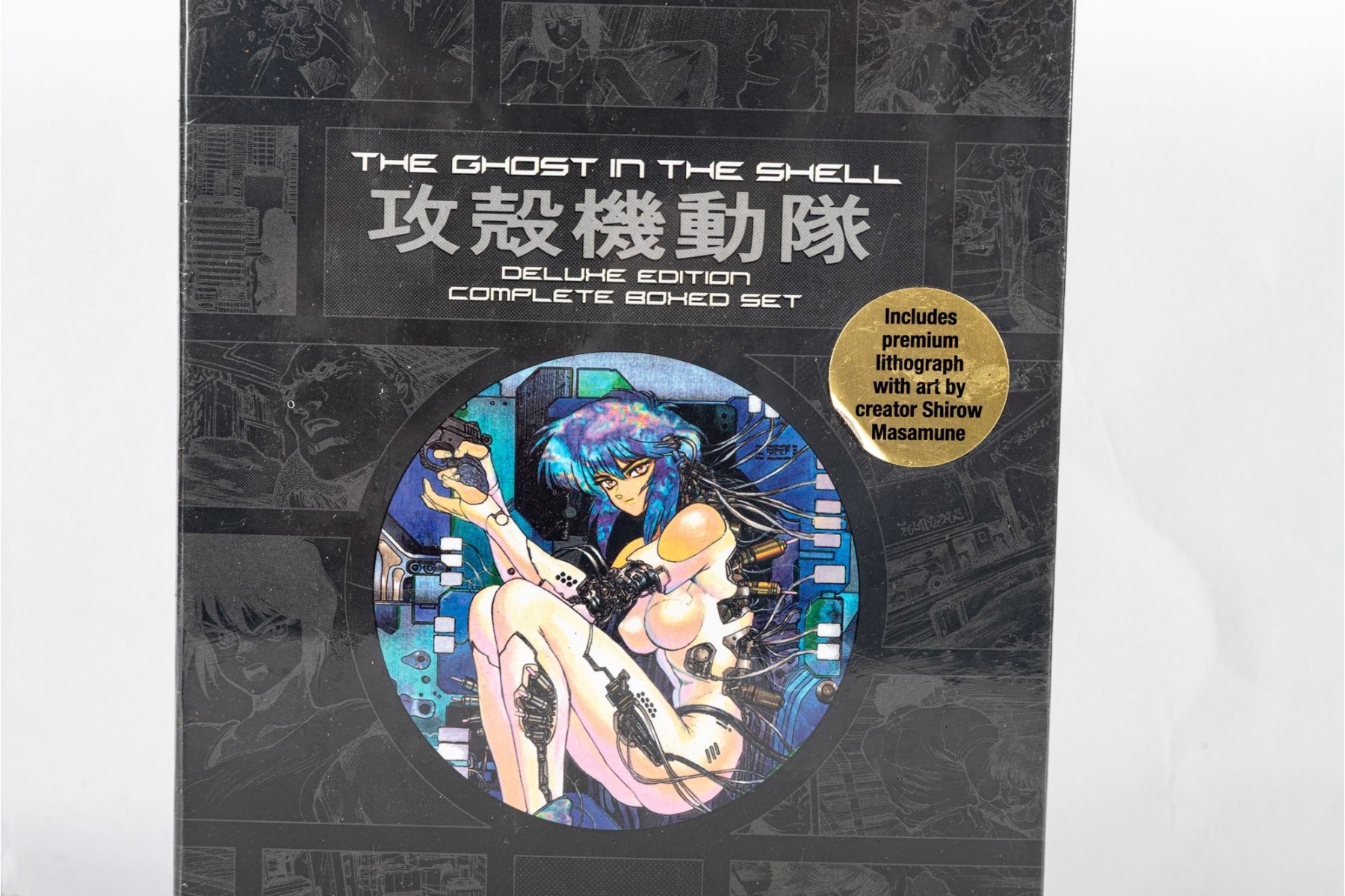 Set includes a premium lithograph featuring artwork by the creator, Shirow Masamune, as noted on the gold foil label. The volumes are bound in high-quality hardcover with metallic finish spines, housed in an illustrated slipcase showcasing original art from the manga series.