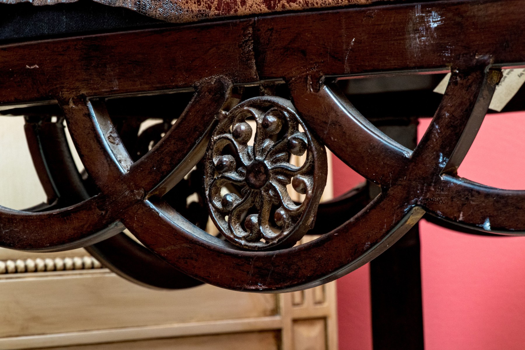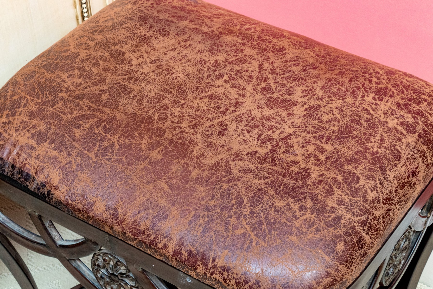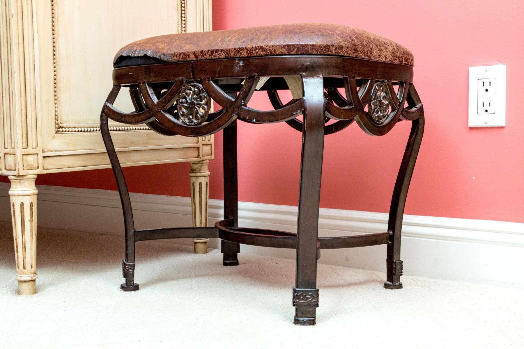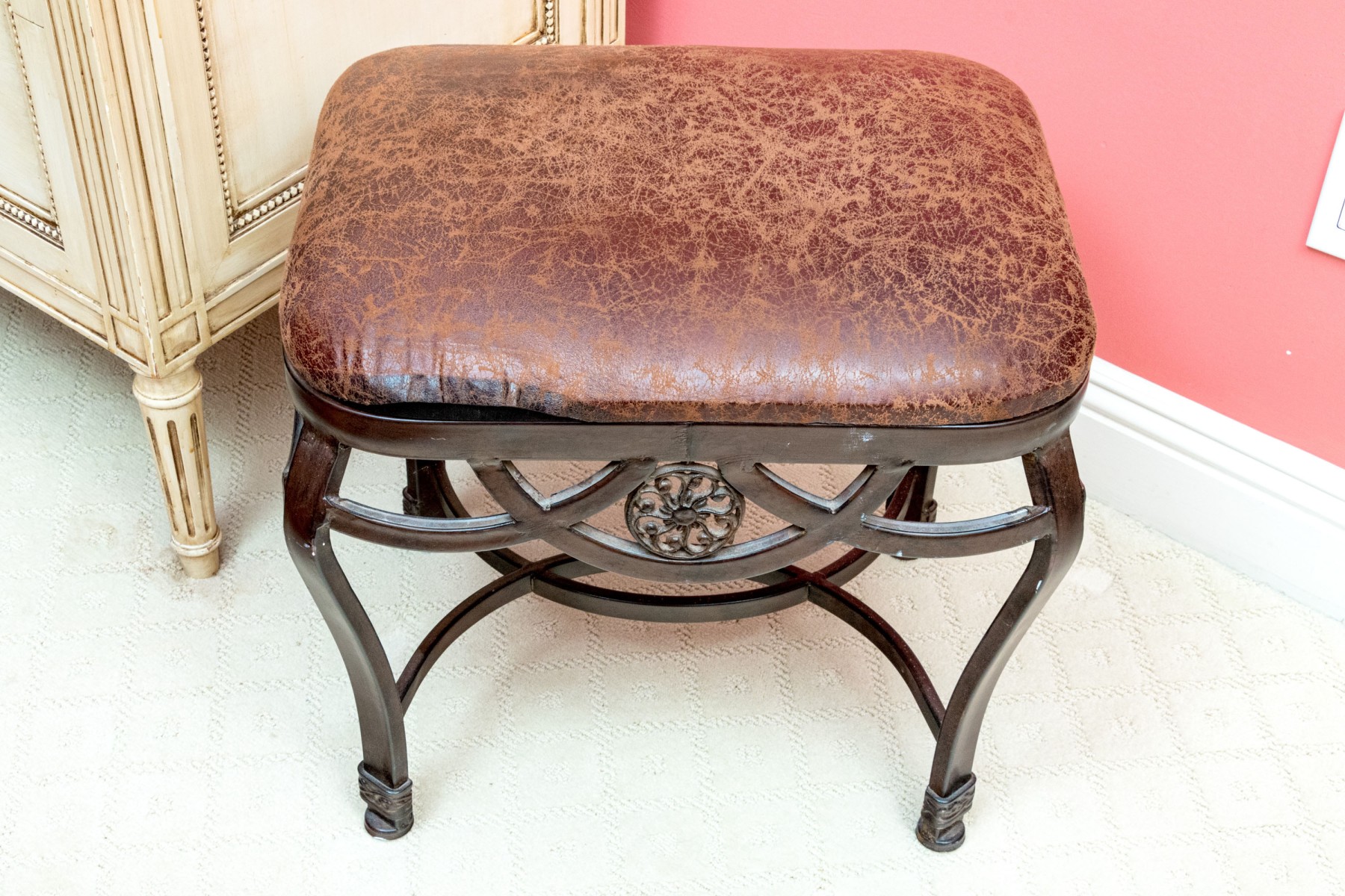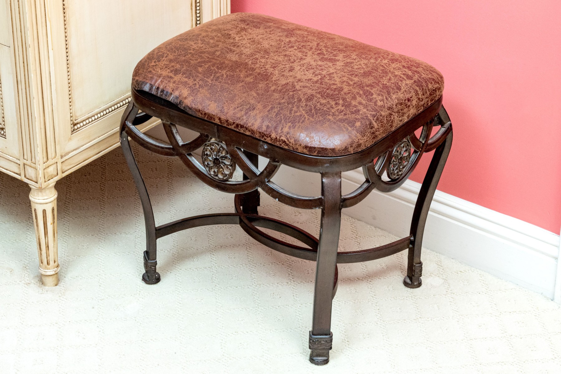 A wonderful The Import Collection "Alano" vanity stool sporting a rounded rectangular seat upholstered in beautiful brown leatherette, raised on an intentionally distressed bronzed metal frame with an elegantly curved openwork apron detailed with floral medallions. The legs elegantly curve to follow a bombe profile, surrounding a stylized curved X-stretcher.