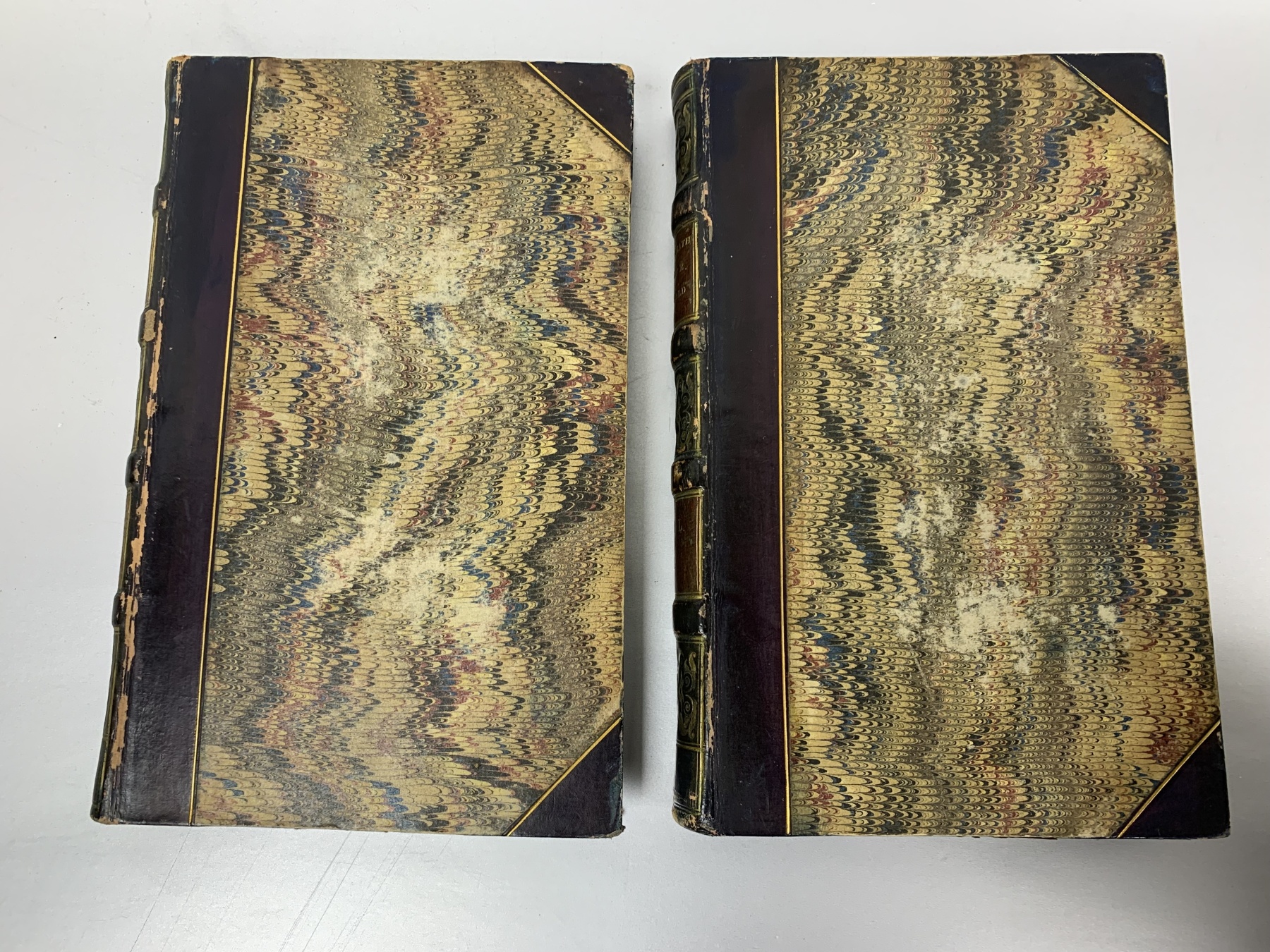 Engraved portrait frontispiece and folding map. Two volumes. London: Longman, Rees, Orme, Brown, & Green, 39, Paternoster-Row, 1831. Second edition. Published in the same year as the first edition. Spine divided into five panels by four raised bands, title and volume number in gilt on brown morocco labels. Marbled end-wraps with adhered bookplates behind board and fly page.