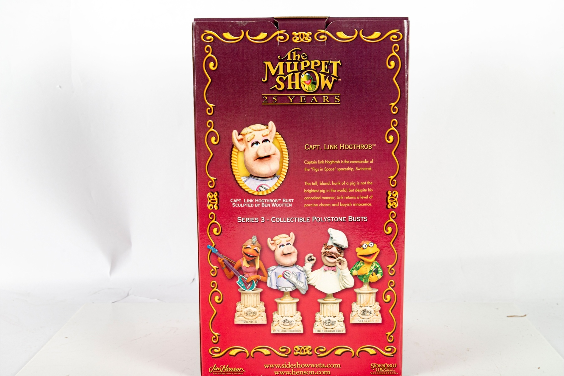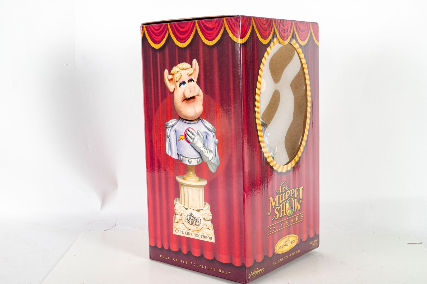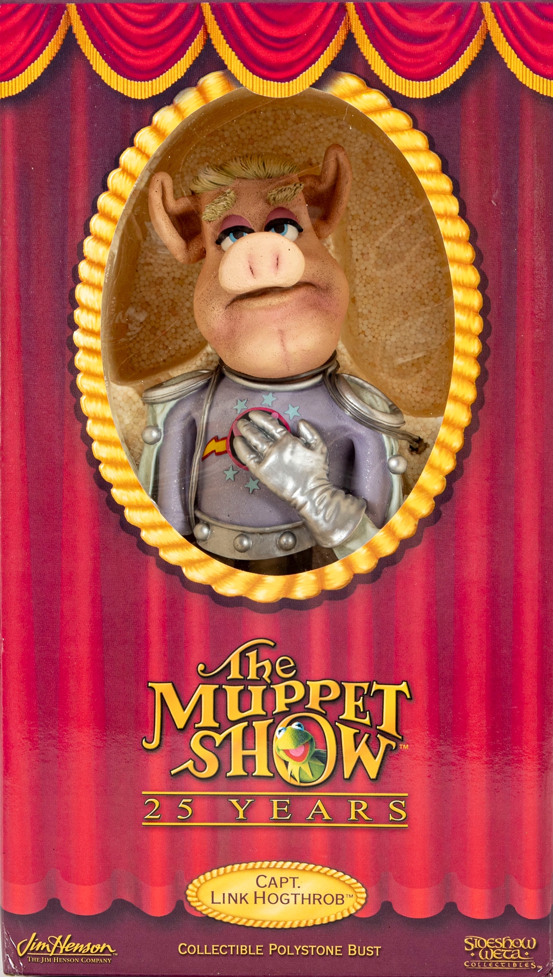 Limited edition Capt. Link Hogthrob collectible bust from The Muppet Show 25th Anniversary series, produced by Sideshow/Weta Collectibles in collaboration with The Jim Henson Company. Expertly sculpted by Ben Wootten, this hand-painted polystone bust celebrates one of the classic characters from the Pigs in Space sketch.