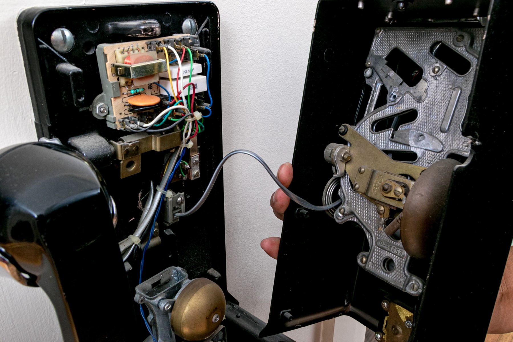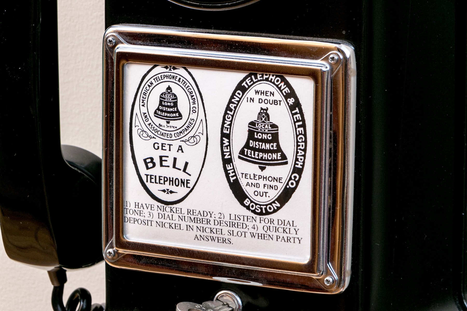 A wonderful The New England Telephone & Telegraph Co. Boston bell wall mounted rotary phone with a classic and iconic design with a black body and gray metal accents.
