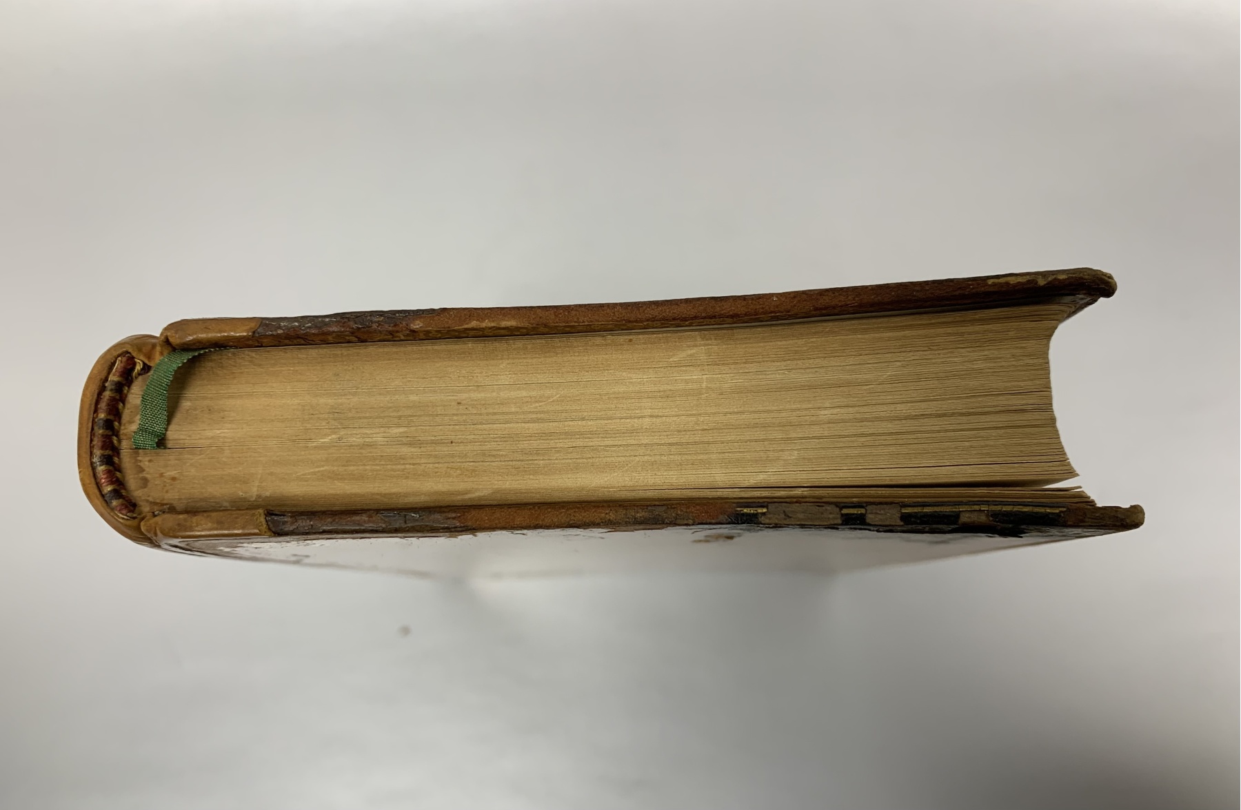 Condition: wear and losses around the boards, wear to left and right side of spine, wear/dulling to corners, stains to leather, pages clean and pliable, binding tight, book square.