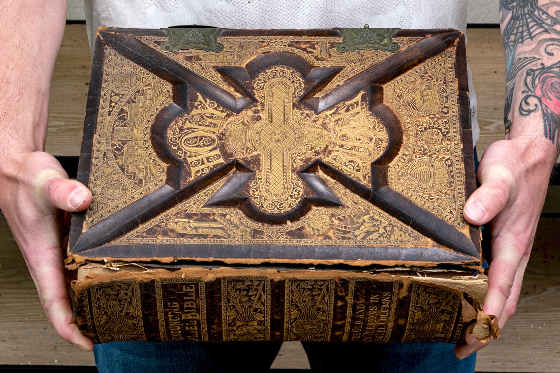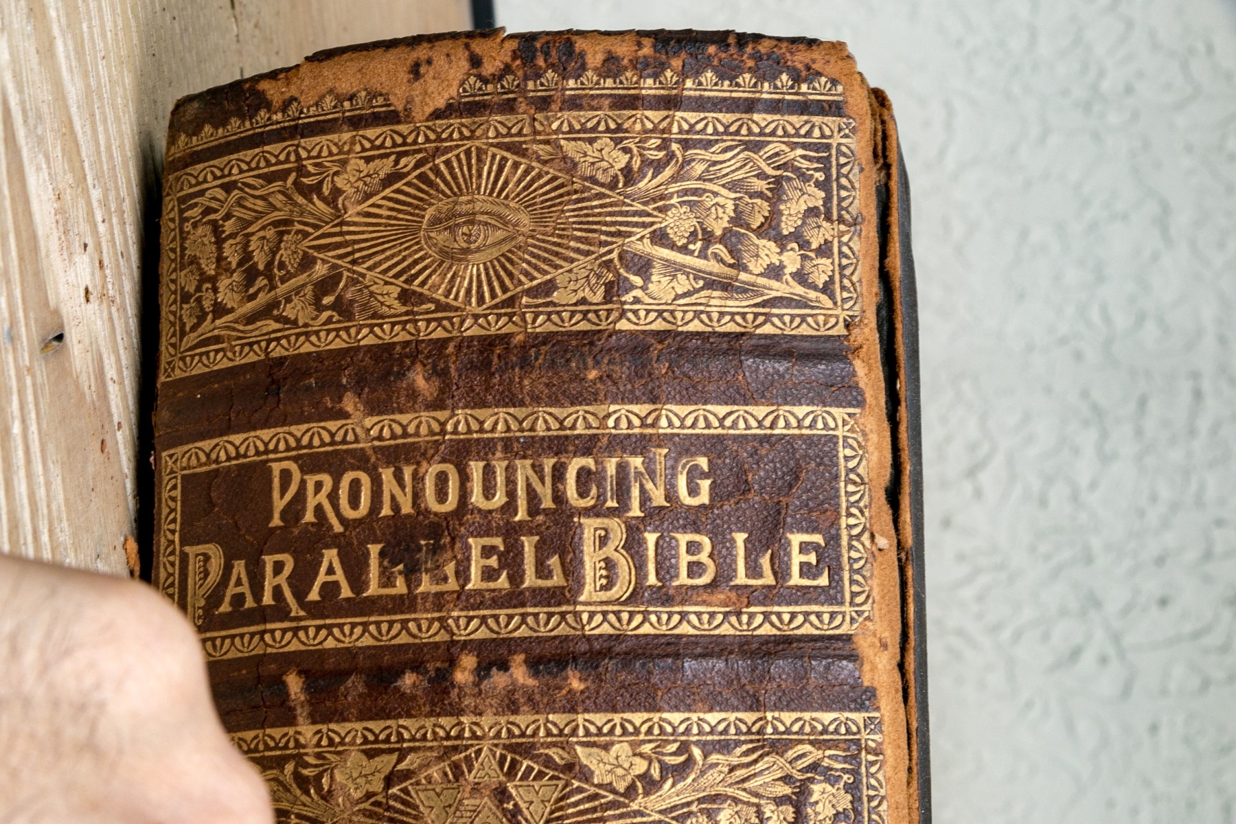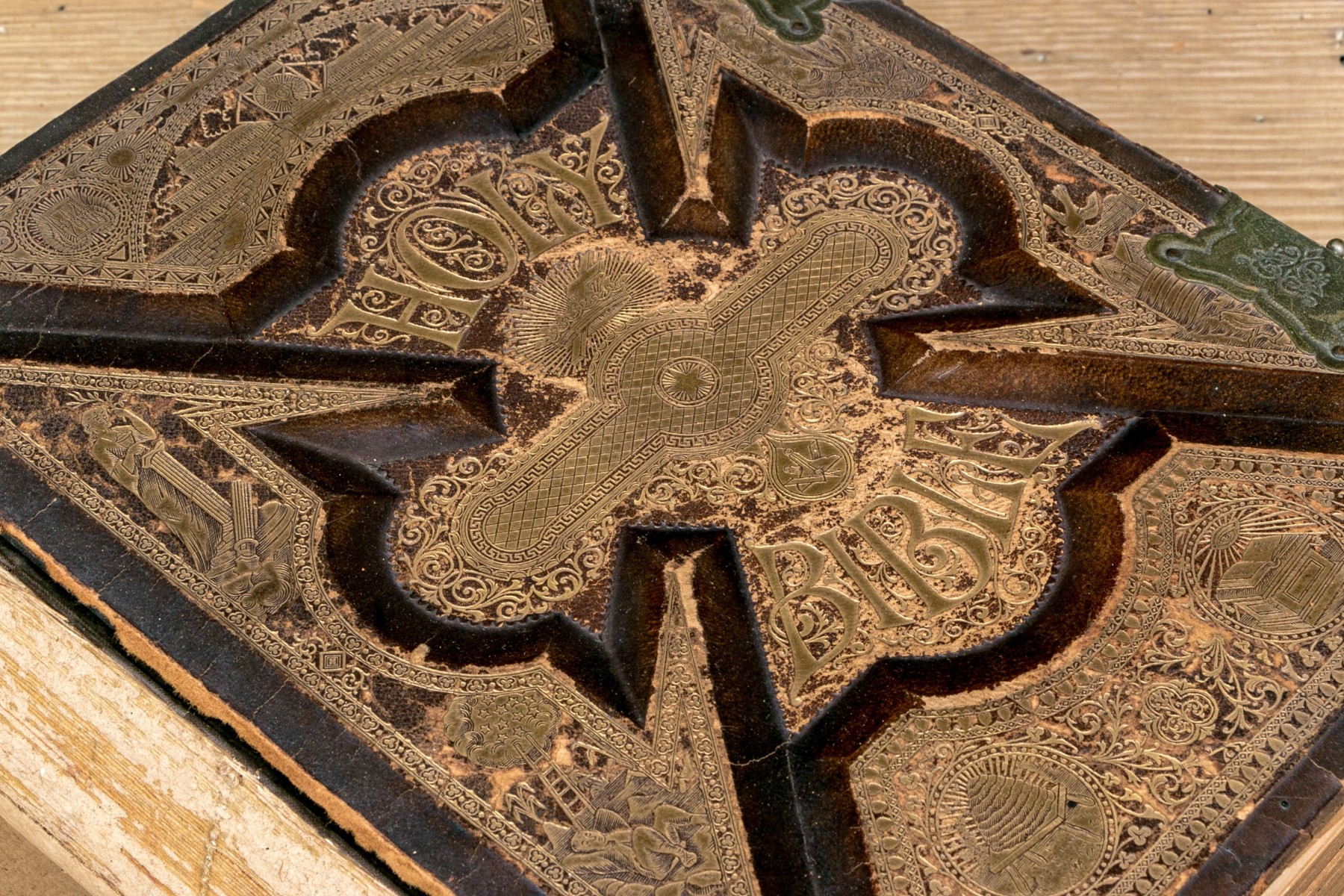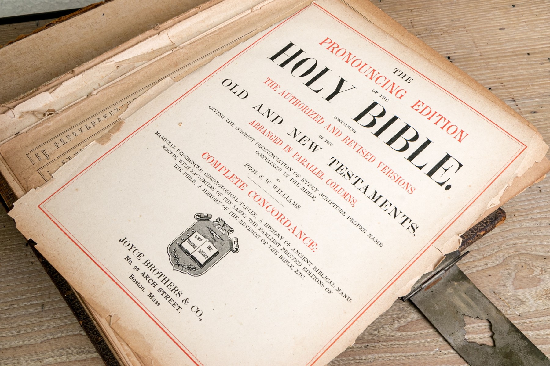 The Pronouncing Edition of the Holy Bible, Joyce Brothers & Co Massachusetts, Copyright 1890. Hardcover bound in leather with rich gilt detailing around a tooled cross at the center of the cover.