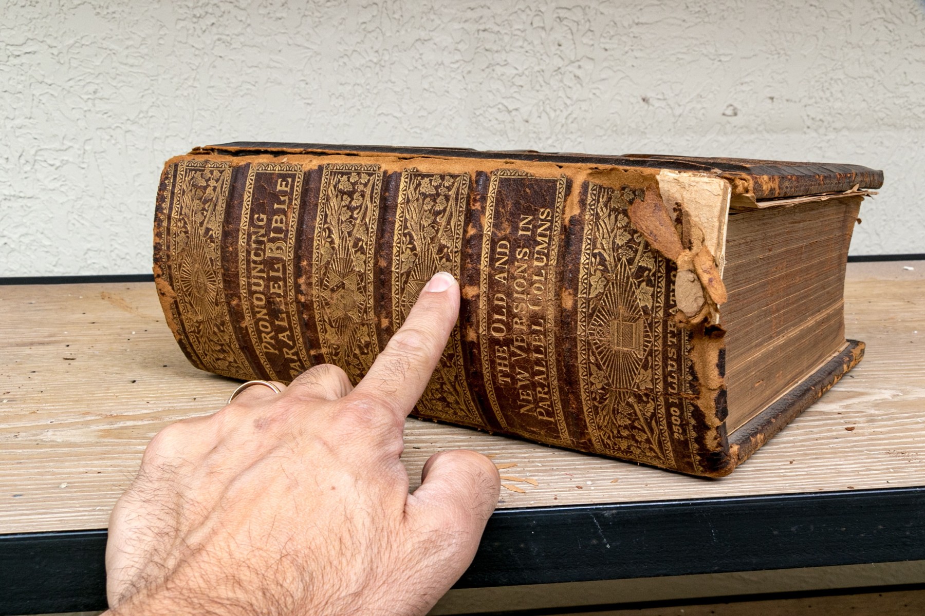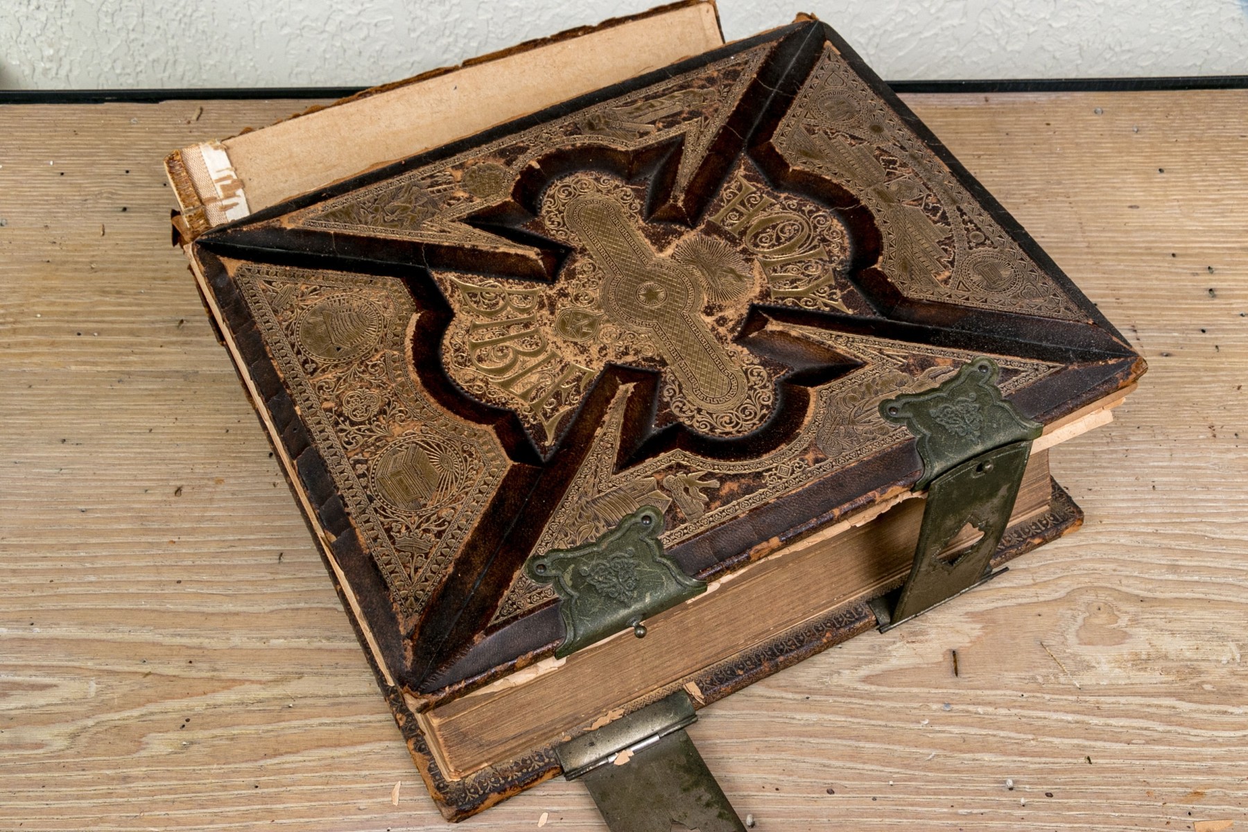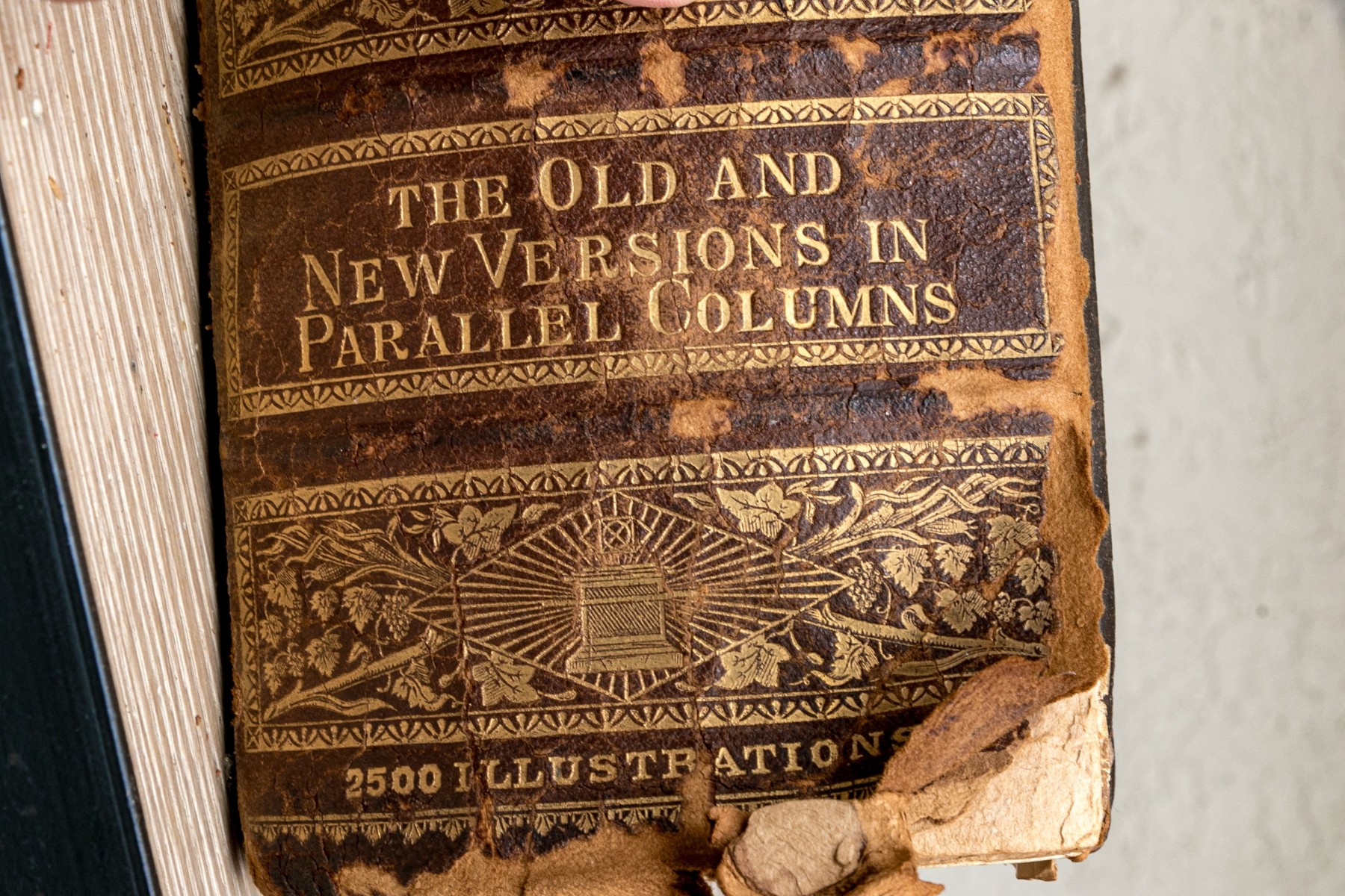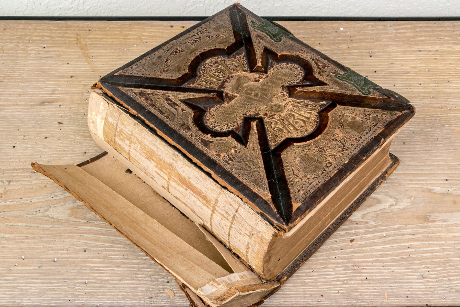 The Pronouncing Edition of the Holy Bible, Joyce Brothers & Co Massachusetts, Copyright 1890. Hardcover bound in leather with rich gilt detailing around a tooled cross at the center of the cover.