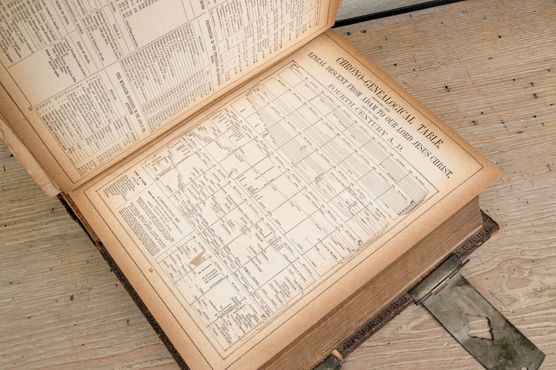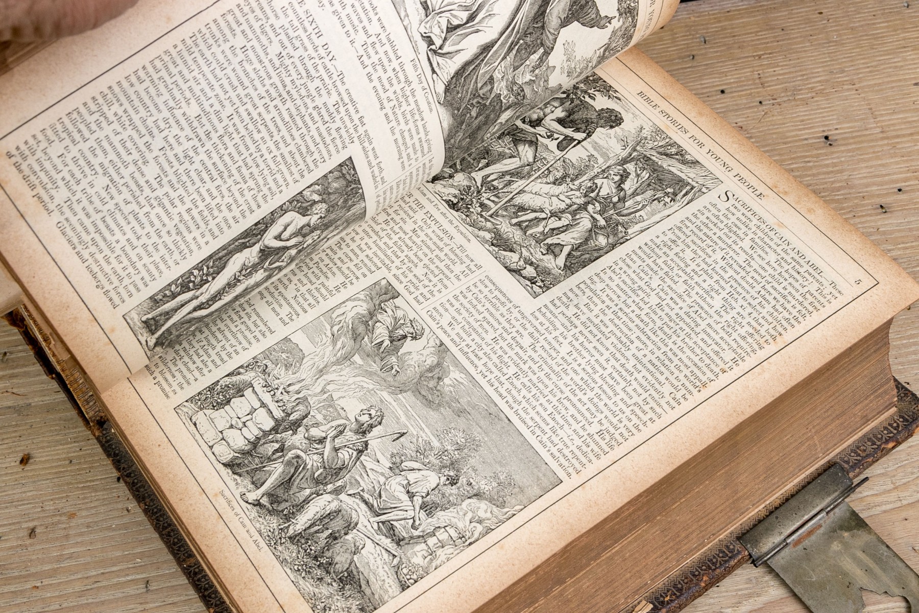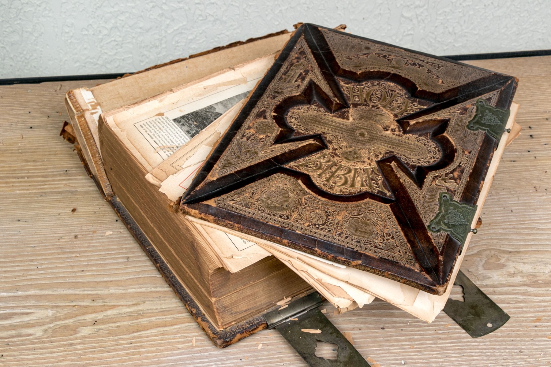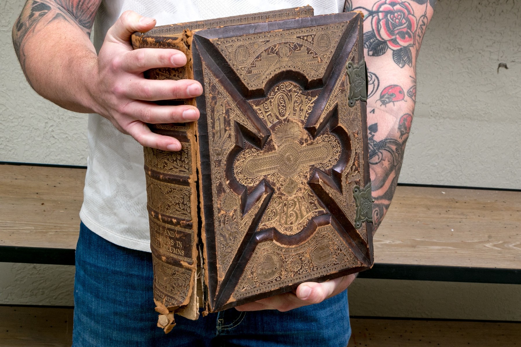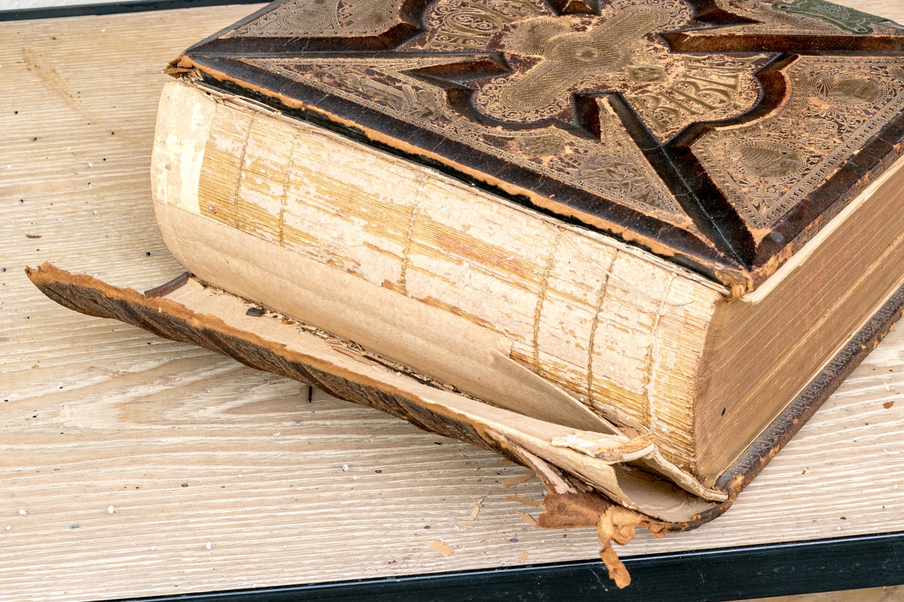 The Pronouncing Edition of the Holy Bible, Joyce Brothers & Co Massachusetts, Copyright 1890. Hardcover bound in leather with rich gilt detailing around a tooled cross at the center of the cover.