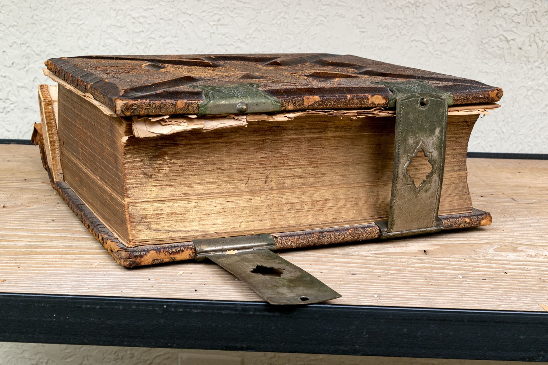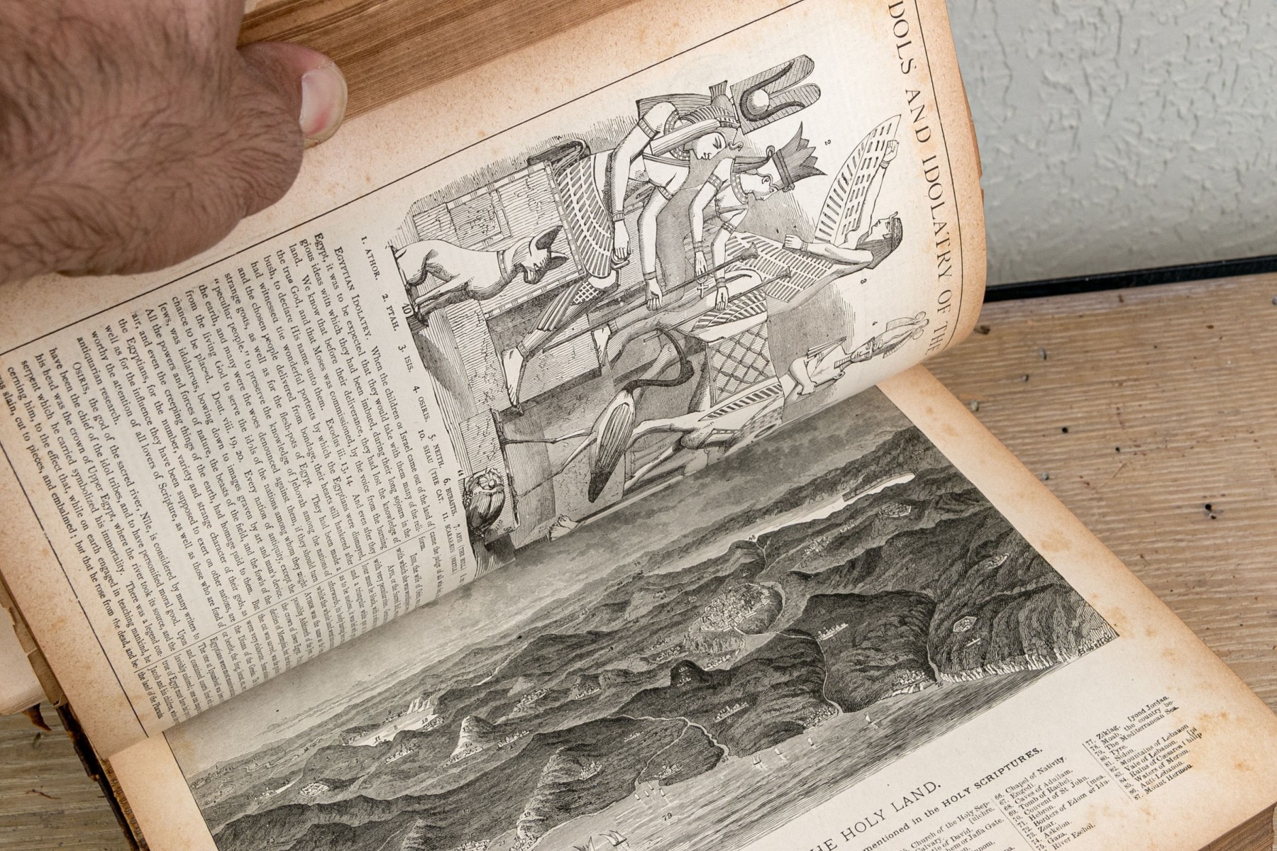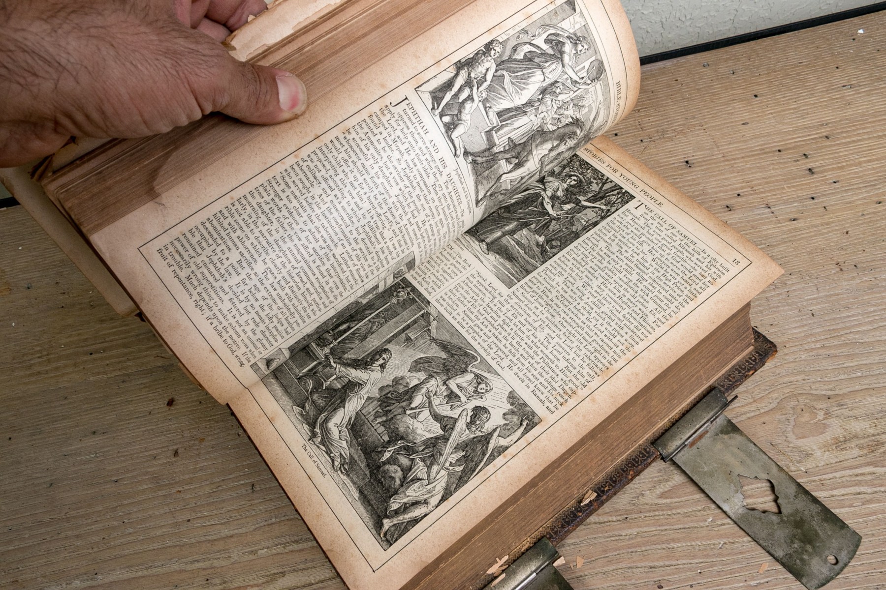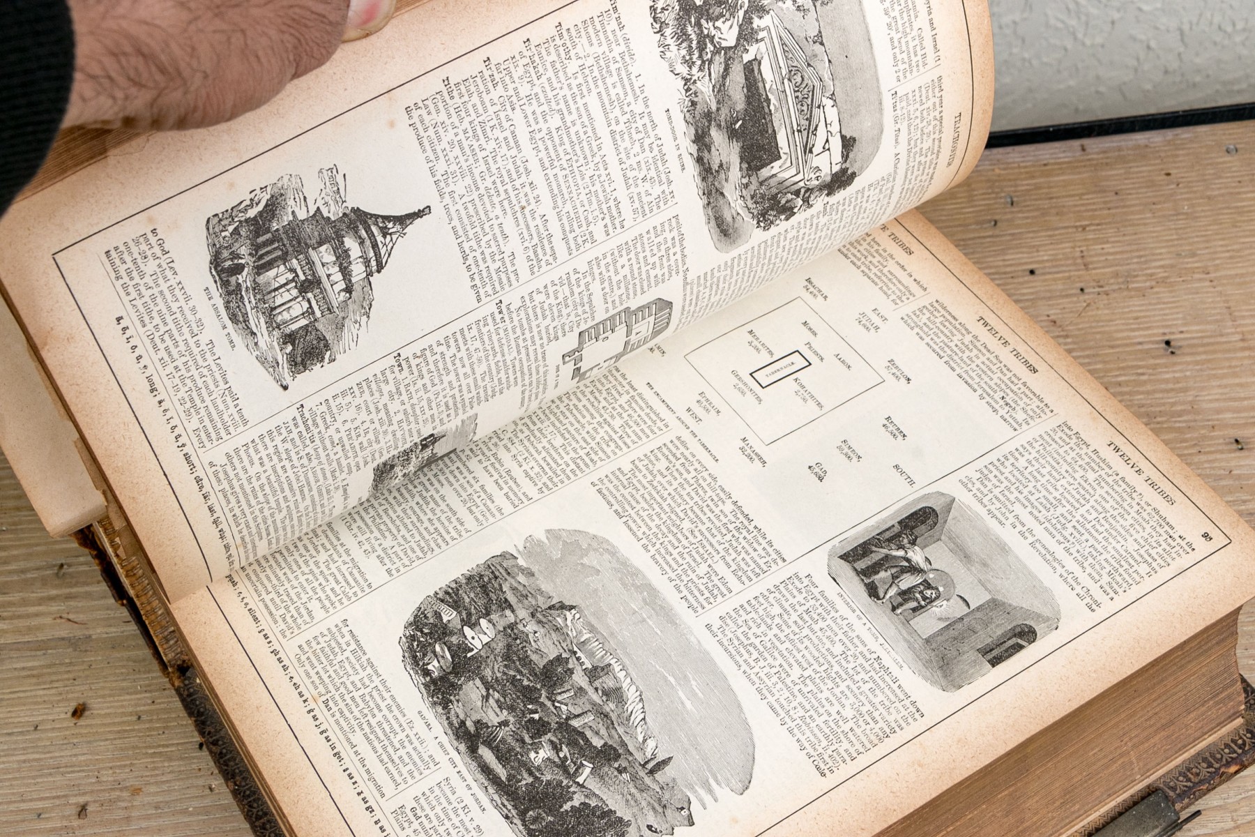 The Pronouncing Edition of the Holy Bible, Joyce Brothers & Co Massachusetts, Copyright 1890. Hardcover bound in leather with rich gilt detailing around a tooled cross at the center of the cover.