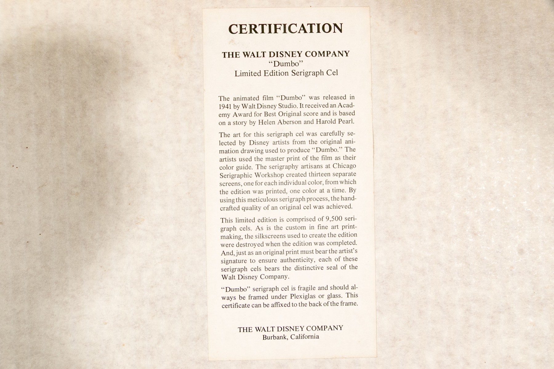 With Certification from the Walt Disney Company affixed on verso to frame.