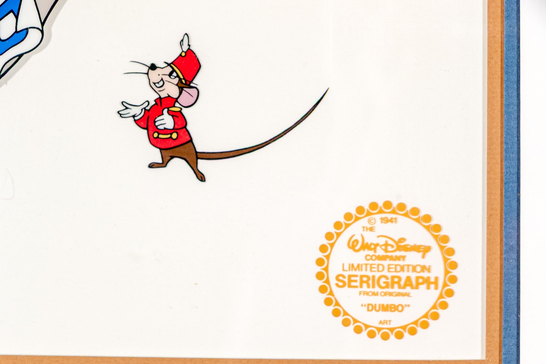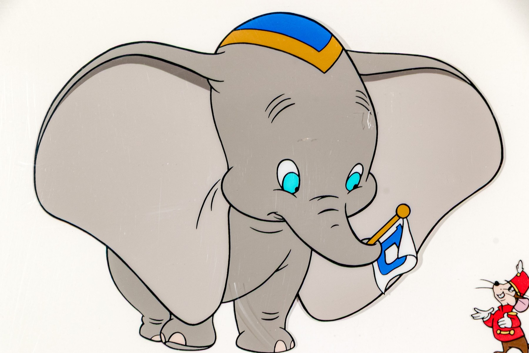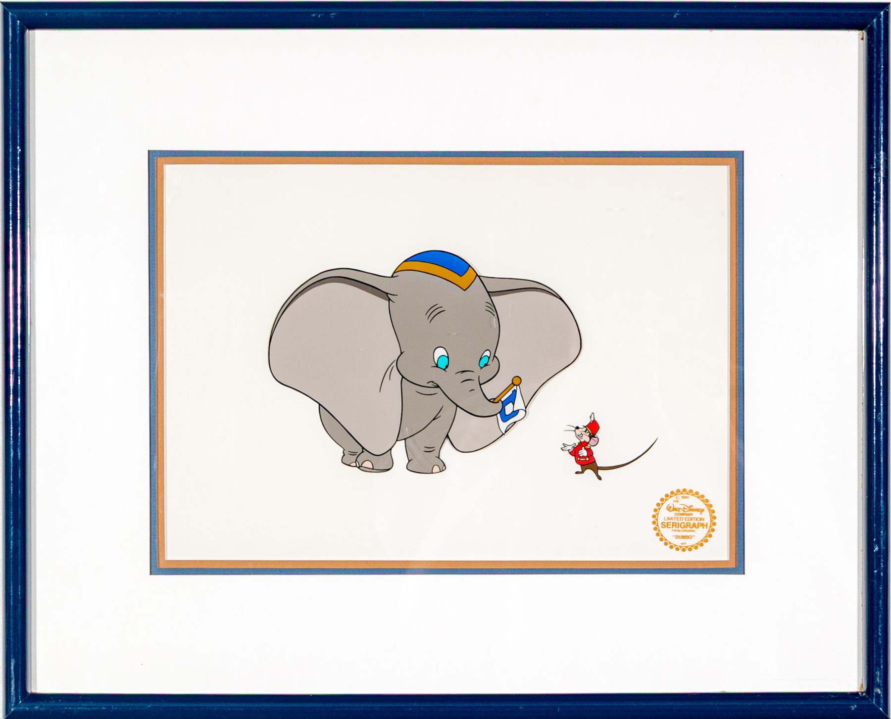 The adorable cel depicts Dumbo with Timothy Mouse against a neutral ground.