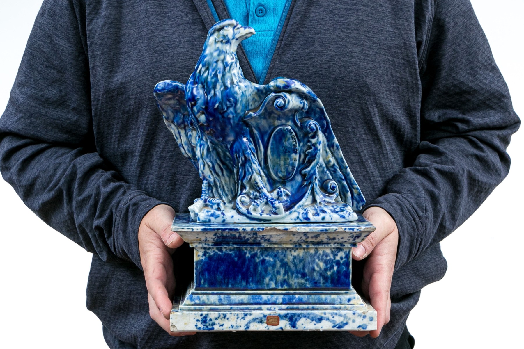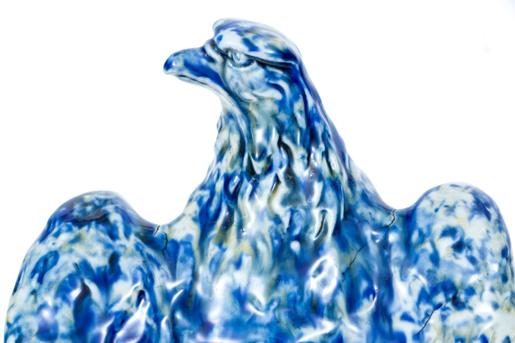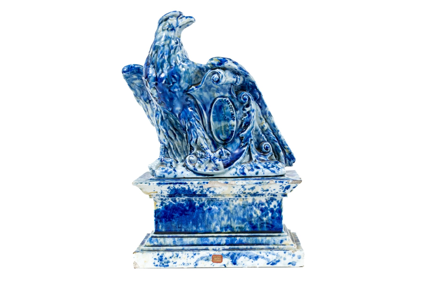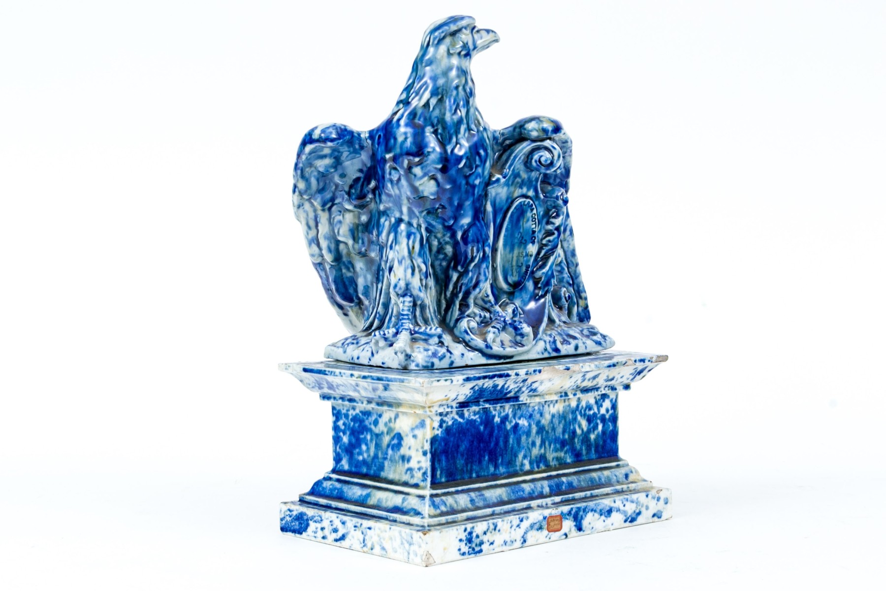 The Winkle Terra Cotta Co., St. Louis, Missouri ceramic figure of an eagle with a branded shield under its left wing, proudly perched on a rectangular pedestal. The eagle is removable, revealing a hollow interior perfect for storing trinkets or for use as a potpourri jar. Beautifully detailed in white with blue splatter glaze.